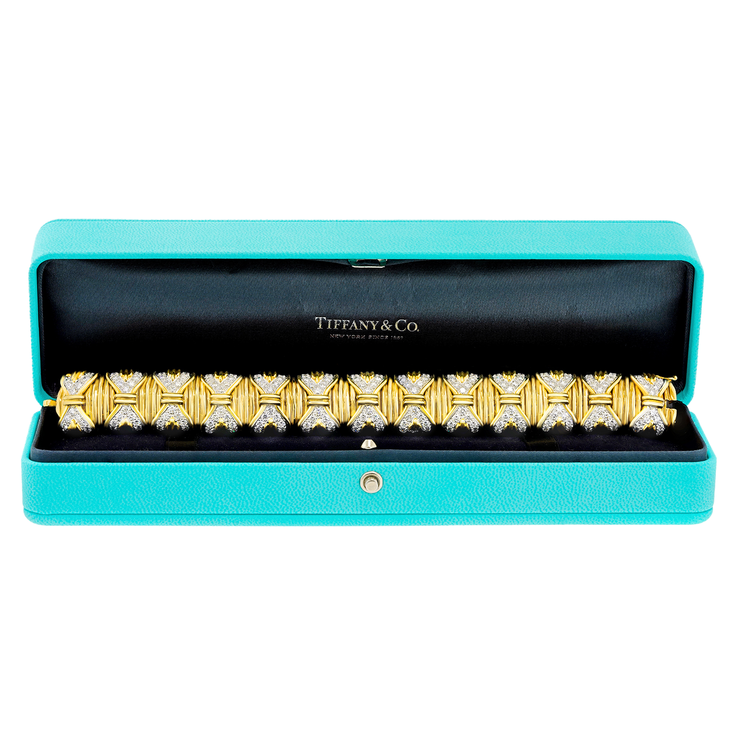 Circa 1960s, 18k, by Tiffany & Co., New York. This spectacular Tiffany bracelet is American girl glamour at its elegant best. Featuring an iconic ribbons and bows motif, the visual narrative is underscored by 10 carats of brilliant white diamonds (G color, VS clarity). Tiffany & Co. is renowned for stylish designs, superb quality, and meticulous fabrication. This sublime example of their work is in excellent condition.