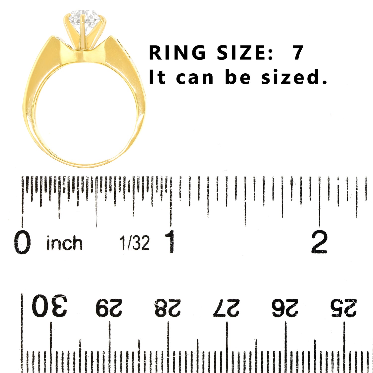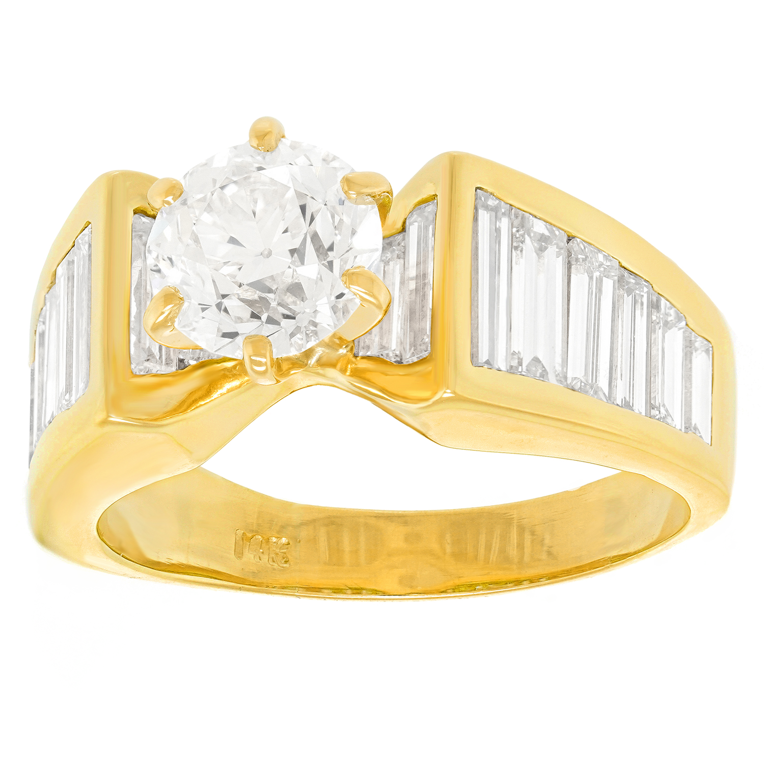 Circa 1960s, 14k, American. This sleek sixties engagement ring features a 1.27 carat I color, SI1 clarity diamond set into a contemporary yellow gold ring. Two carats of brilliant white baguettes (G color, VS clarity) complete this bold looking jewel. Finely fabricated, I love how sixties fashion combined traditional values with new exciting ideas! Excellent condition.