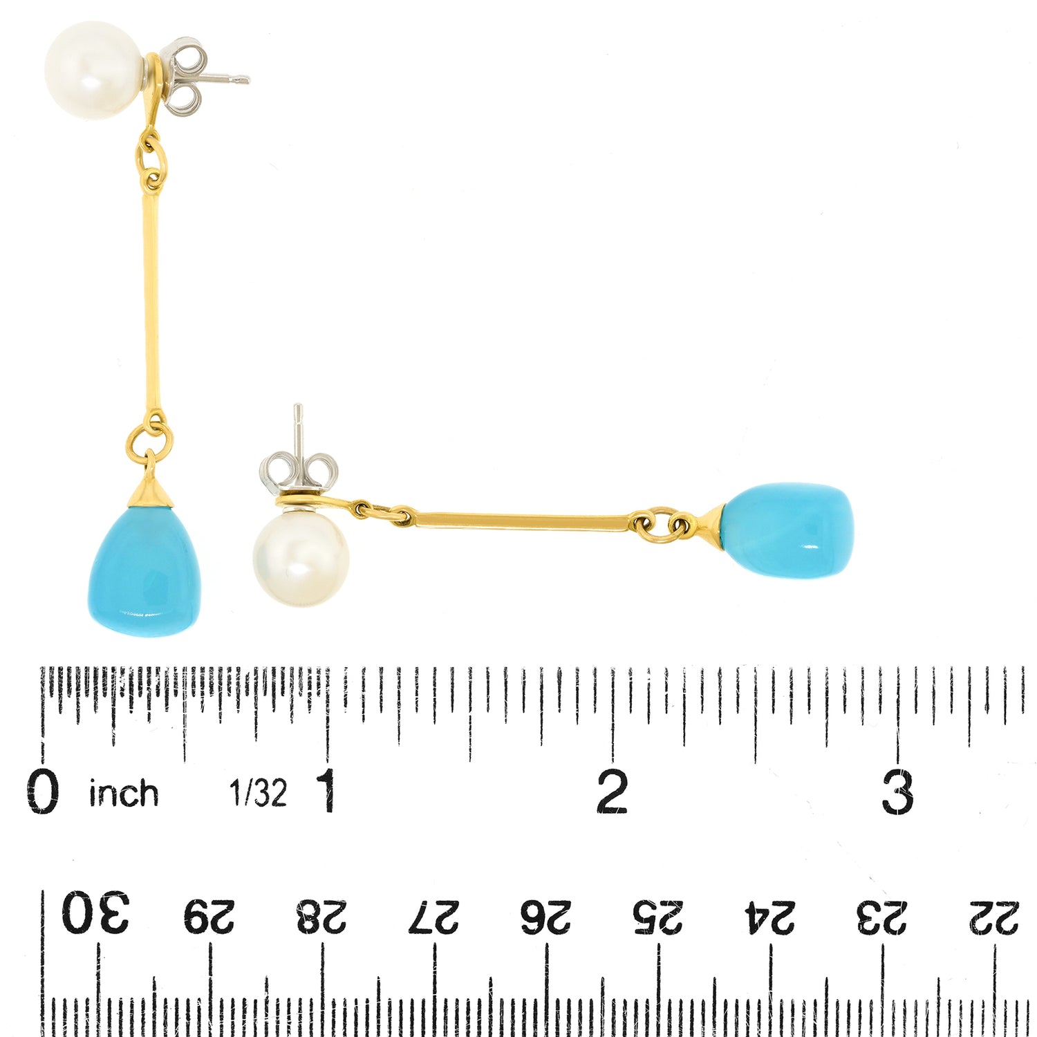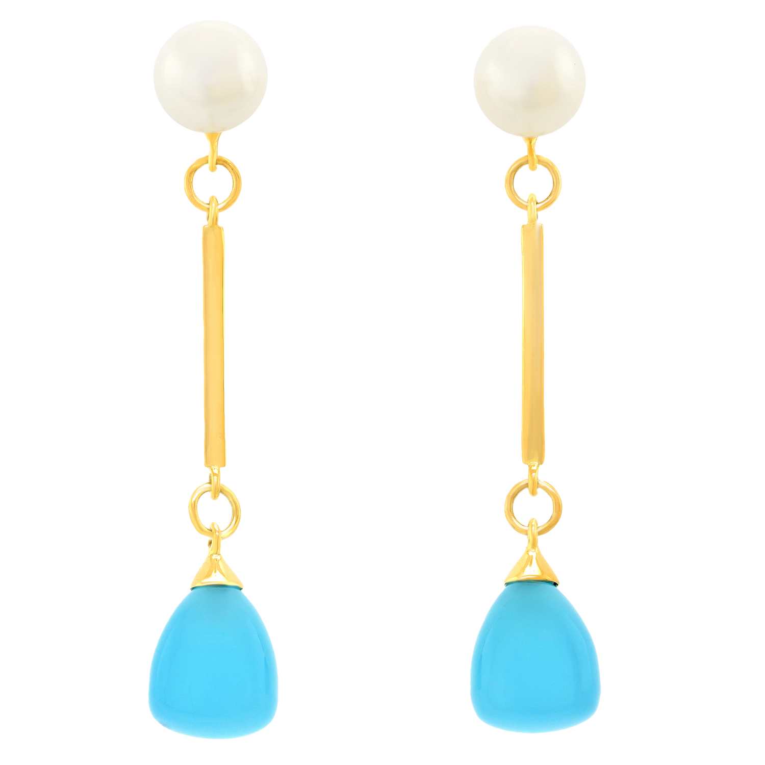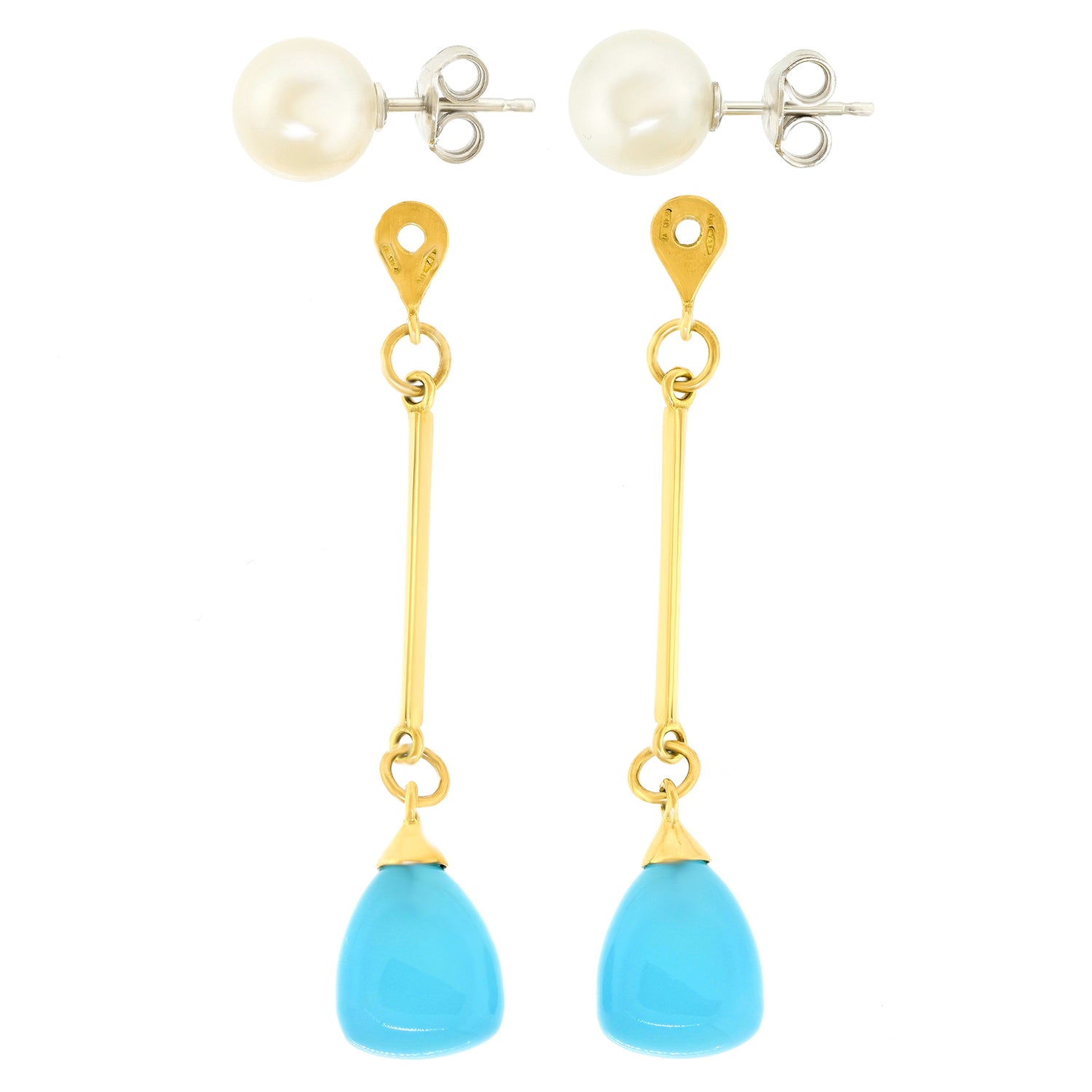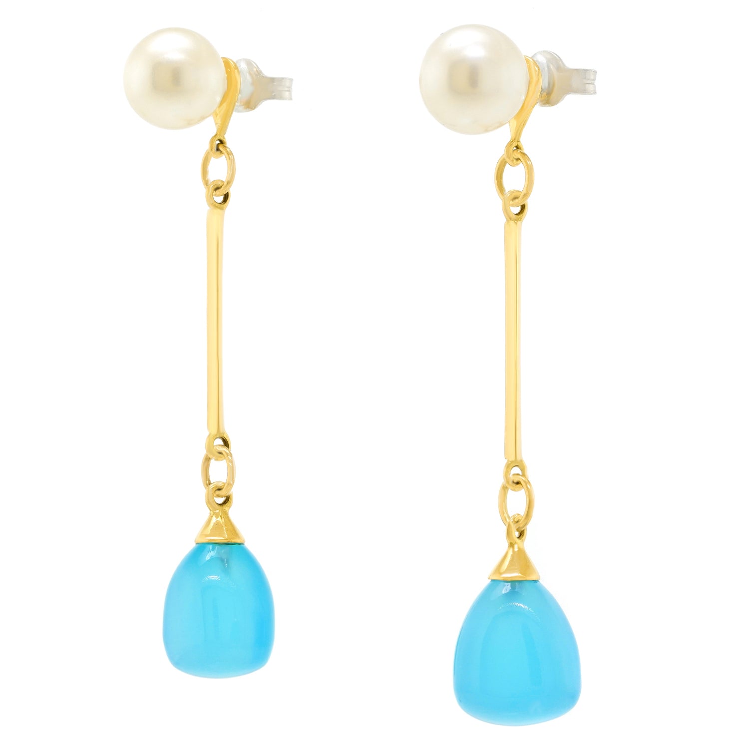 Circa 2000s, 18k, by Mimi Milano, Italy. These playful earrings feature lustrous white pearls and lush blue chalcedony. Rife with playful movement, they can also be worn as pearl studs, adding to their versatility. The look is beachy casual for everywhere but the beach! Meticulously made and in excellent condition.