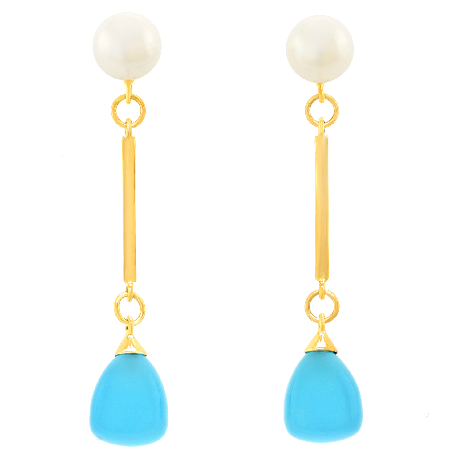 Circa 2000s, 18k, by Mimi Milano, Italy. These playful earrings feature lustrous white pearls and lush blue chalcedony. Rife with playful movement, they can also be worn as pearl studs, adding to their versatility. The look is beachy casual for everywhere but the beach! Meticulously made and in excellent condition.