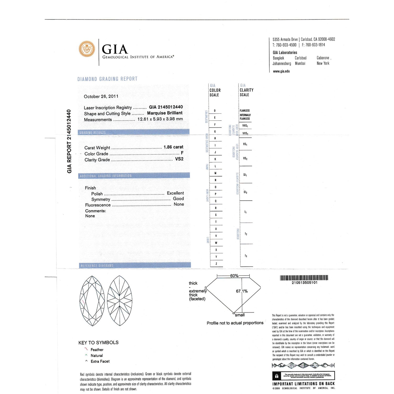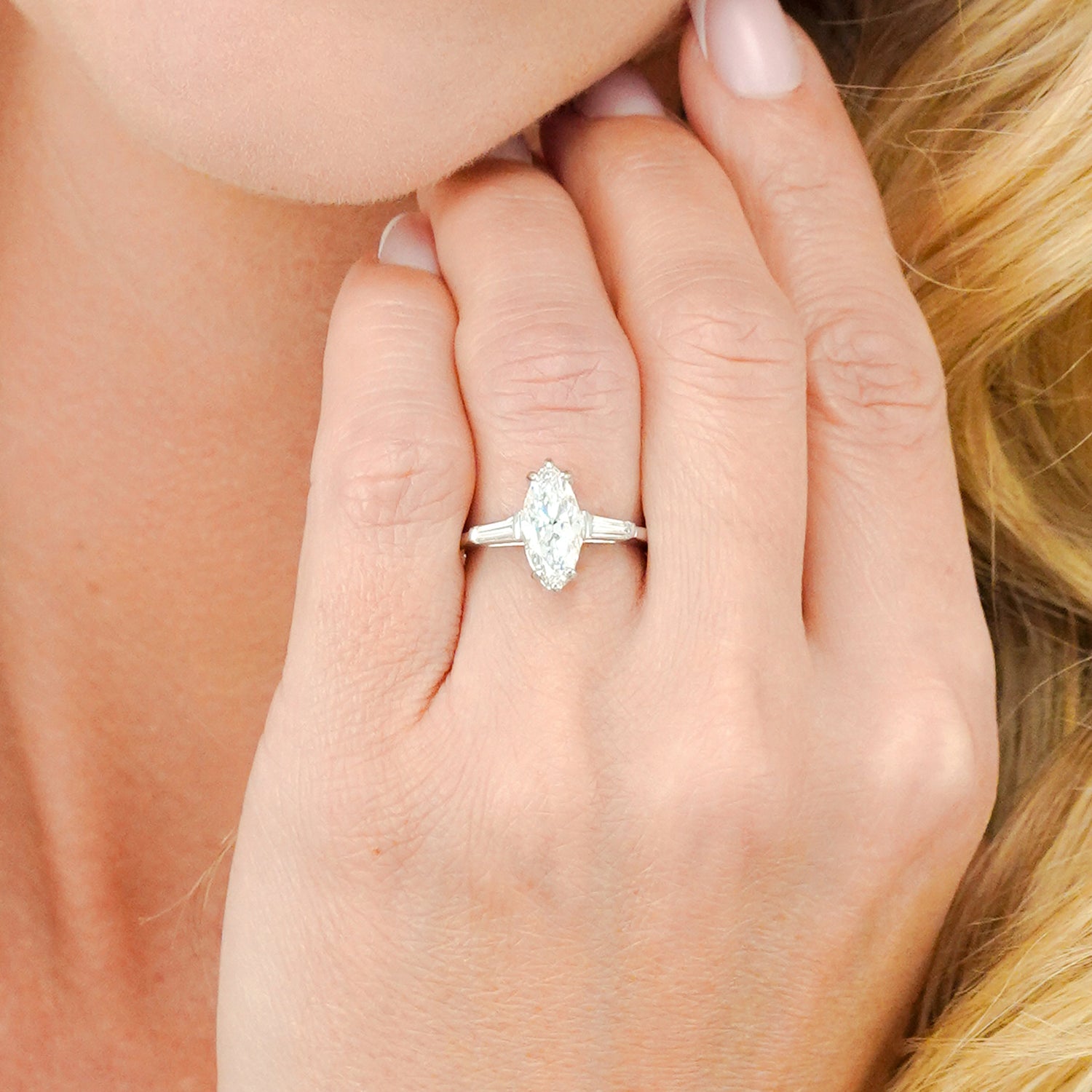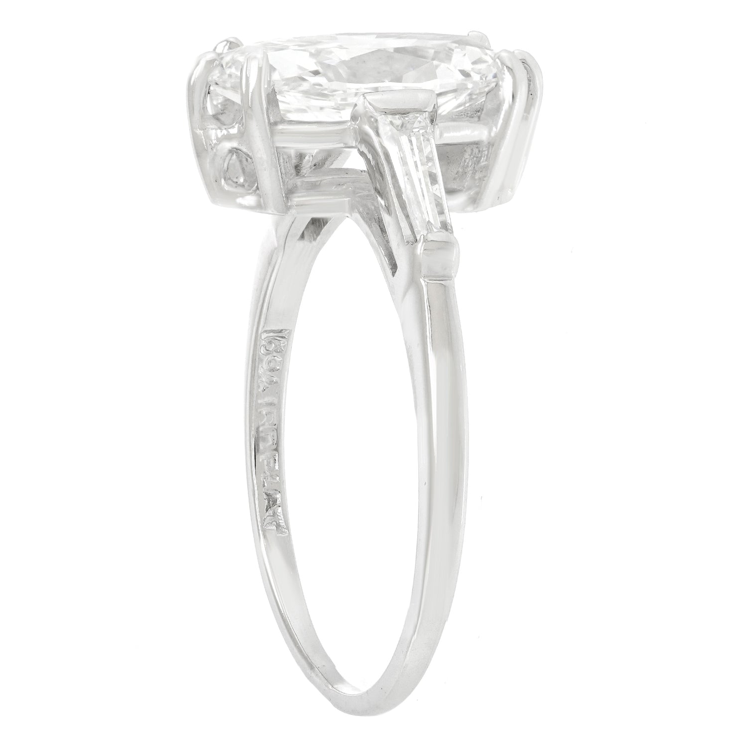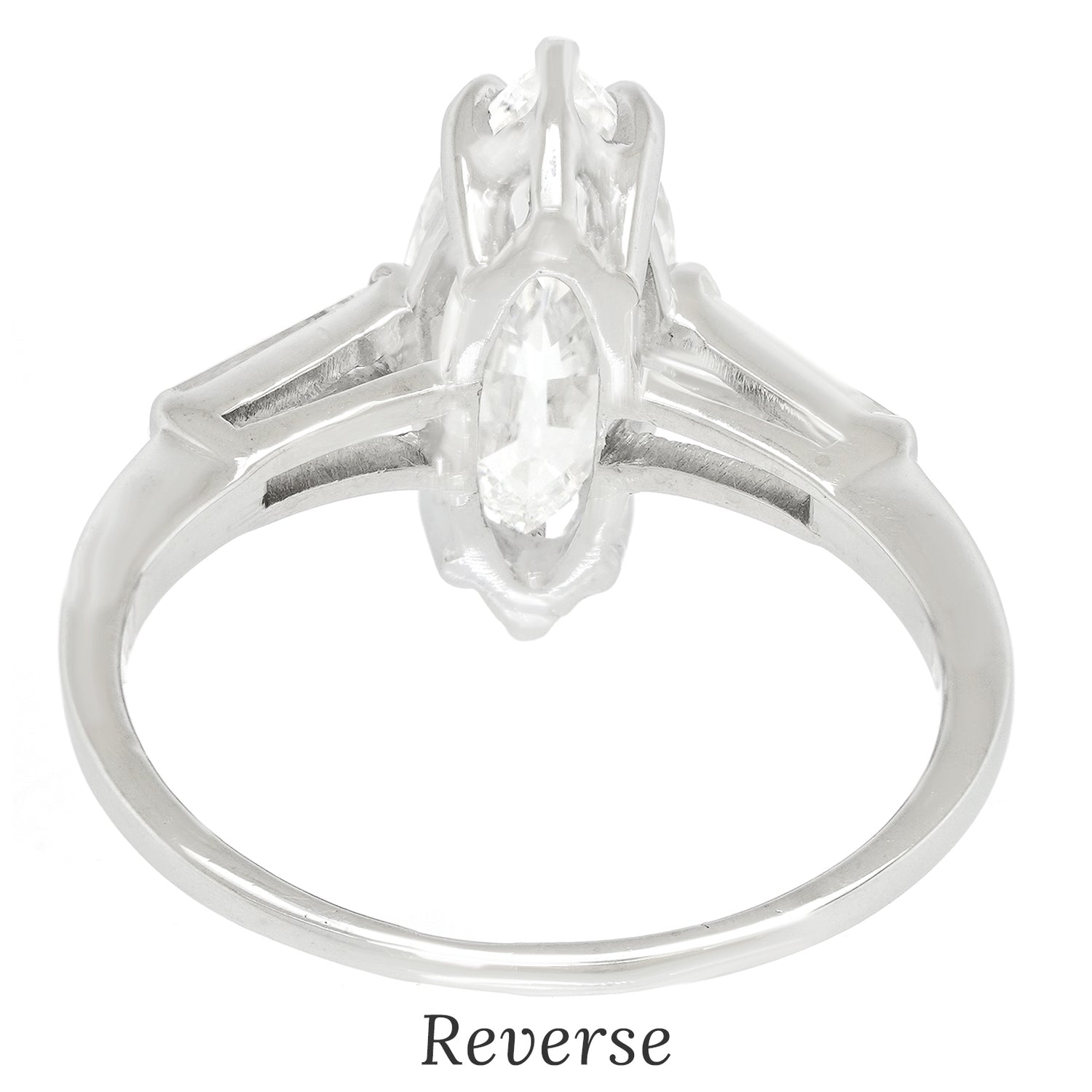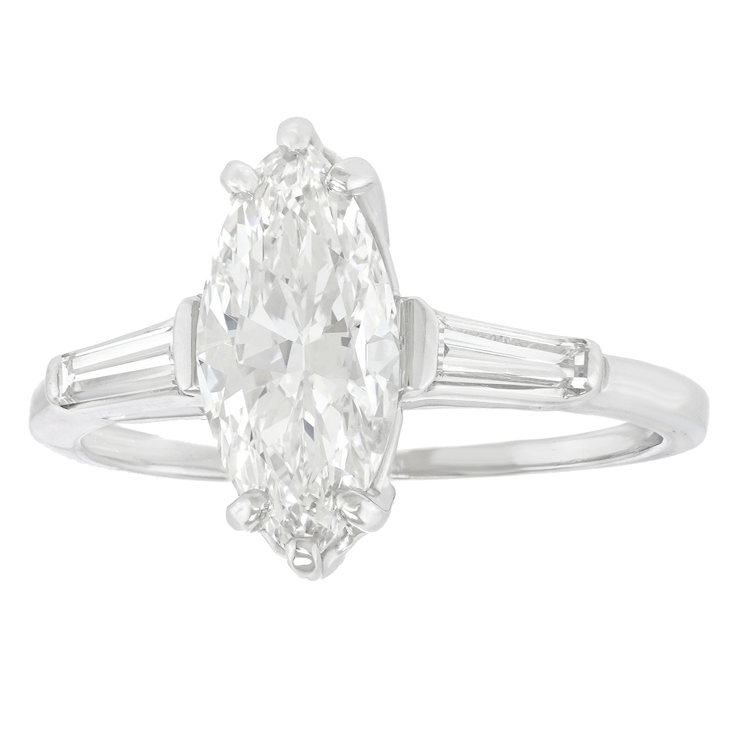 Circa 1960s, Platinum, American. This gorgeous platinum engagement ring is set with a brilliant white 1.86 carat marquise-shaped diamond (F color, VS2 clarity, GIA report). Classically styled, this ring also features two baguette diamonds totaling .20 carats. Well made, it is in excellent condition.