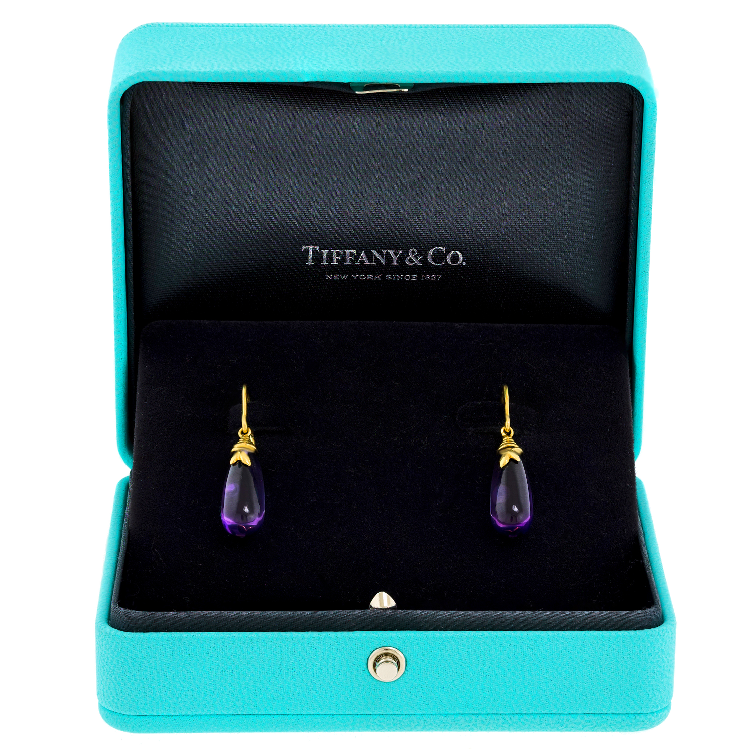 Circa 2000s, 18k, by Paloma Picasso for Tiffany & Co., American. These Paloma Picasso earrings are part of her Olive Leaf collection and feature rich amethyst drops. Playful movement and quality construction complete the look. Excellent condition.