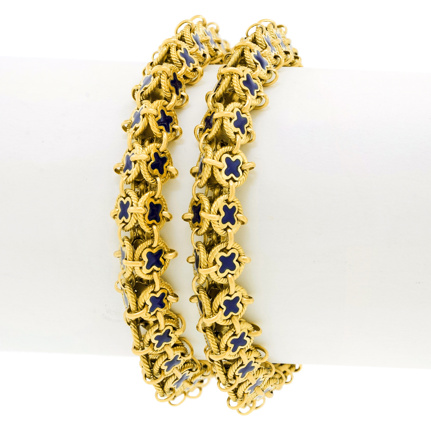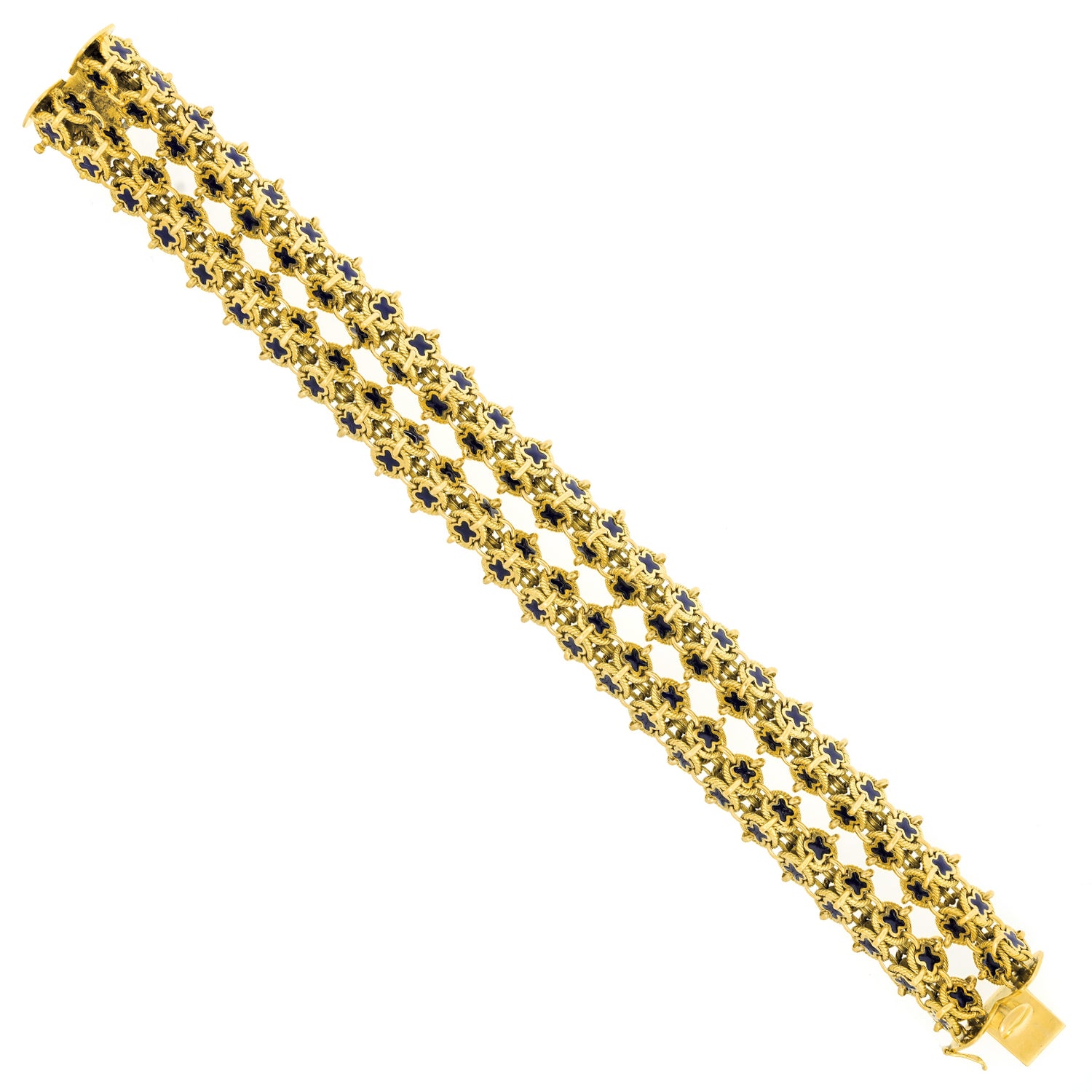 Circa 1960s, 18k, by Massoni, Roma, Italy. Since the 1790s, eight generations of the Massoni family have created legendary jewelry. This spectacular bracelet is iconic Italian sixties cool at its fine jewelry best. Wonderfully ornate with two joined bracelets, each link features blue enameled quatrefoil motifs. When I look at this bracelet, I see the history of Rome, a passion for beauty, a standard of excellence …a way of life. Excellent condition.