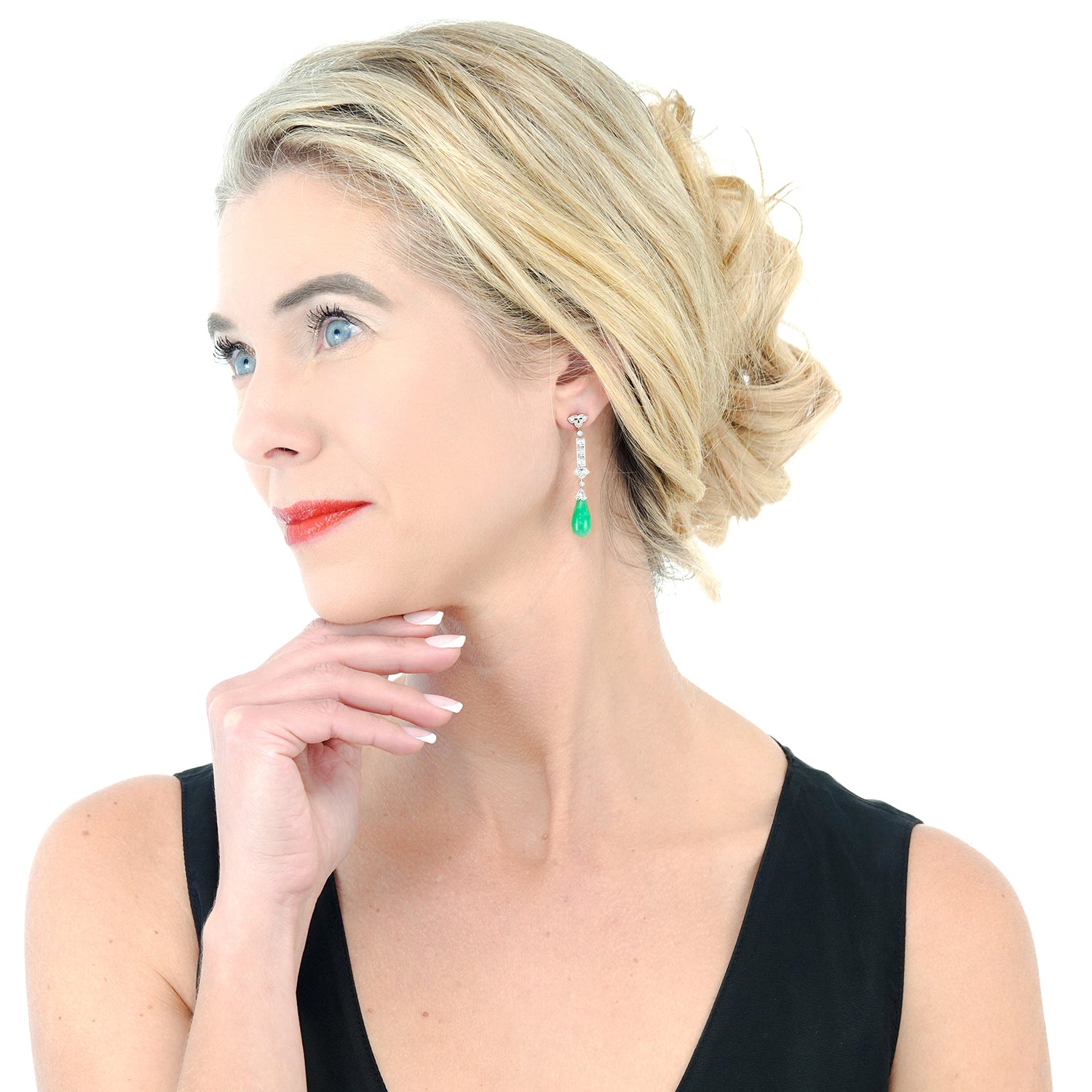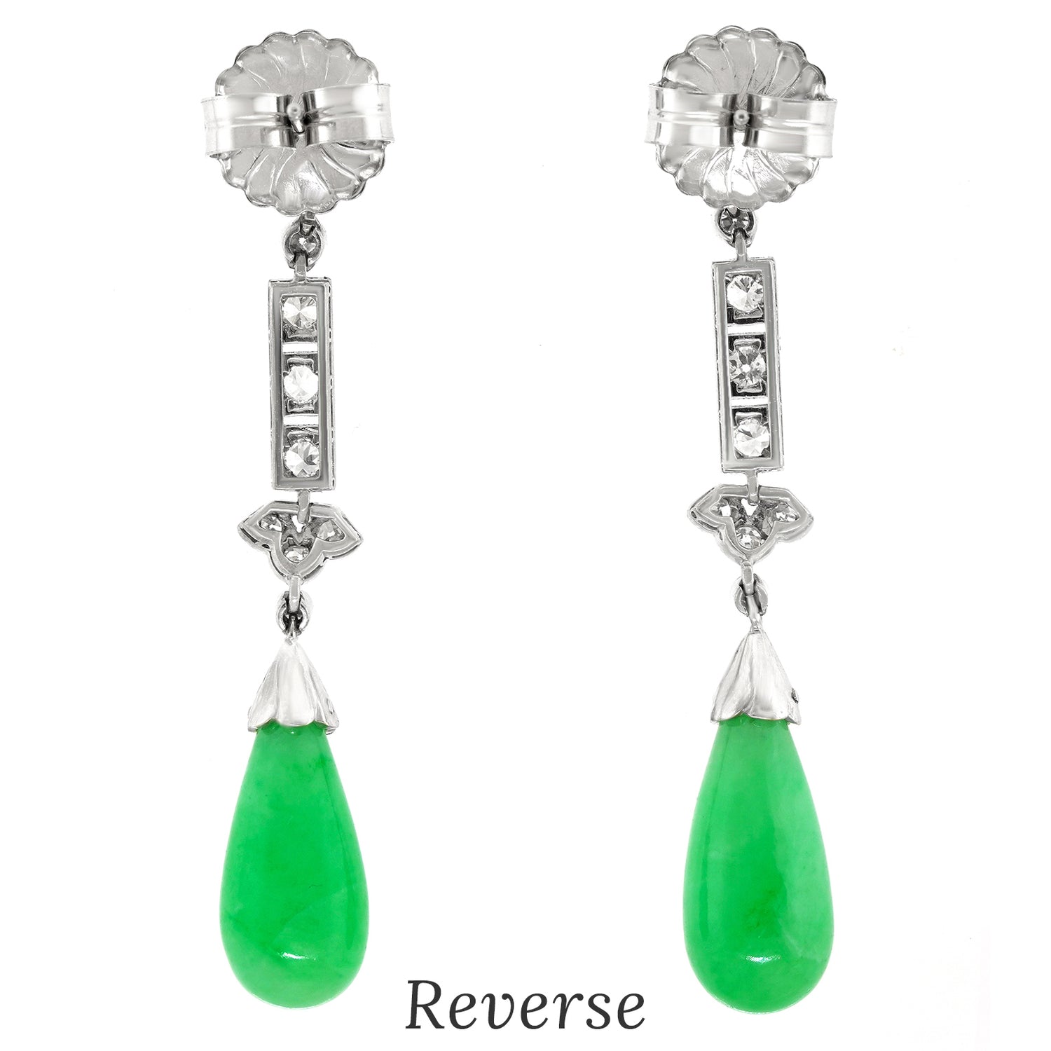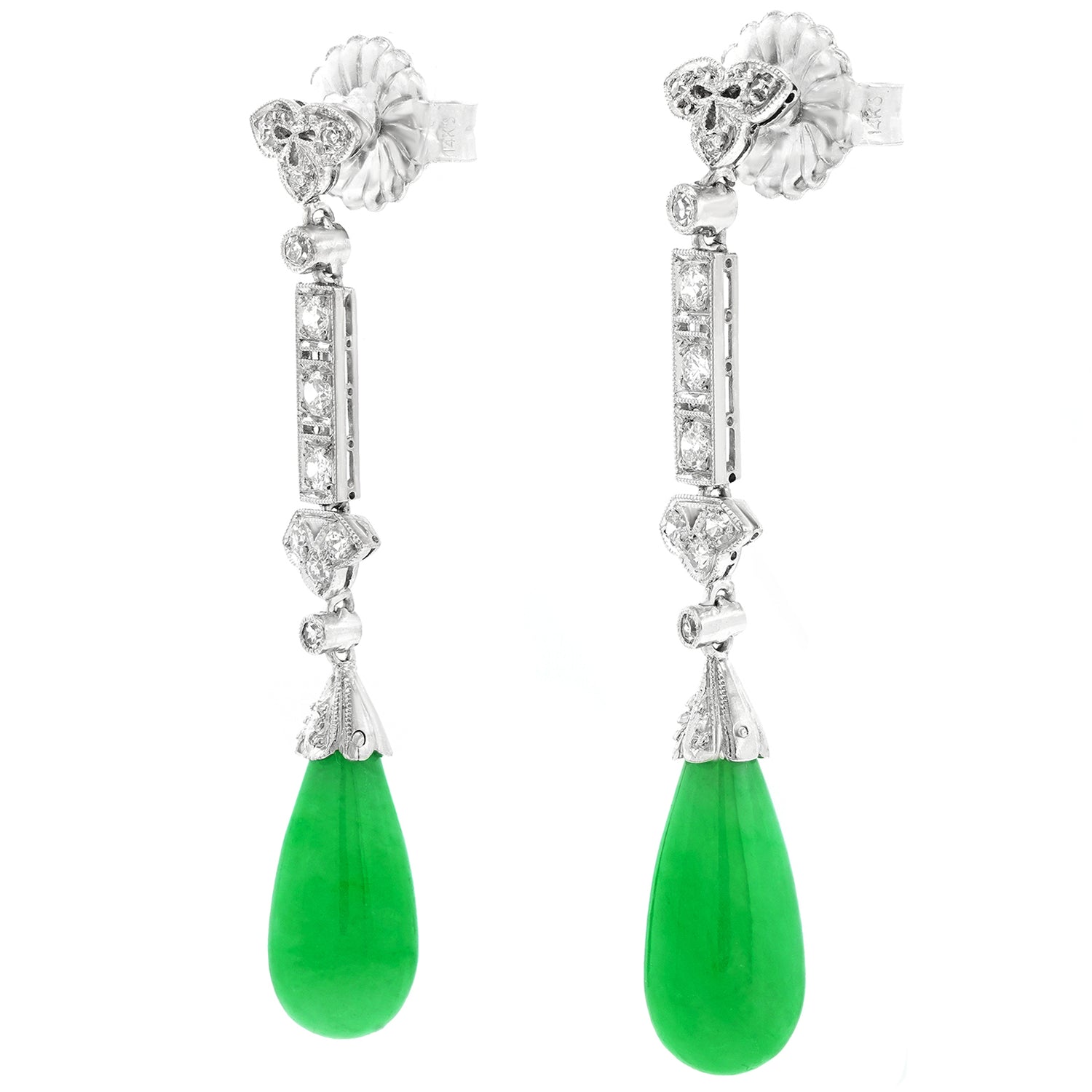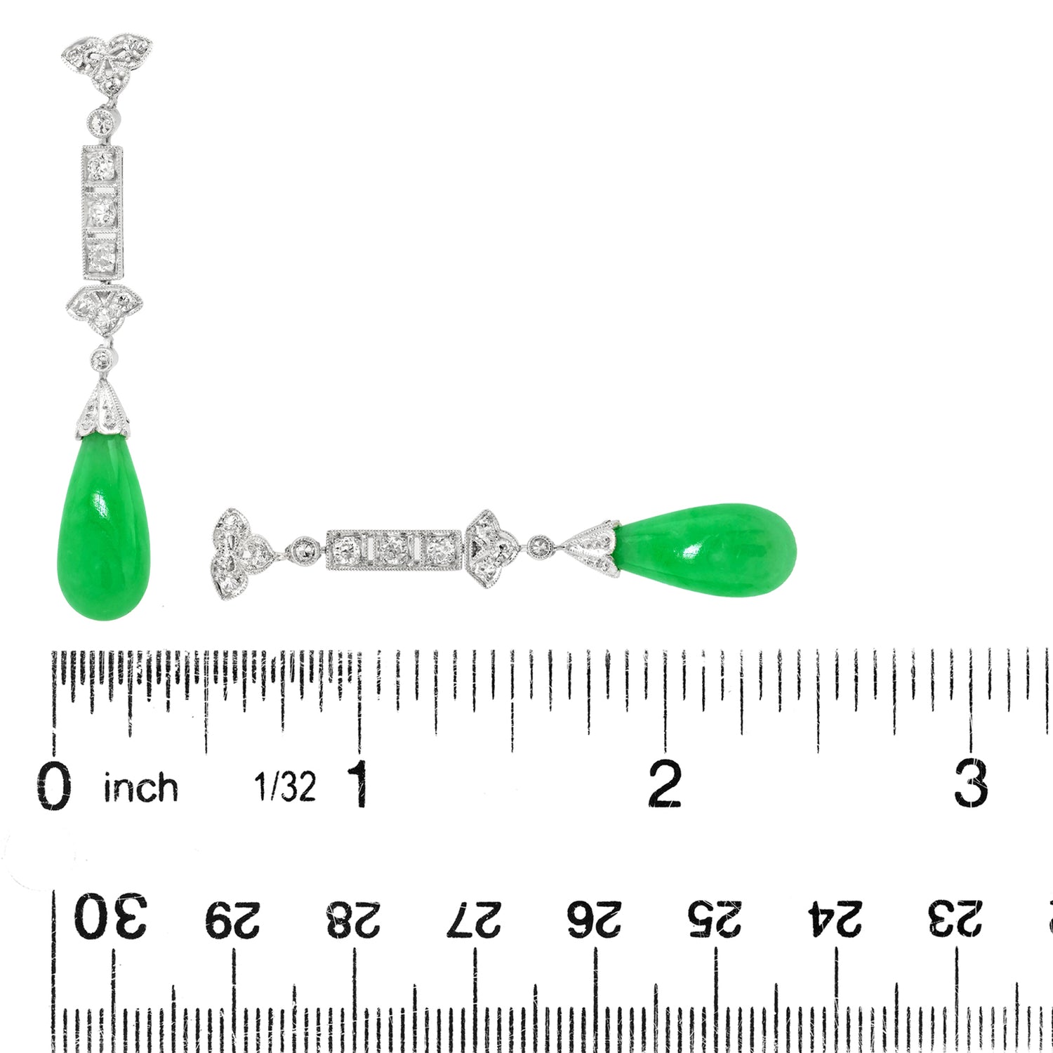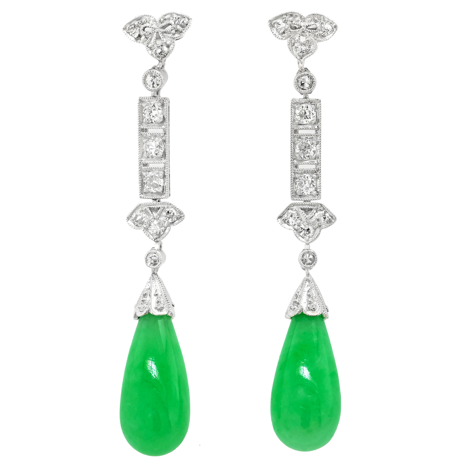 Circa 1920s, Platinum, American. Beautifully styled, these Period Art Deco chandelier earrings feature stunning apple green jade and .50 carats of brilliant white diamonds (H color, SI1 clarity). At almost two inches long, they are the perfect earring for any fashionable moment.  Meticulously hand-fabricated in platinum, they are in excellent condition.