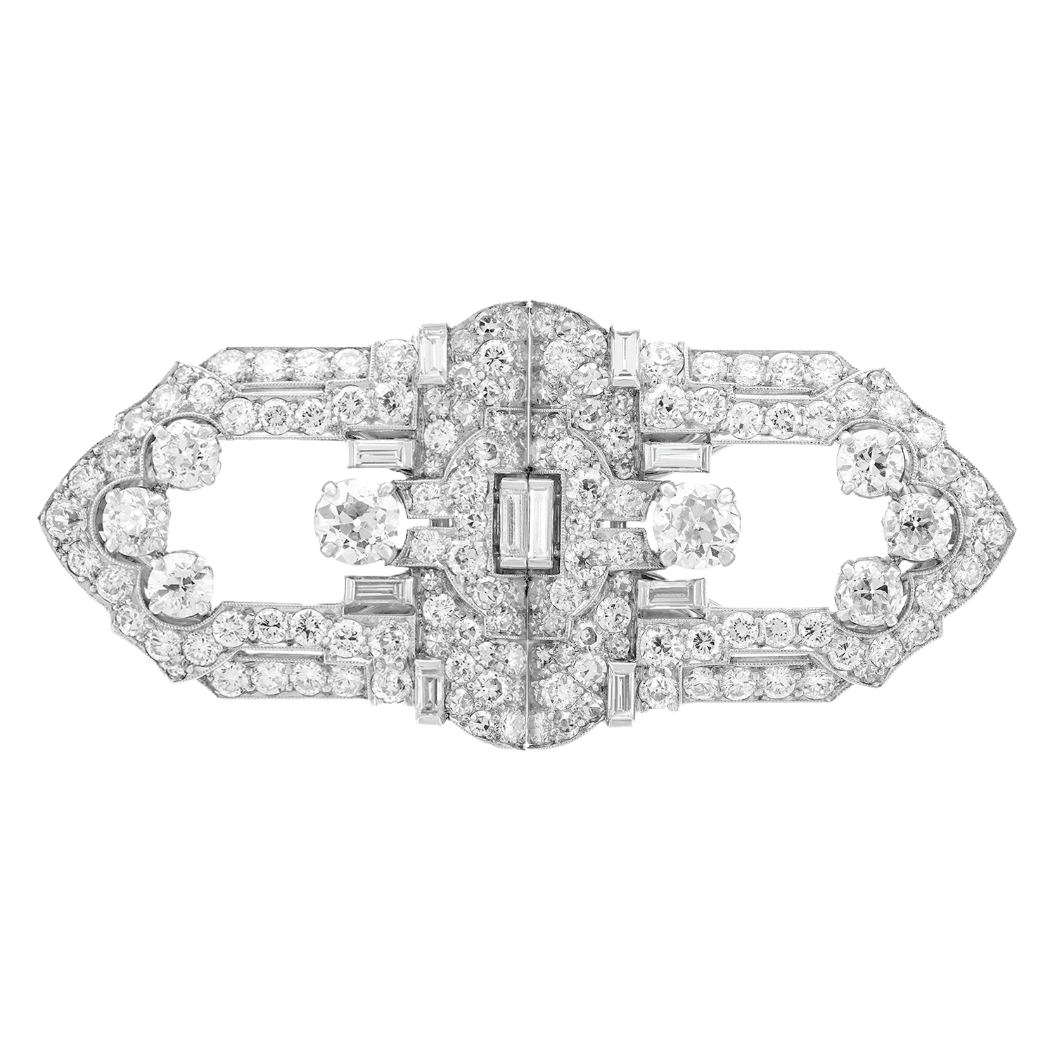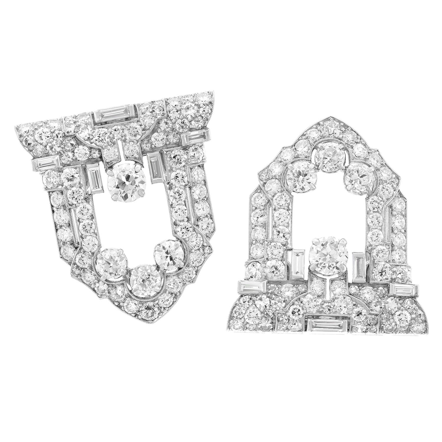 Circa 1930s, Platinum with 14k findings, by Raymond C. Yard, New York City. From one of the great early twentieth-century New York makers, these double-clip Art Deco brooches are quintessential Yard. Set with 8.0 carats of fine white diamonds (G-H color and VS clarity), this spectacularly well-designed Deco brooch is perfect for any moment of fashion, or consider his and hers! Excellent condition.