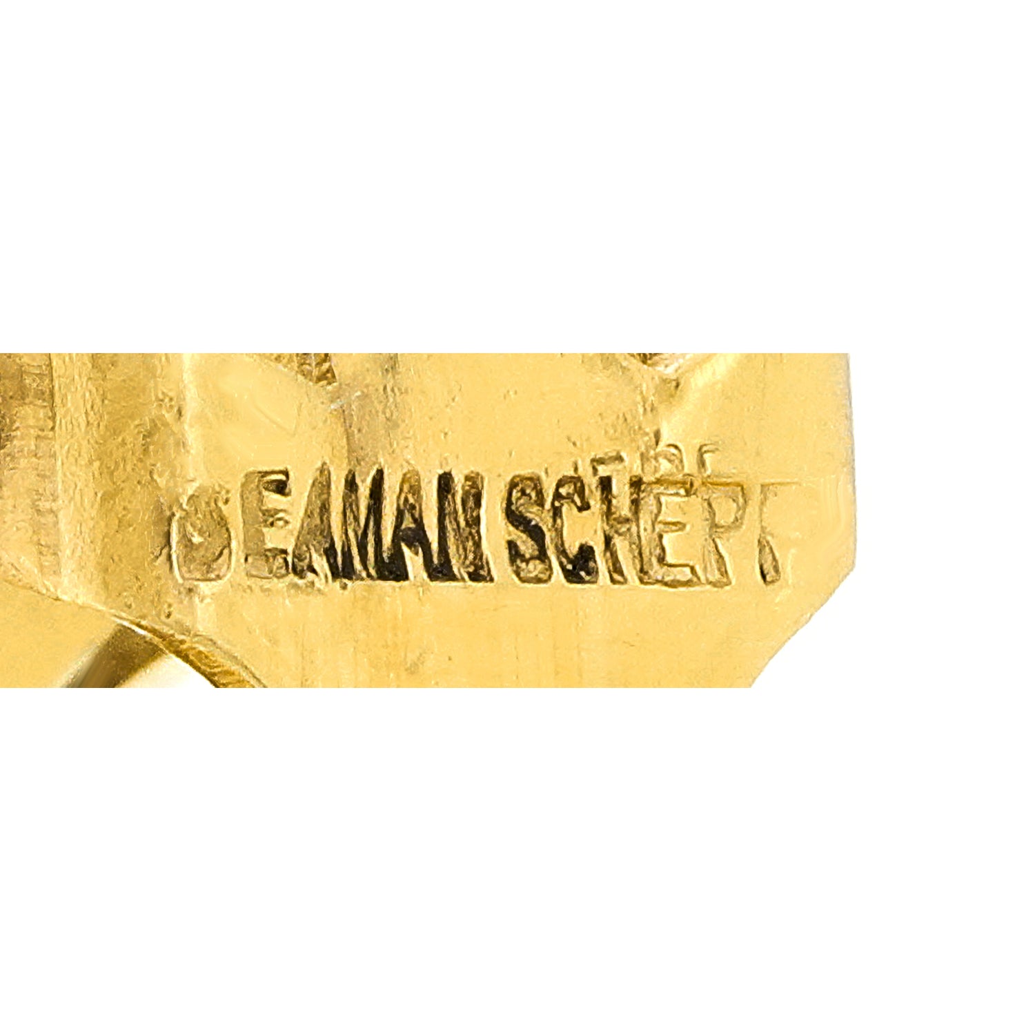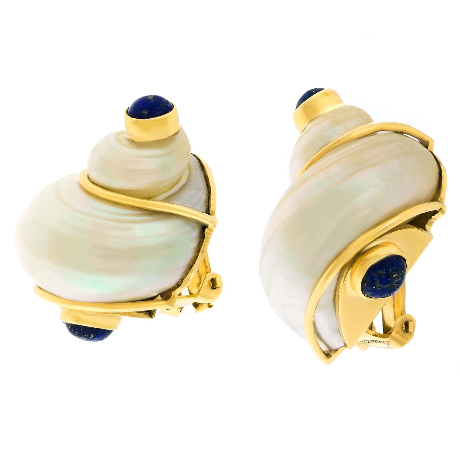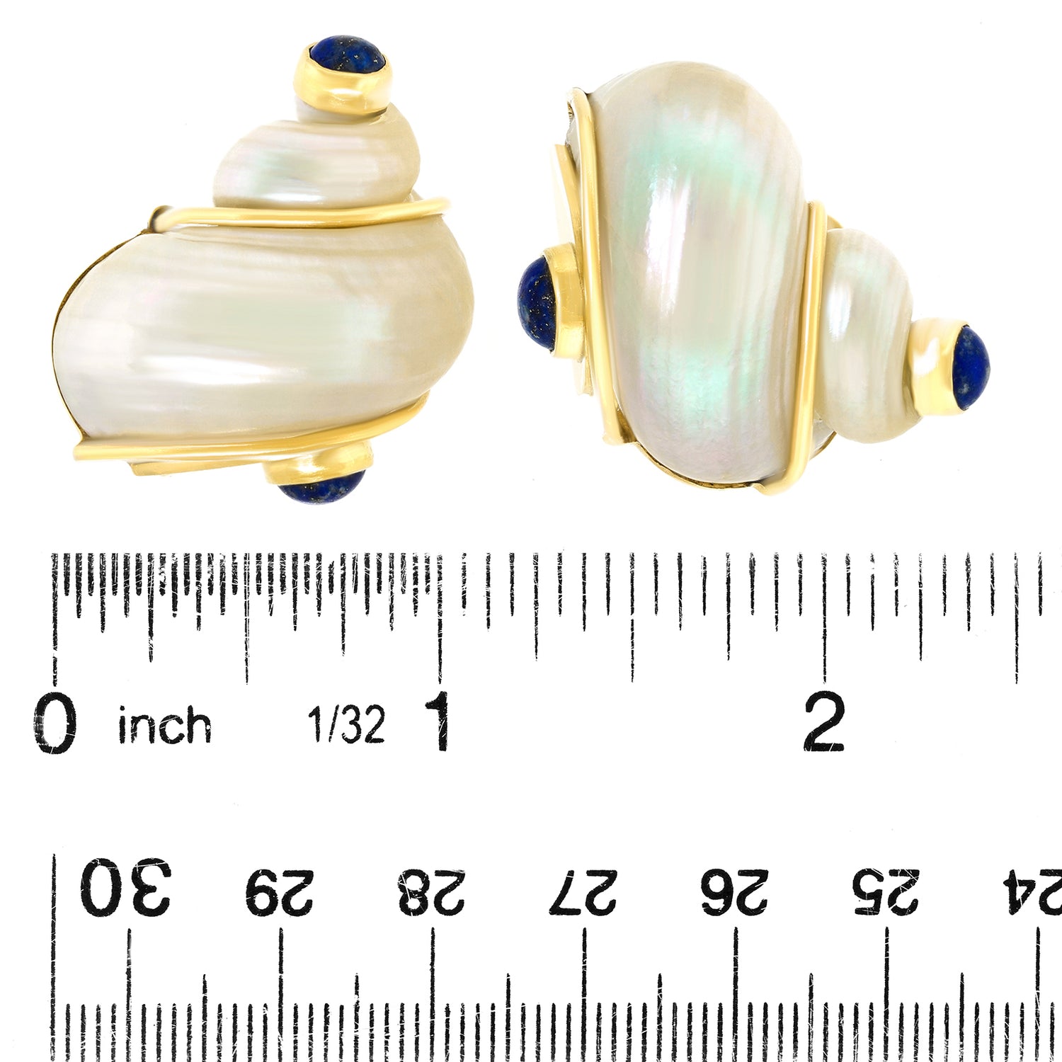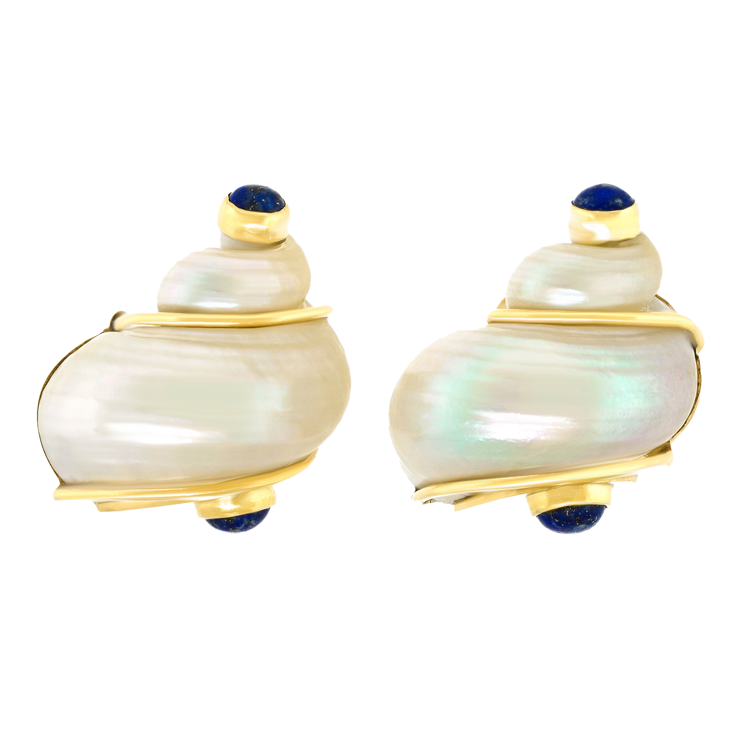 Circa 1970s, 14k, by Seaman Schepps, marked for Patricia Schepps Vaill, American. Palm Beach, Nantucket classics, often copied but never replicated, these earrings feature polished Turbot shells framed with gold and lapis. The look is Iconic posh. Excellent condition.