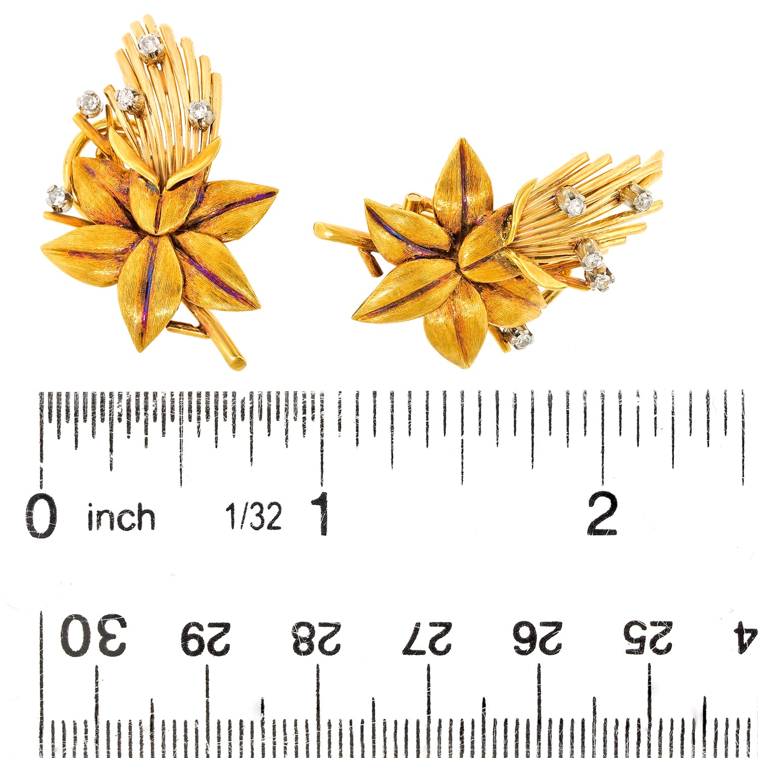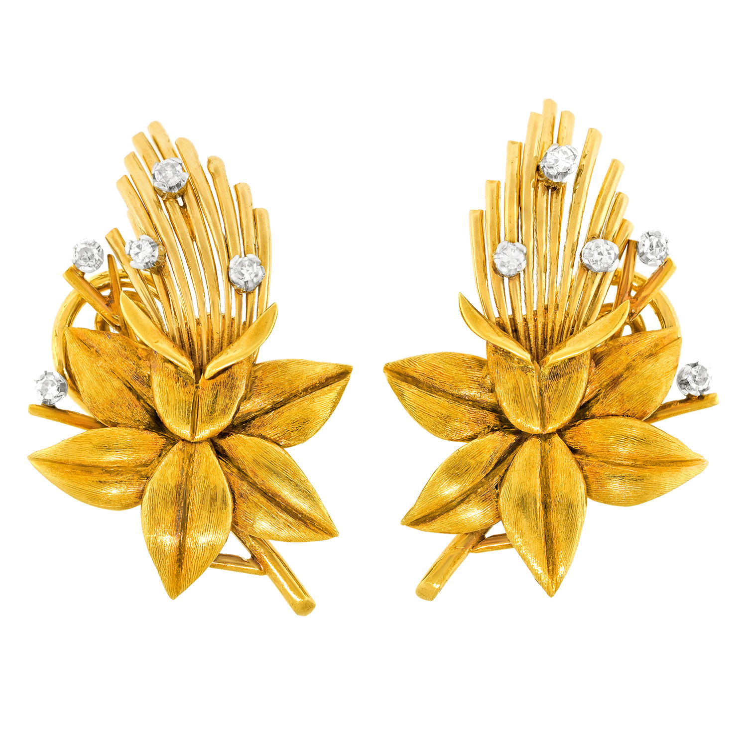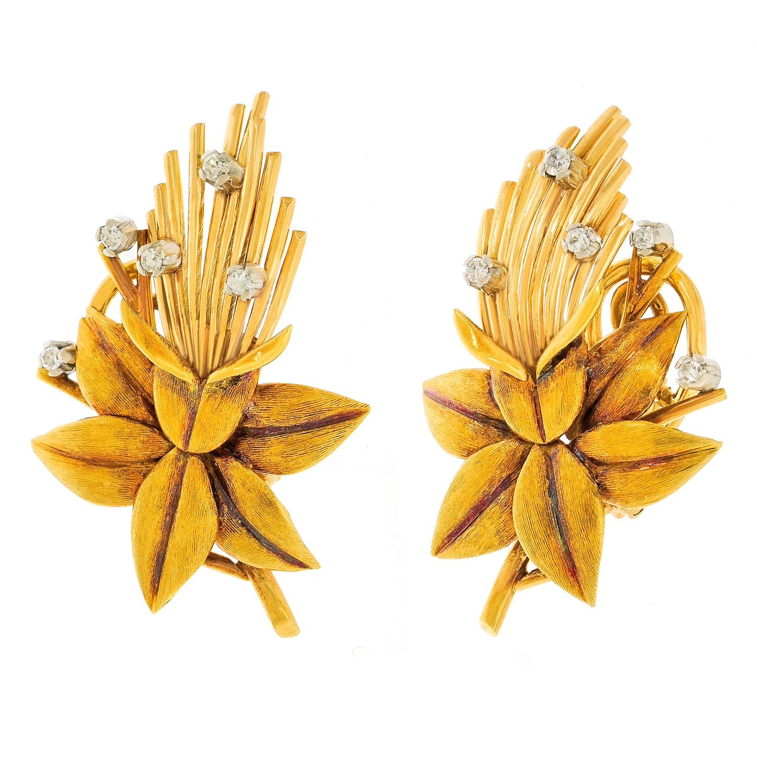 Circa 1960s, 18k. Tailored charm, these floral-motif earrings playfully combine 18k gold leaves with brilliant white diamond blossoms. The look is classic out-on-the-town sixties. Excellent condition.
