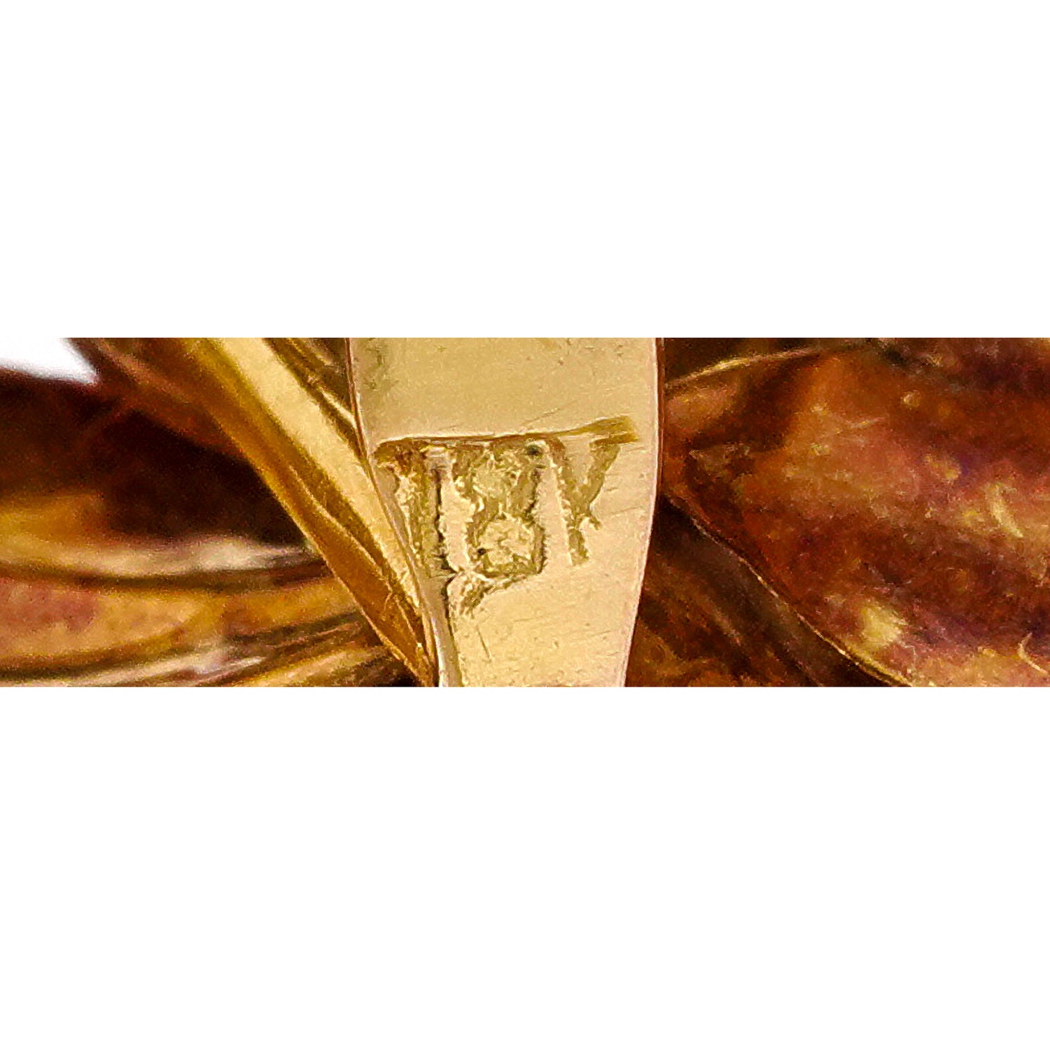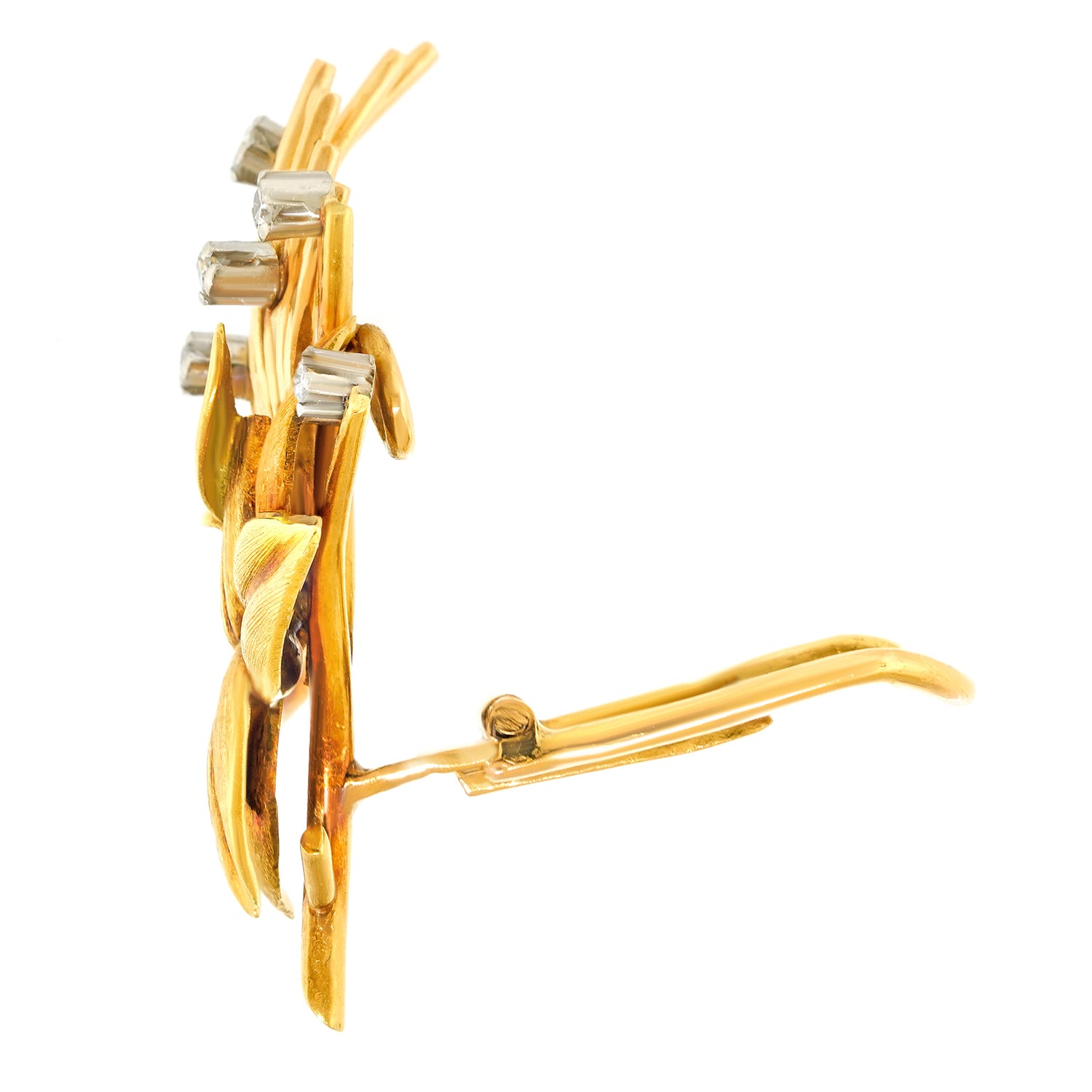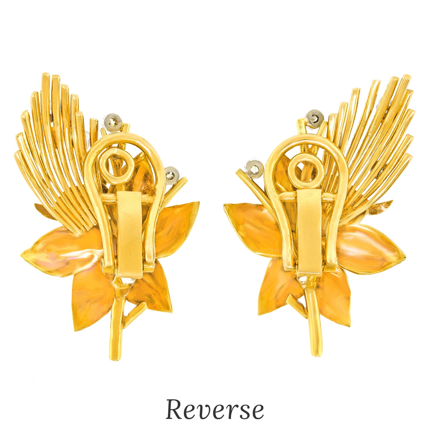 Circa 1960s, 18k. Tailored charm, these floral-motif earrings playfully combine 18k gold leaves with brilliant white diamond blossoms. The look is classic out-on-the-town sixties. Excellent condition.