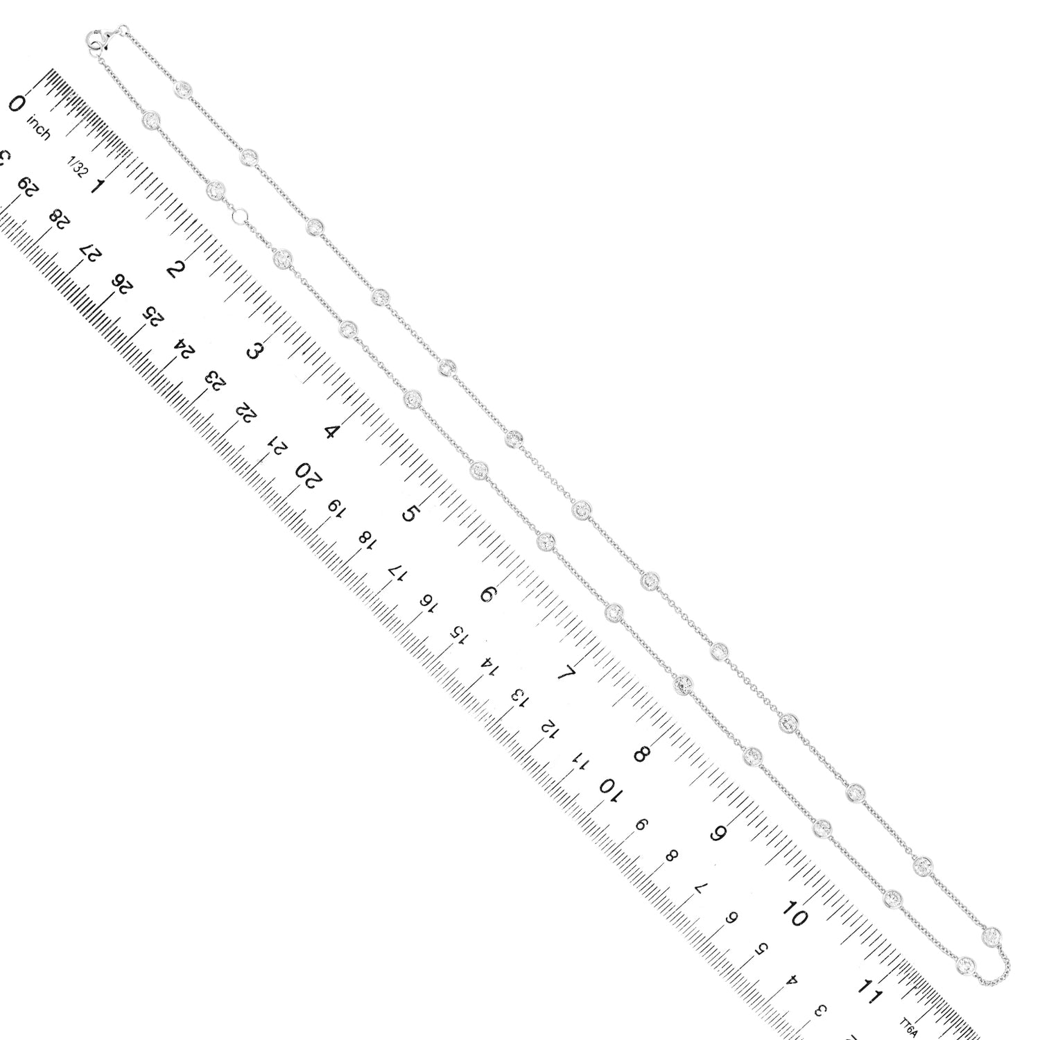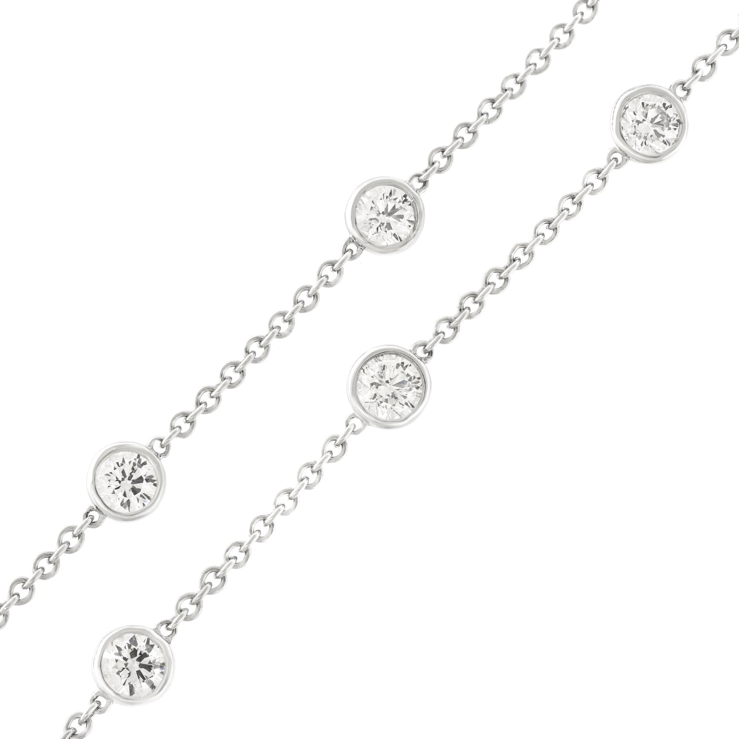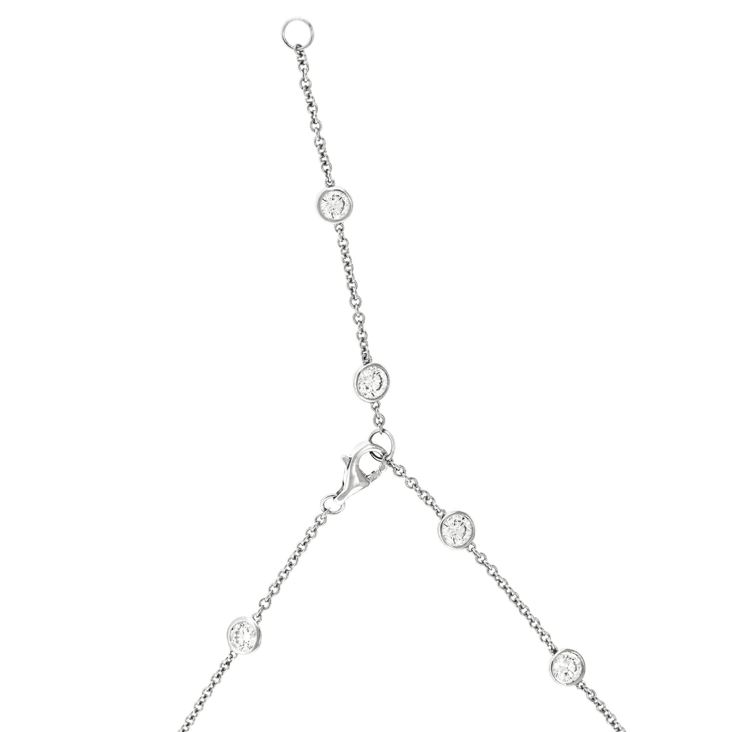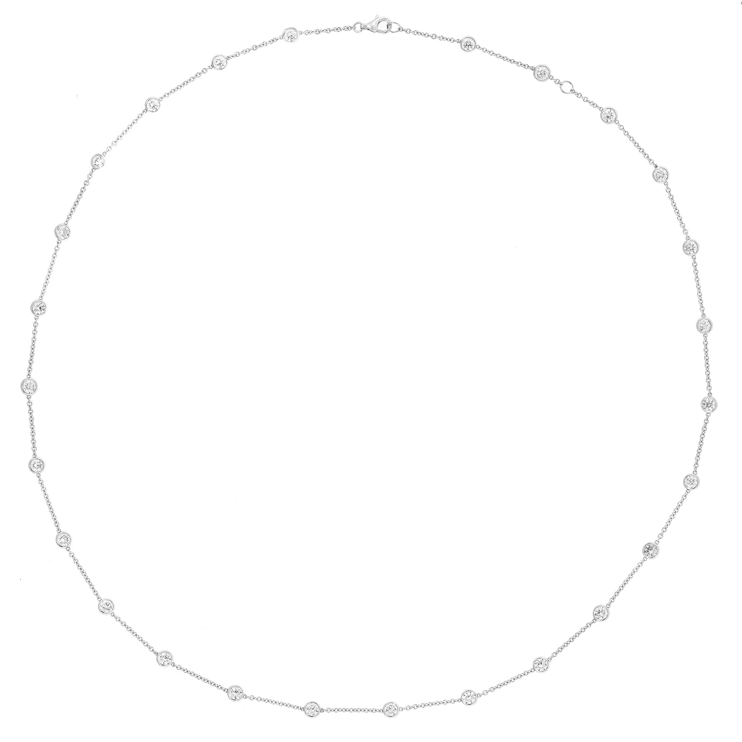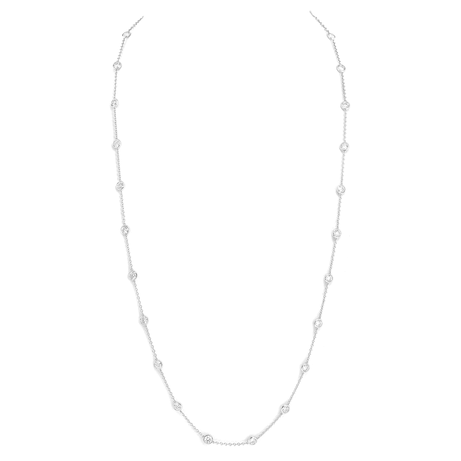 Circa 2000s, 18k, American. This chic white gold necklace is strewn with collet-set diamonds. At 24 inches long, it is a great day or night look. The 6.0 carats of brilliant white diamonds are G color and VS clarity. Full length or doubled, it is perfect on its own or pops in a layered look with other chains or pearls. Finely constructed in eighteen karat white gold. Excellent condition.