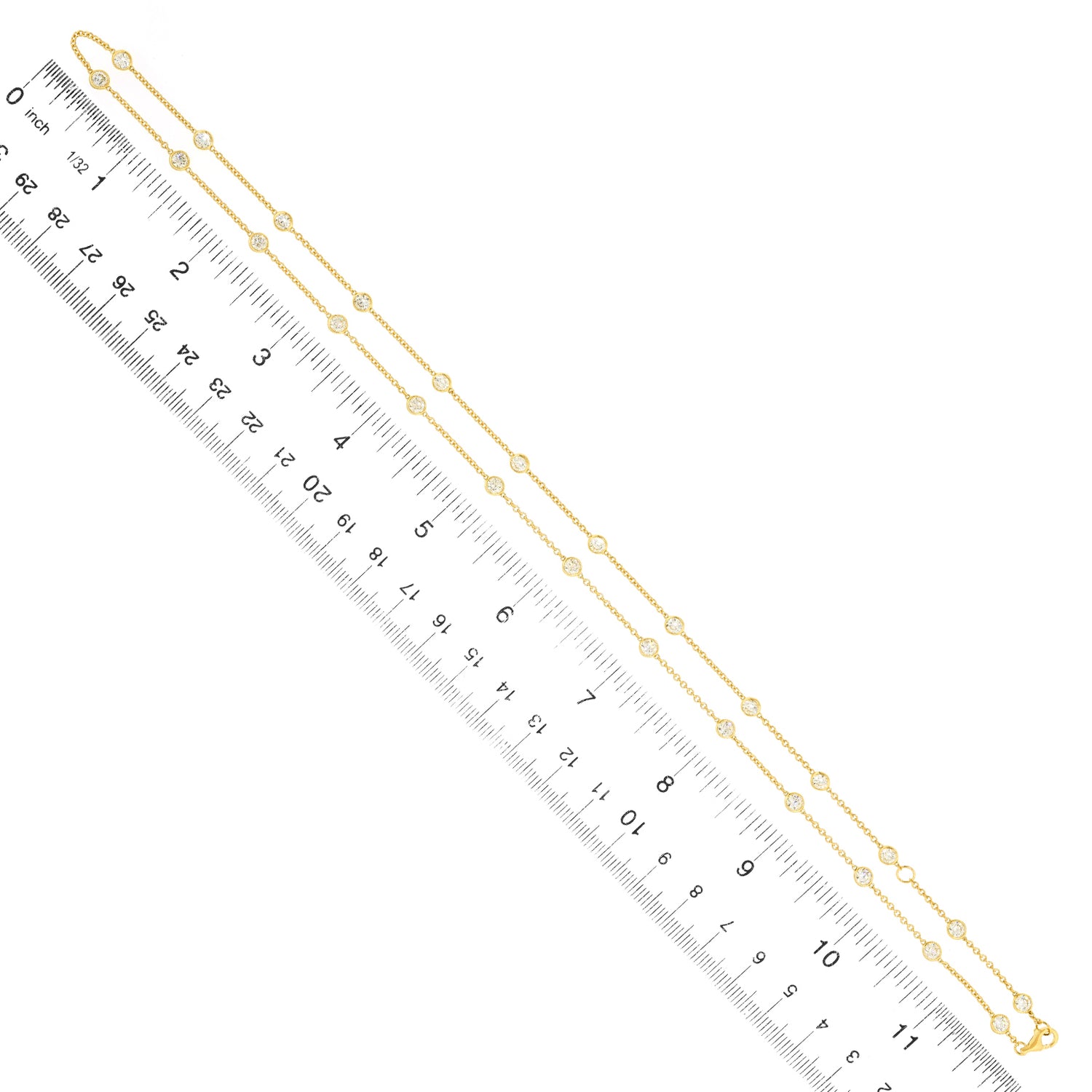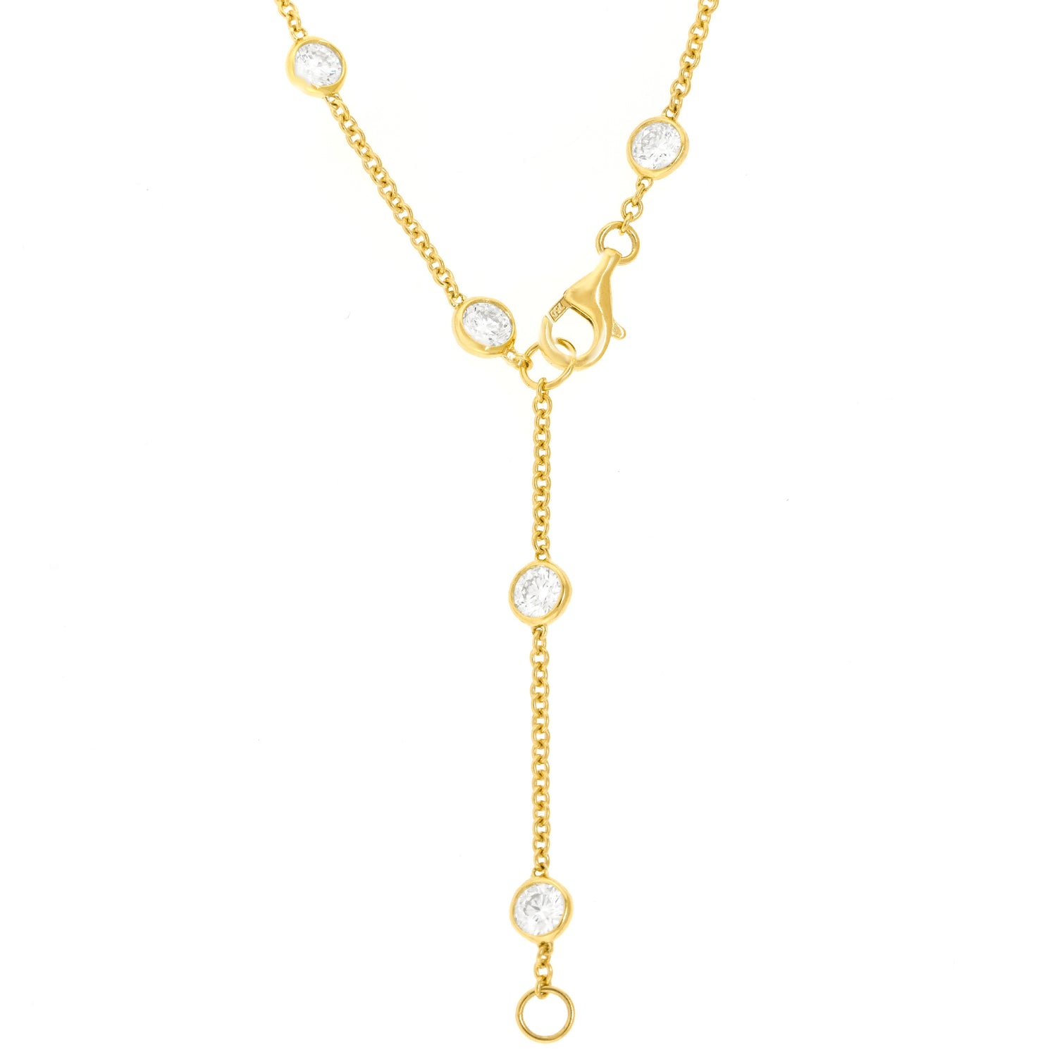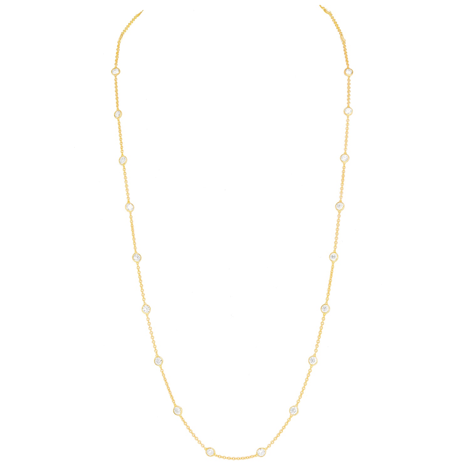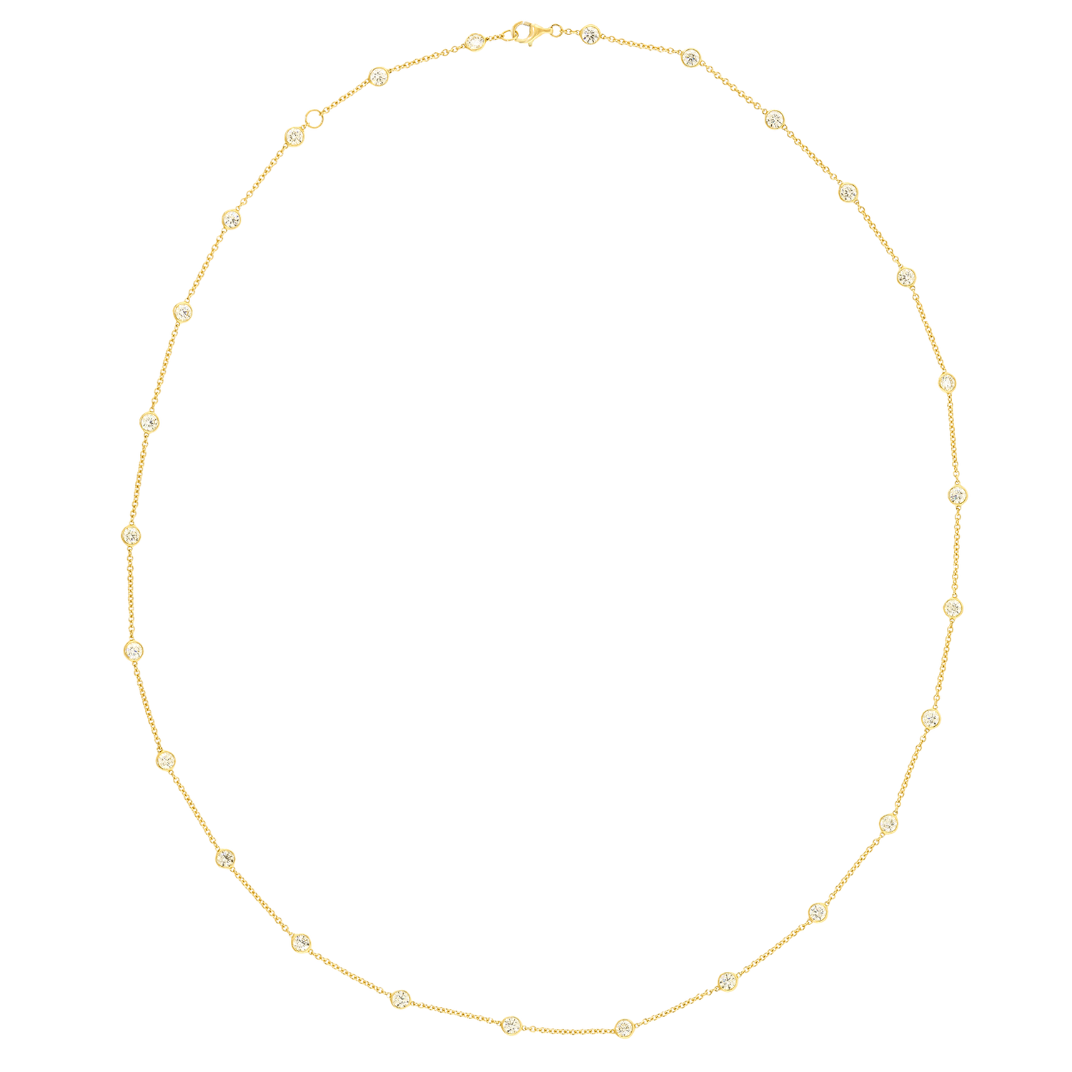 Circa 2000s, 18k, American. This chic gold necklace is strewn with collet-set diamonds. At 24 inches long, it is a great day or night look. The 4.50 carats of brilliant white diamonds are G color and VS2 clarity. Full length or doubled, it is perfect on its own or pops in a layered look with other chains or pearls. Finely constructed in eighteen karat yellow gold.