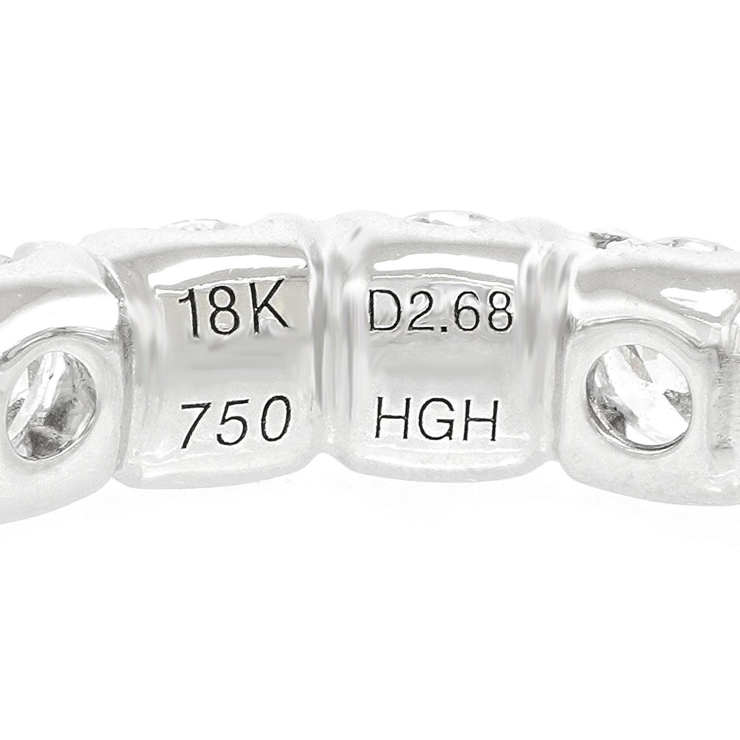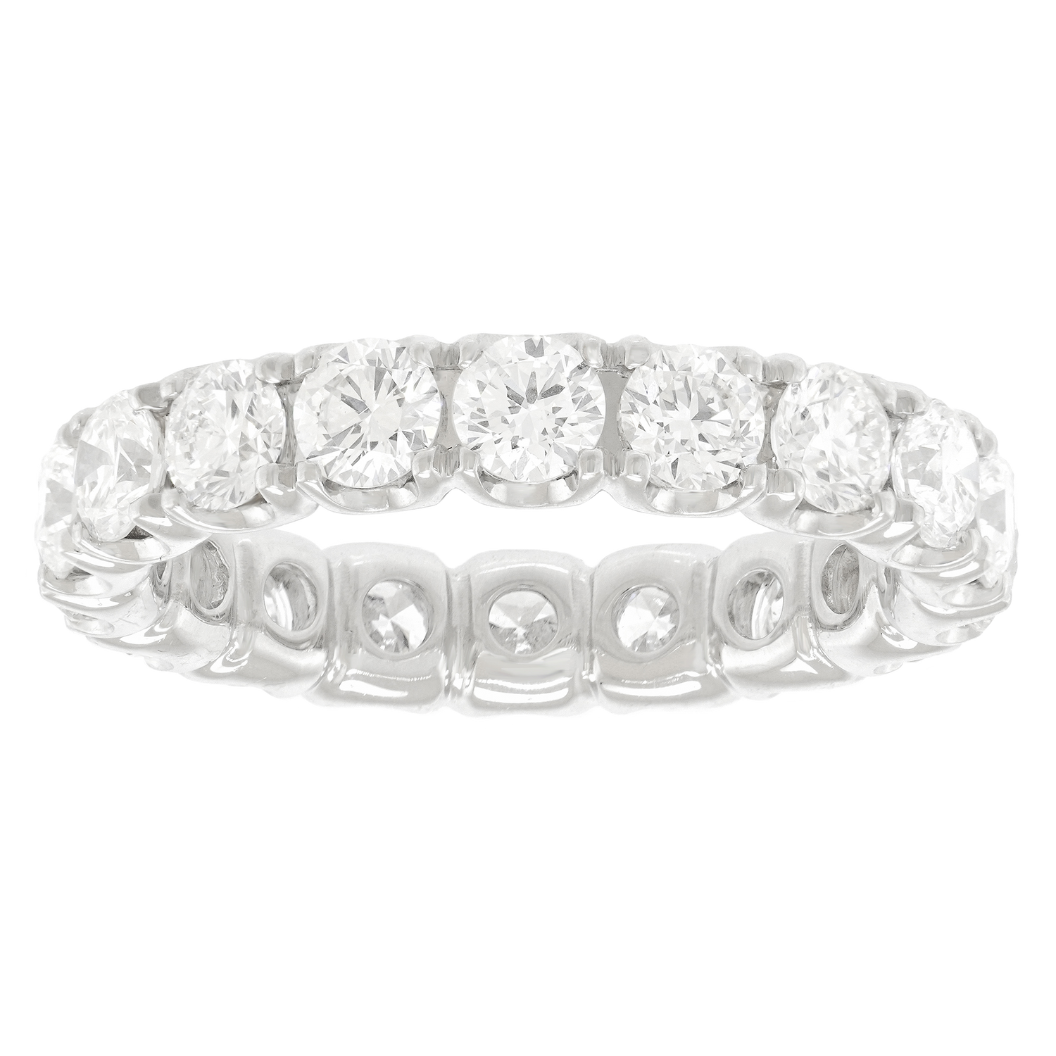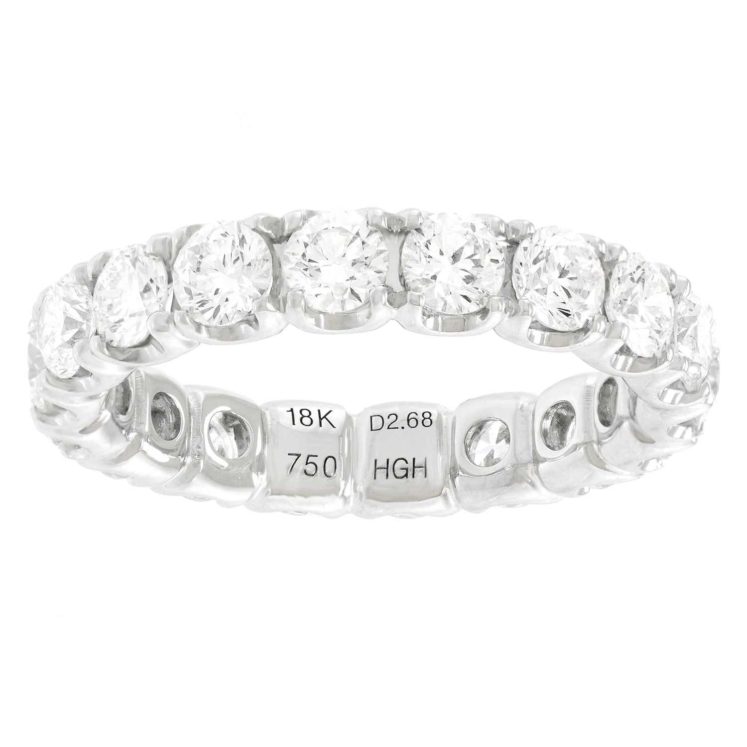 Circa 2000s, 18k, American. This timeless eternity band features 2.68 carats of brilliant white diamonds (G color, VS clarity) set in eighteen-karat white gold. The look is confidently all about the diamonds! Perfect on its own, brilliant in a stack, and great as a wedding band, this size 6 ring is in excellent condition.
