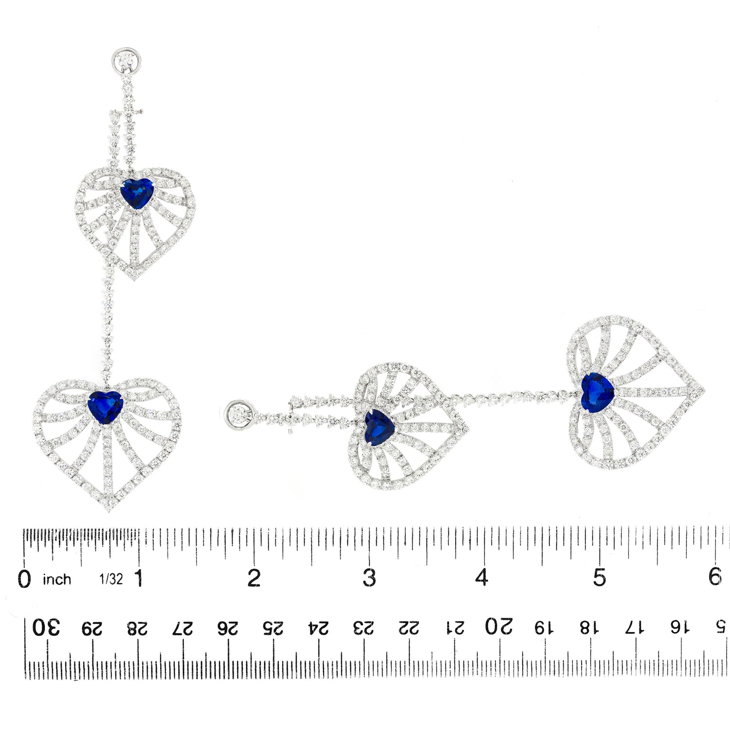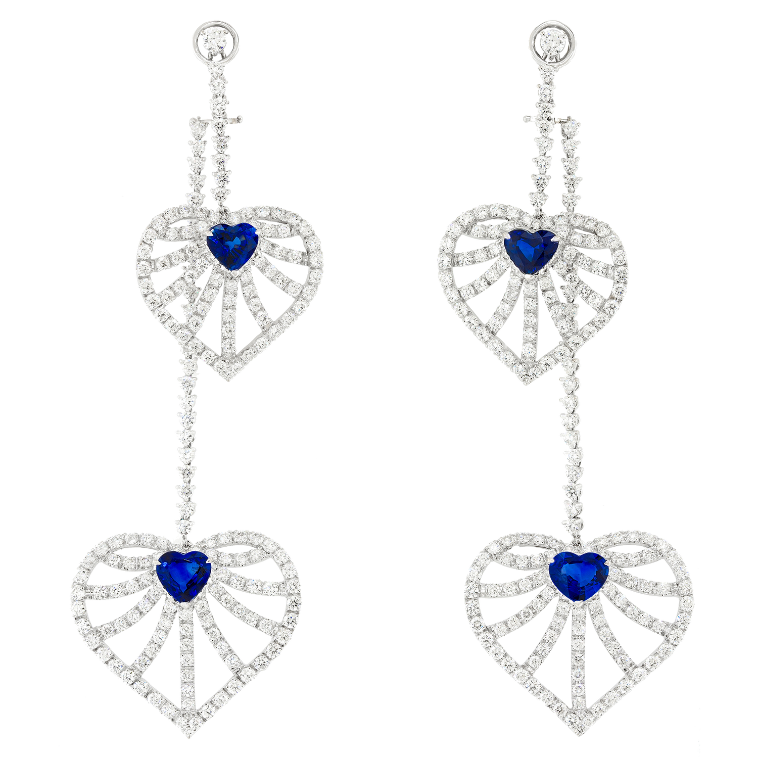 Circa 1990s, 18k, Italy. These bold four-and-a-quarter-inch-long show-stoppers are sculpture-to-go! Superb heart shaped sapphires (8.25 carats, Fine color and clarity) adorn dazzling diamond-set heart motifs. Harmoniously intricate, the look is all about movement, color and sparkle. Whimsical and elegant, substantial and delicate, fun and refined these are the earrings dreams are made of. Meticulously fabricated with fourteen carats of brilliant white diamonds (G color, VS clarity), they are ready for the red carpet or a chic poolside party. Excellent condition.