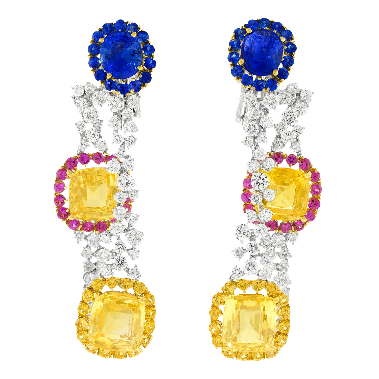 Circa 1990s, 18k, Italy. Glamorous Color, Italian Style. Set with 8.0 carats of brilliant white diamonds (G color and VS clarity) and 60.0 carats of sublime cornflower blue, yellow and pink sapphires. Featuring large stones, these chandelier earrings are so head-turning that they will stop traffic on the catwalk. The look is perfect for any fashionable moment... poolside if you dare (the Italians definitely dare!!) Finely fabricated, they are in excellent condition.