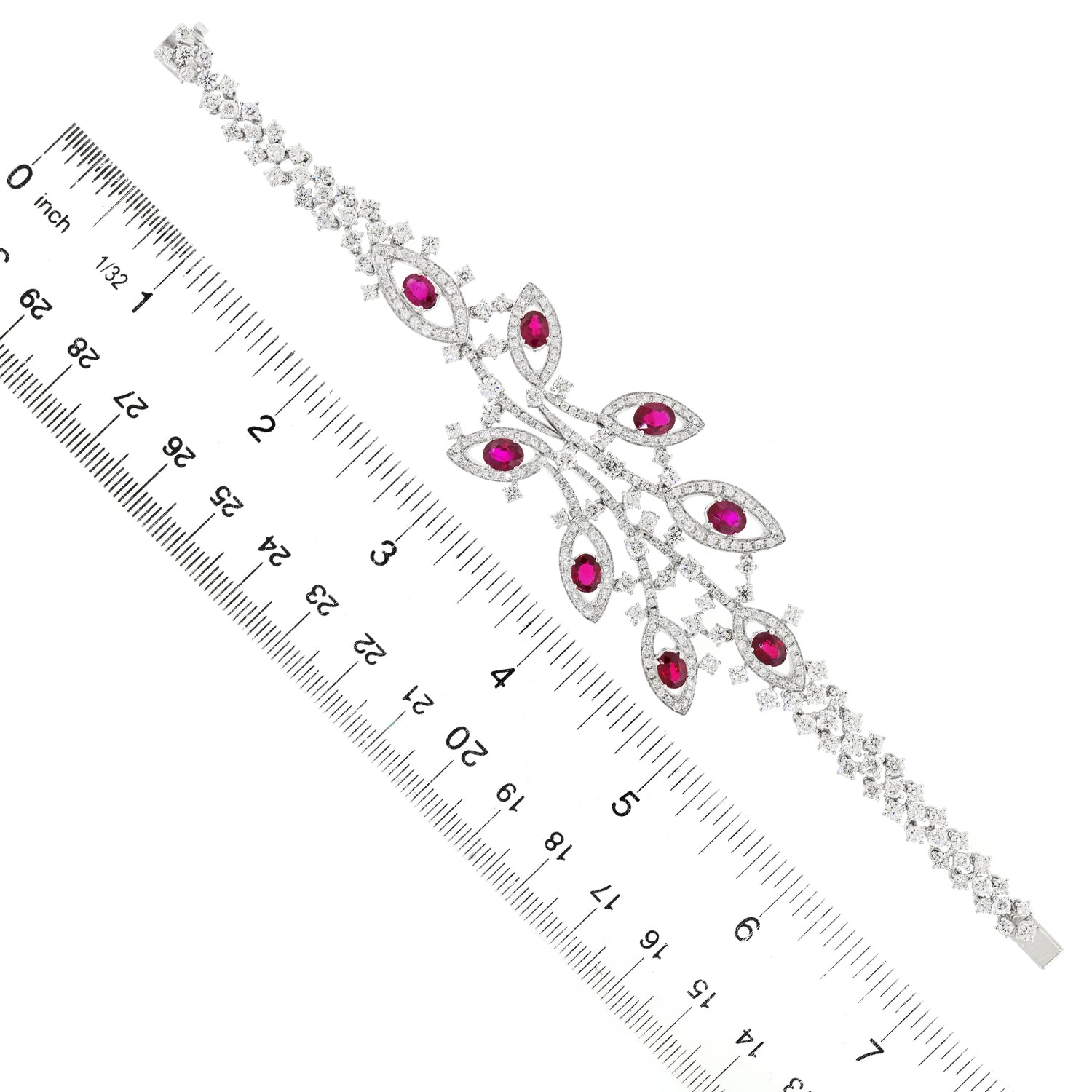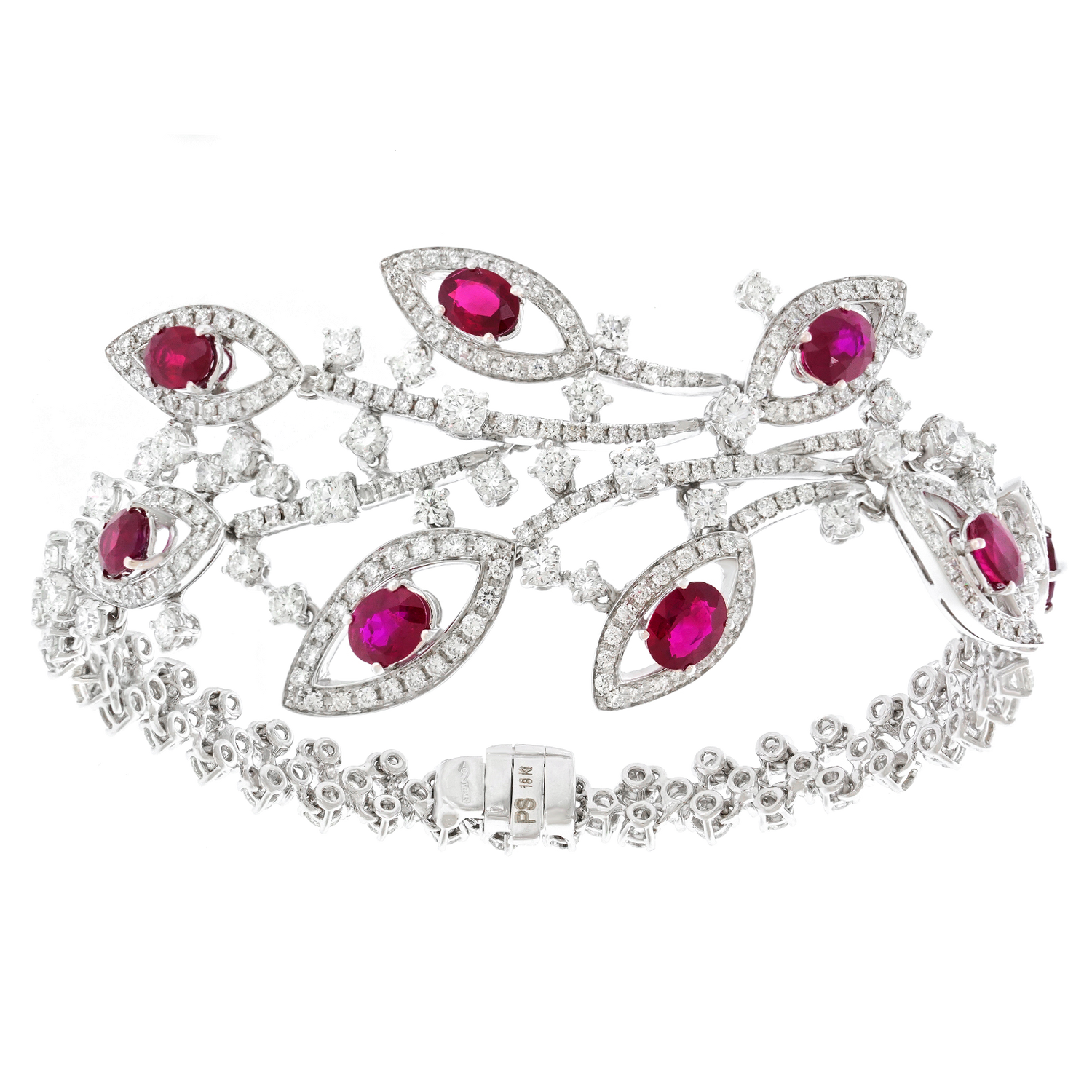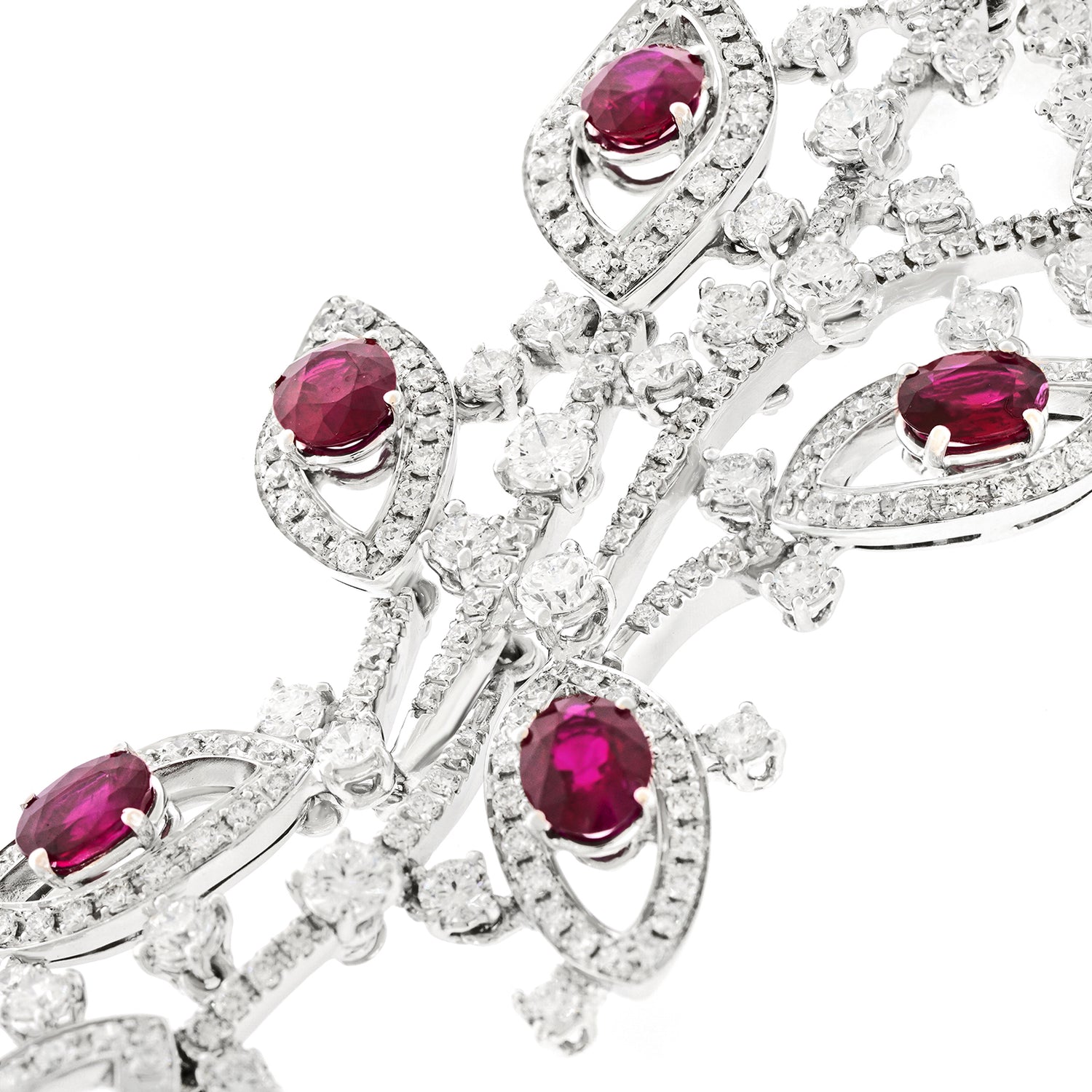 Circa 1990s, 18k, Italy. Always magnificent, Italian jewelry is built on a historic foundation of exceptional design, underscored by meticulous attention to detail and fine craftsmanship. The five carats of lush rubies and nine carats of brilliant white diamonds (G color VS clarity) are set in 18k white gold foliate silhouettes. The look is effortless Italian style, perfect dressed up or down. Excellent condition.