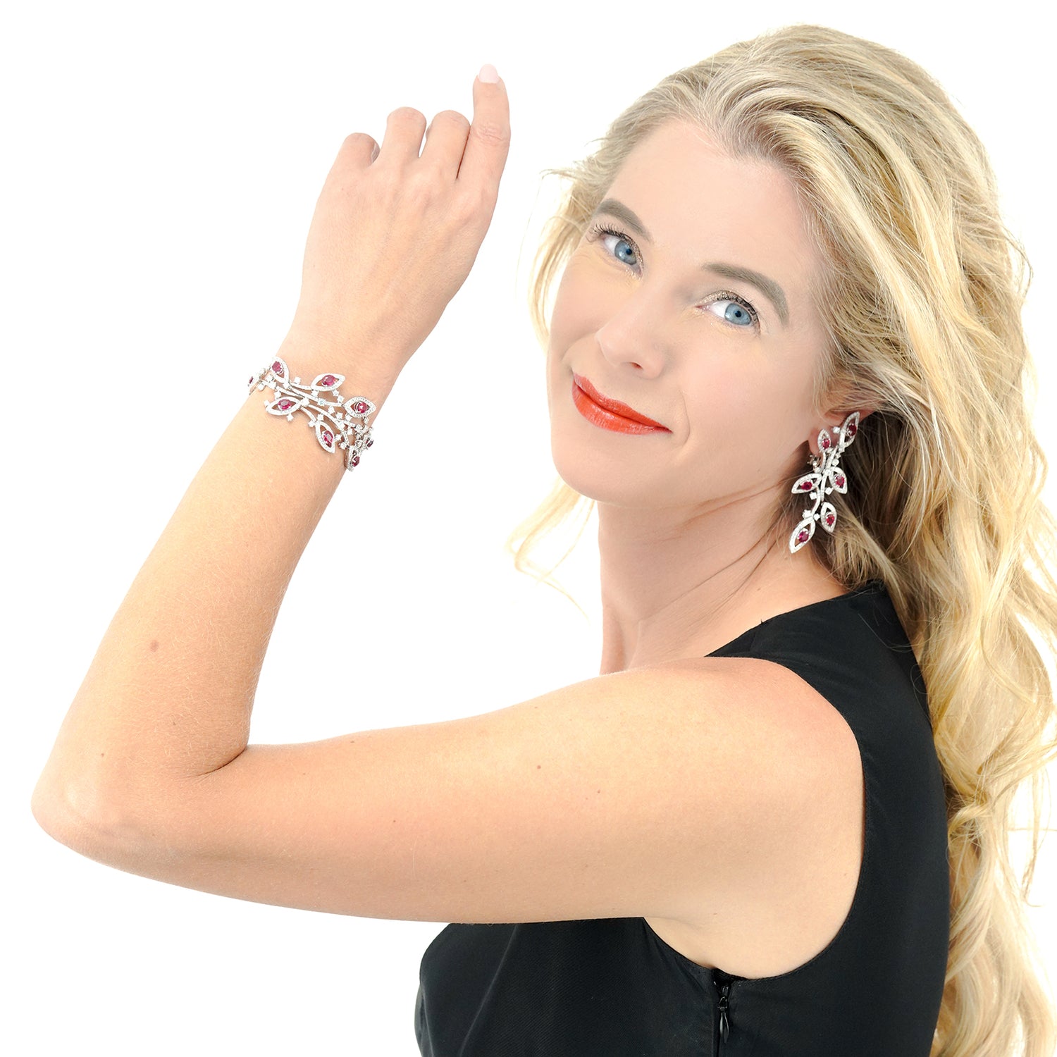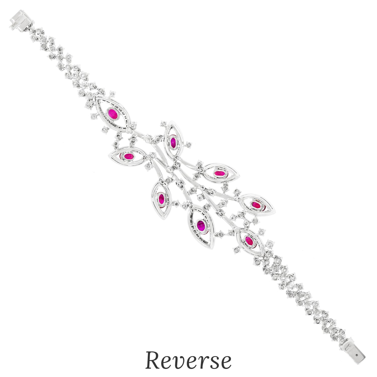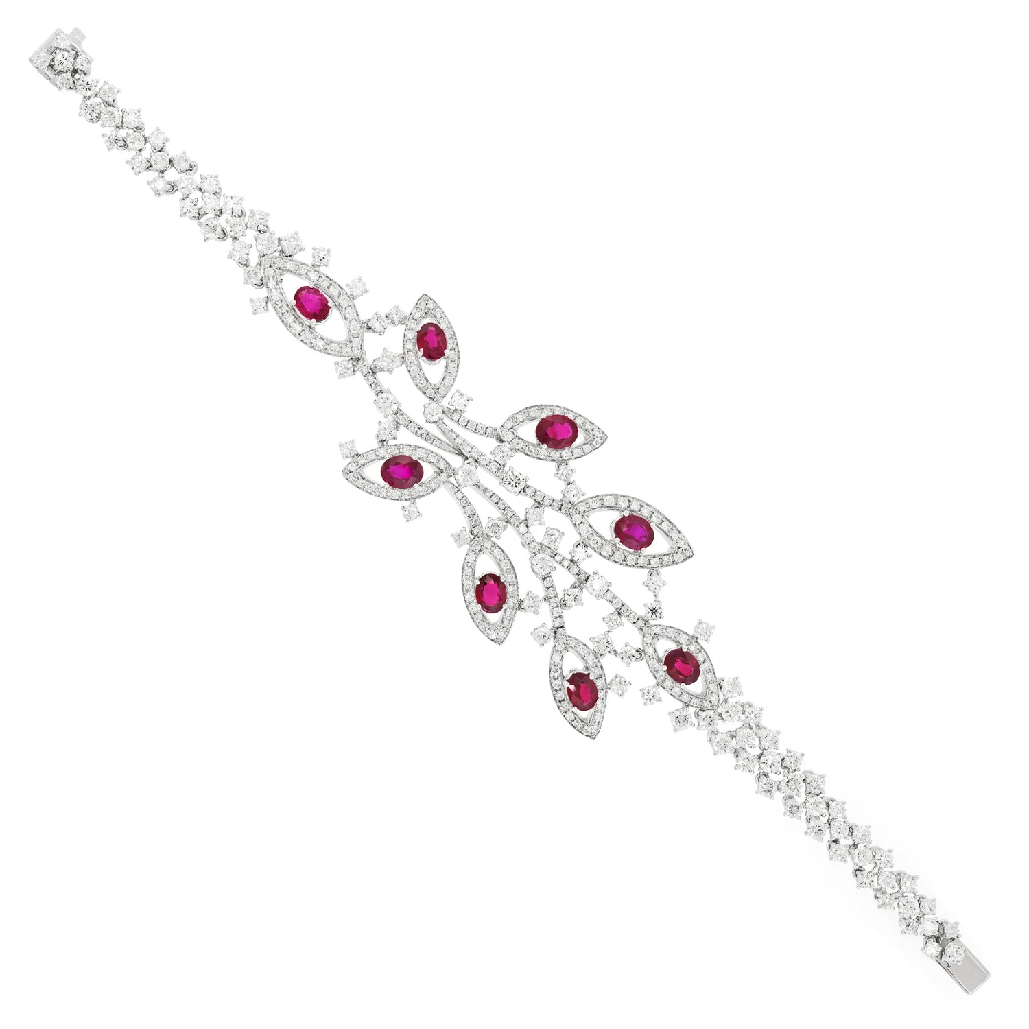 Circa 1990s, 18k, Italy. Always magnificent, Italian jewelry is built on a historic foundation of exceptional design, underscored by meticulous attention to detail and fine craftsmanship. The five carats of lush rubies and nine carats of brilliant white diamonds (G color VS clarity) are set in 18k white gold foliate silhouettes. The look is effortless Italian style, perfect dressed up or down. Excellent condition.