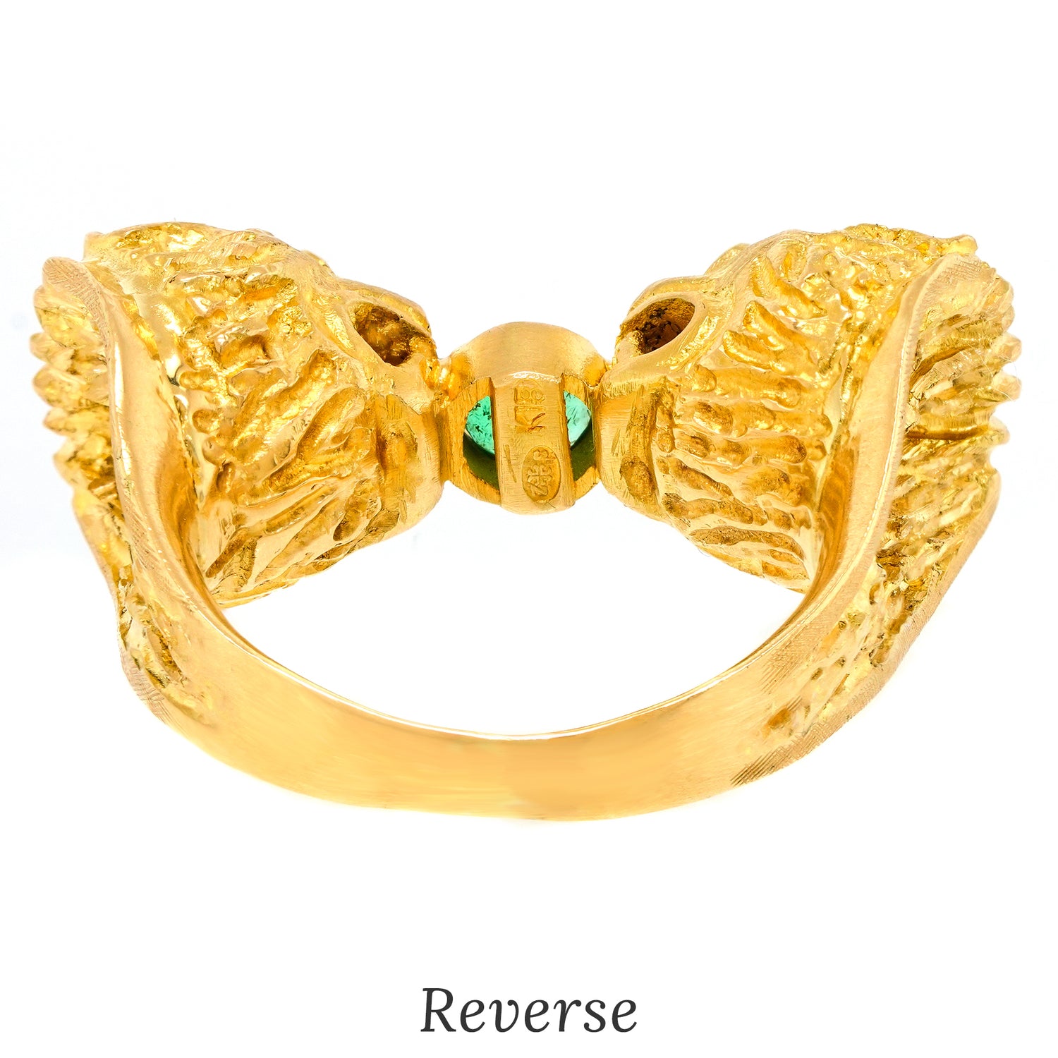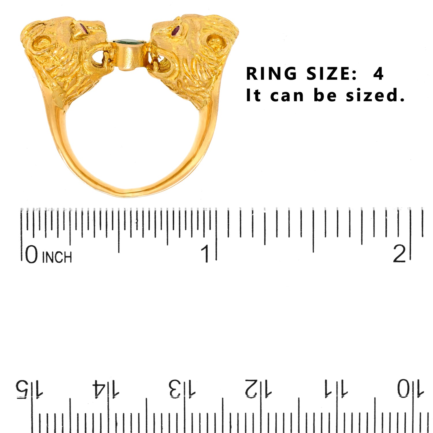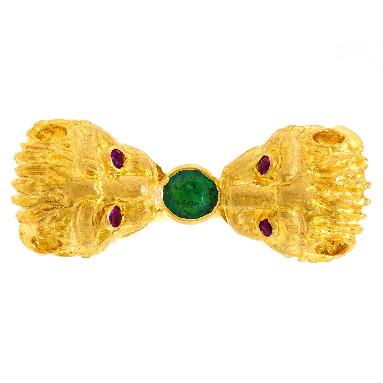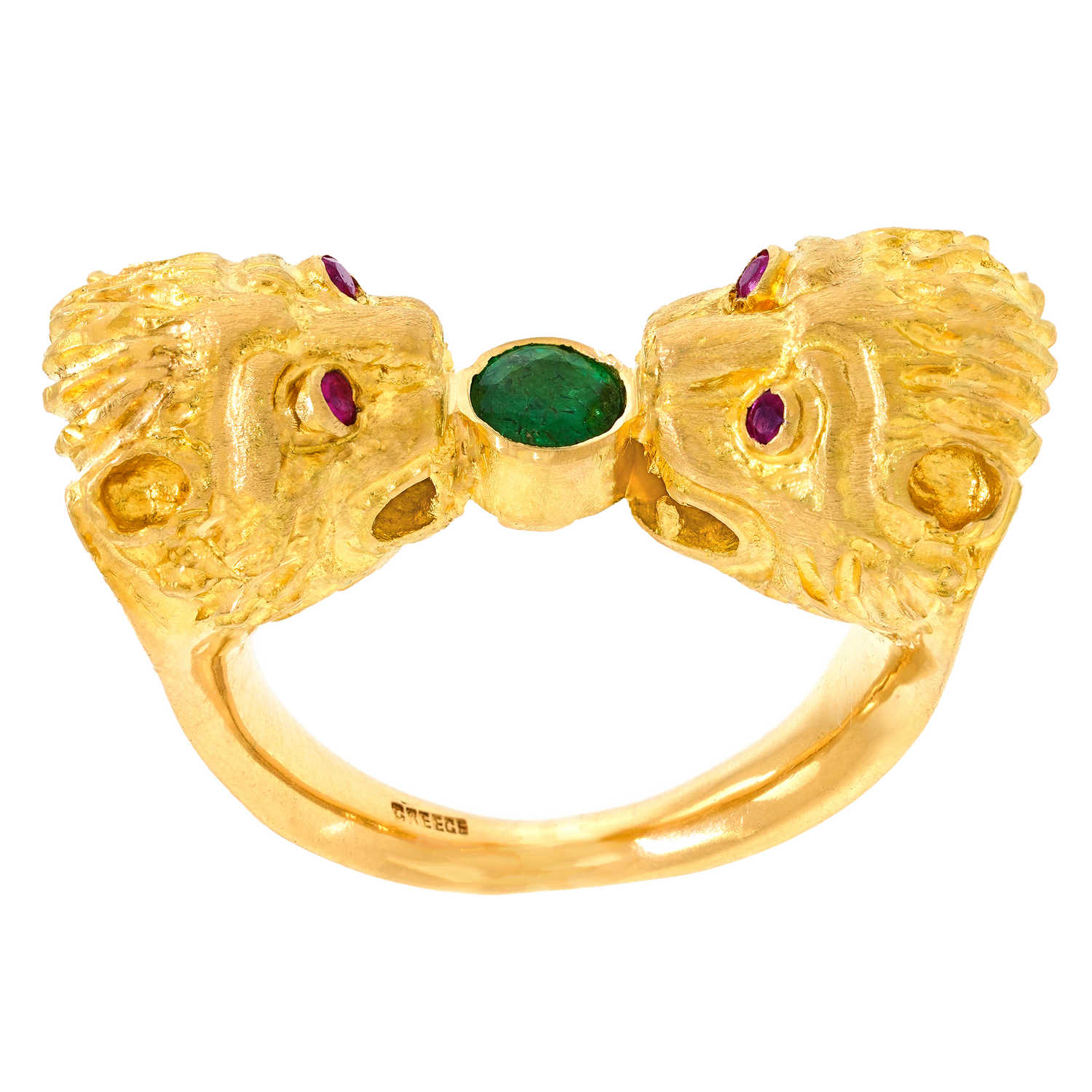 Circa 1960s, 18k, Greece. This eighteen-karat gold Mycenaean Revival ring is decorated with finely detailed lion heads, underscored by ruby-set eyes and a rich green emerald. This ring is a unique interpretation of classic Greek motifs. Well-made and in excellent condition.