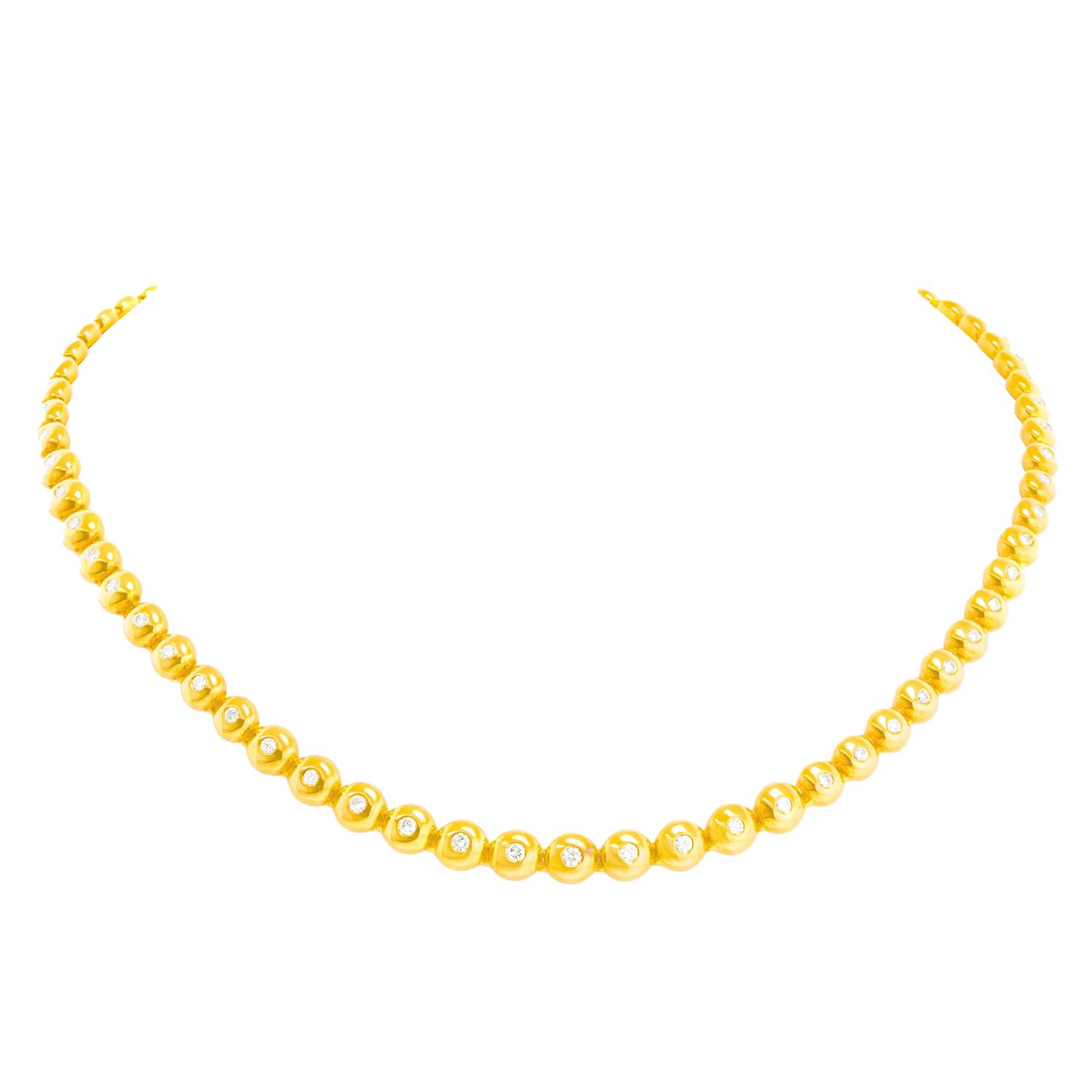 Circa 1970s, 18k, by Carl Bucherer, Switzerland. This stylish gold necklace from Carl F. Bucherer of Lucerne, Switzerland, is the ideal everyday, everywhere gold necklace. Organo chic droplets of gold are accented by 2.80 carats of fine white diamonds (G color VS clarity). The look is understated and rich, well-dressed, and well-put-together. Superb fabrication and excellent condition complete the picture.