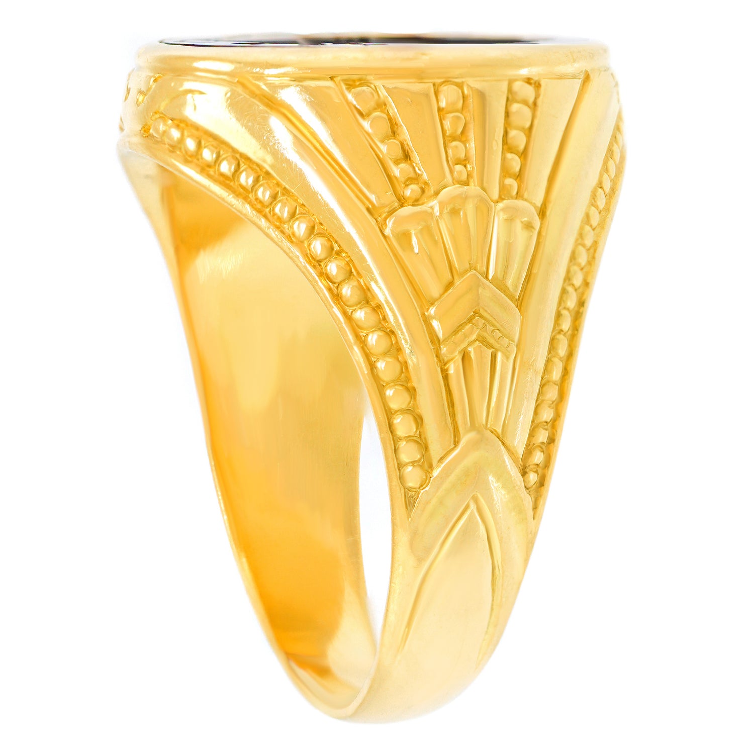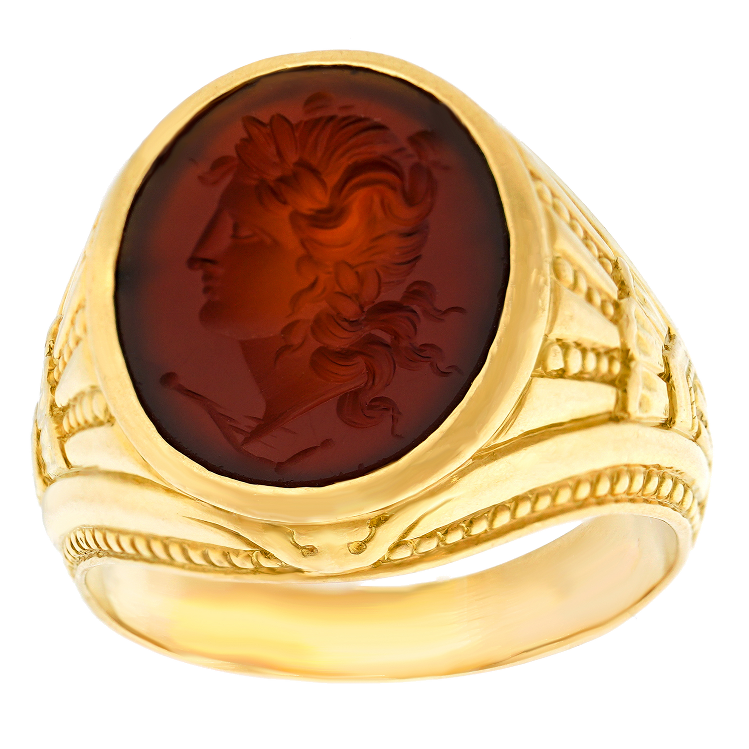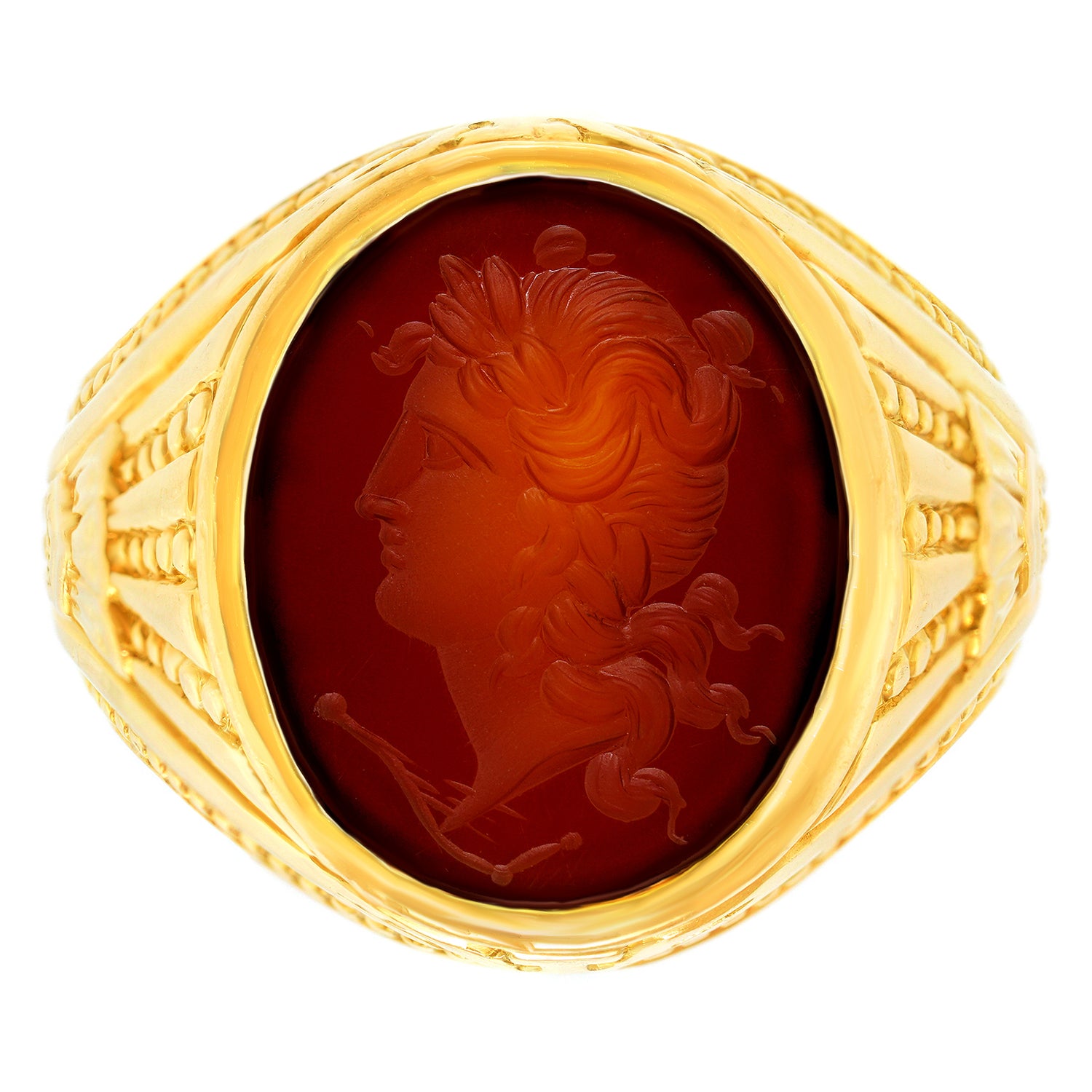 Circa 1880s, 18k. This classic signet ring is set with a fine intaglio-cut carnelian decorated with the head of a goddess. Meticulously made in an 18k yellow gold mounting featuring ornate detail. The size is perfect for fashionable town and country looks. Excellent condition.