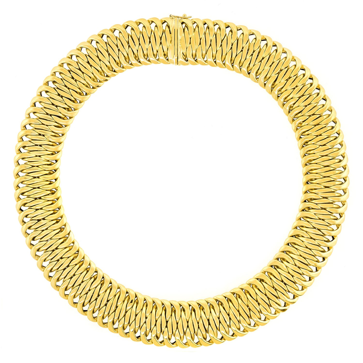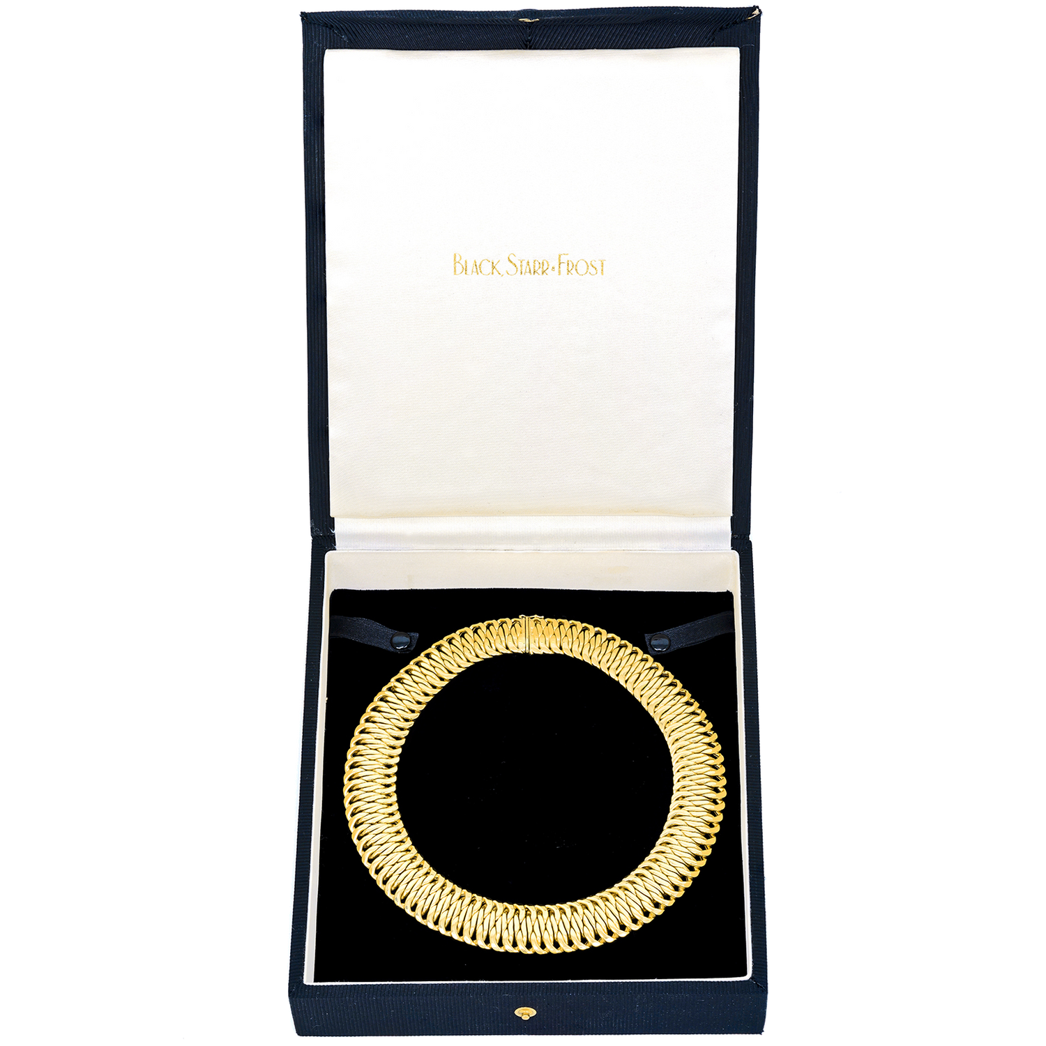 Circa 1960s, 18k, by Black Starr & Frost, American. This gloriously chic yellow gold necklace by Black Star & Frost features a woven motif flawlessly complemented by a polished finish. Meticulously fabricated in eighteen-karat gold, it has that joyfully unrestrained vibe that great sixties jewelry is known for. Excellent condition.