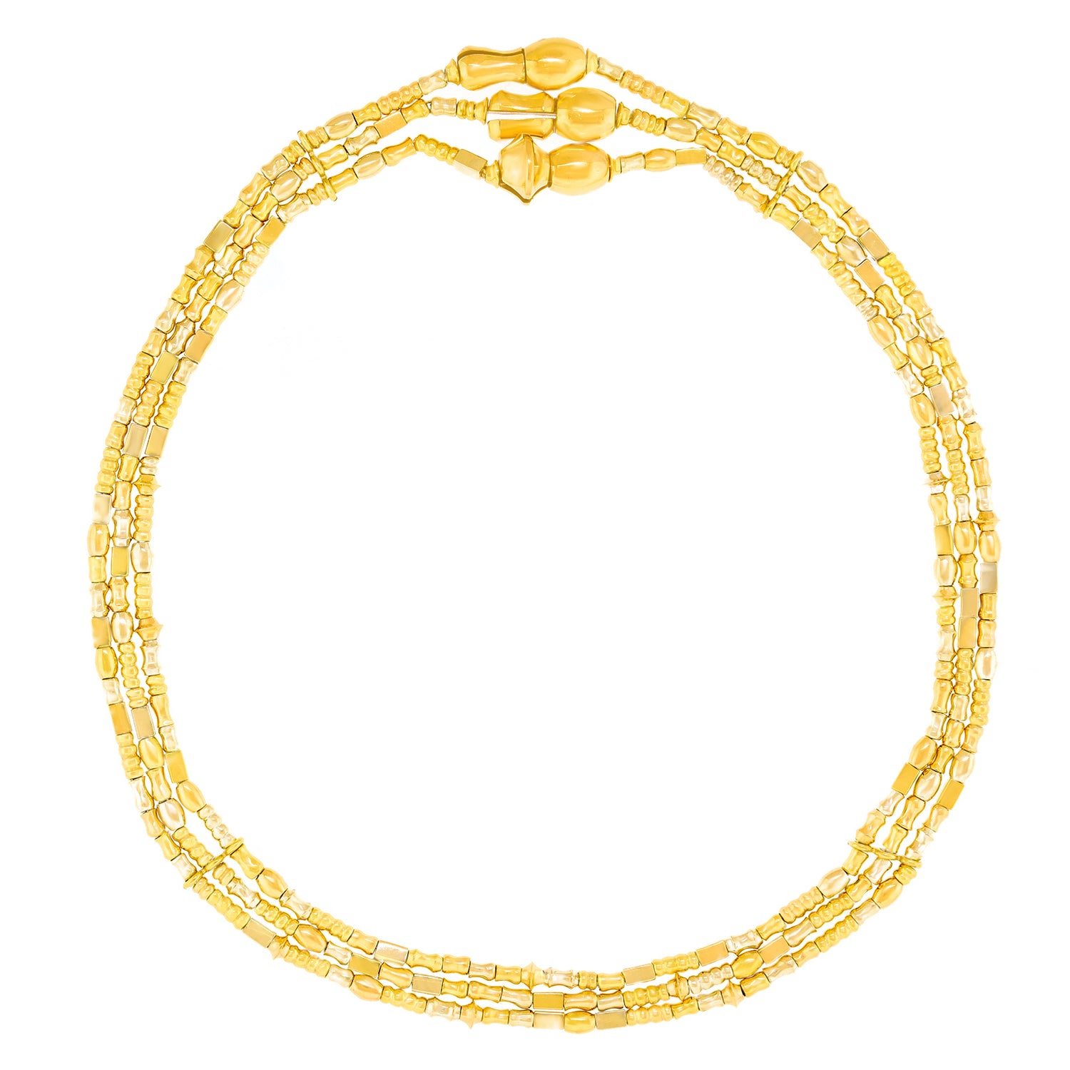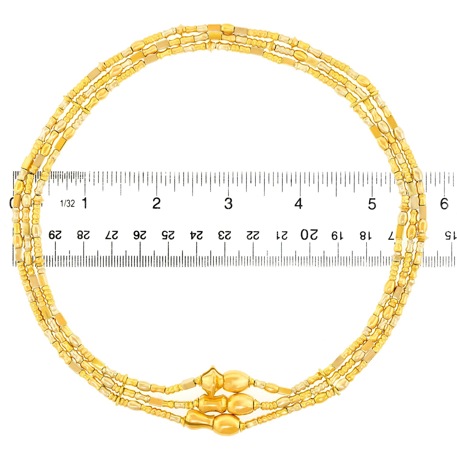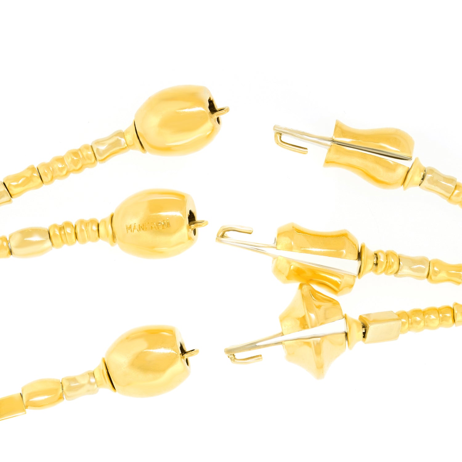 Circa 1980s, 18k, by Manfredi, Italy. This chic three-strand necklace is all about the chunky gold beads, the look is old-world chic. Known for their revival of Byzantine style, quality workmanship, and fashion-forward designs, Manfredi pieces seamlessly mix the old and the new worlds Italian style. Finely fashioned, this comfortable, heavy necklace, is in excellent condition.
