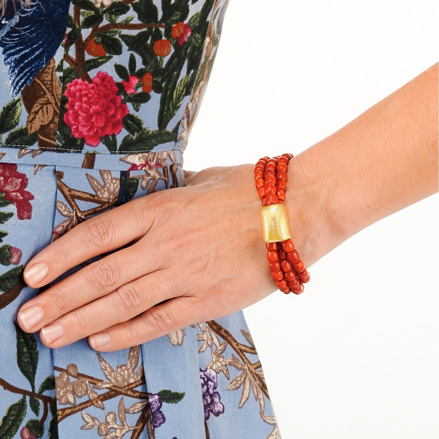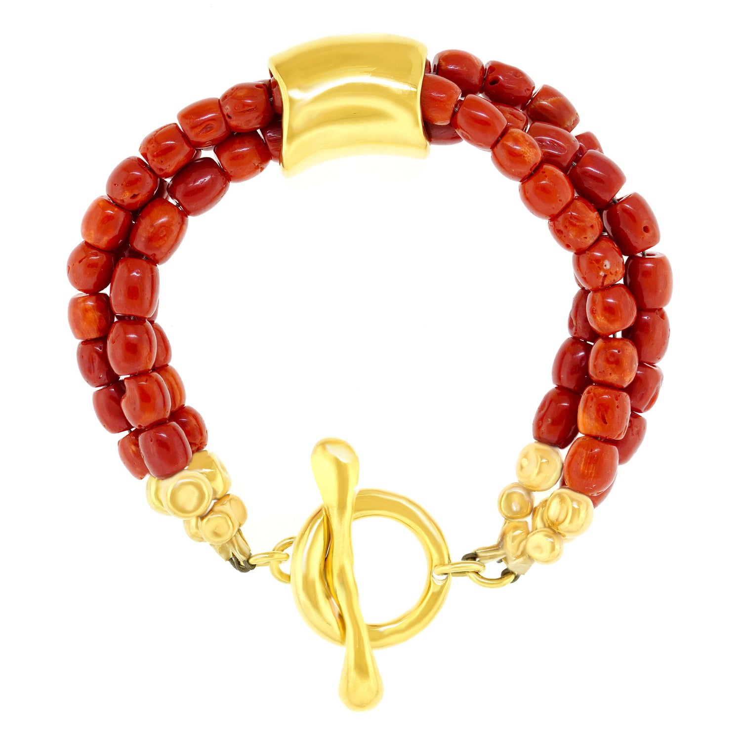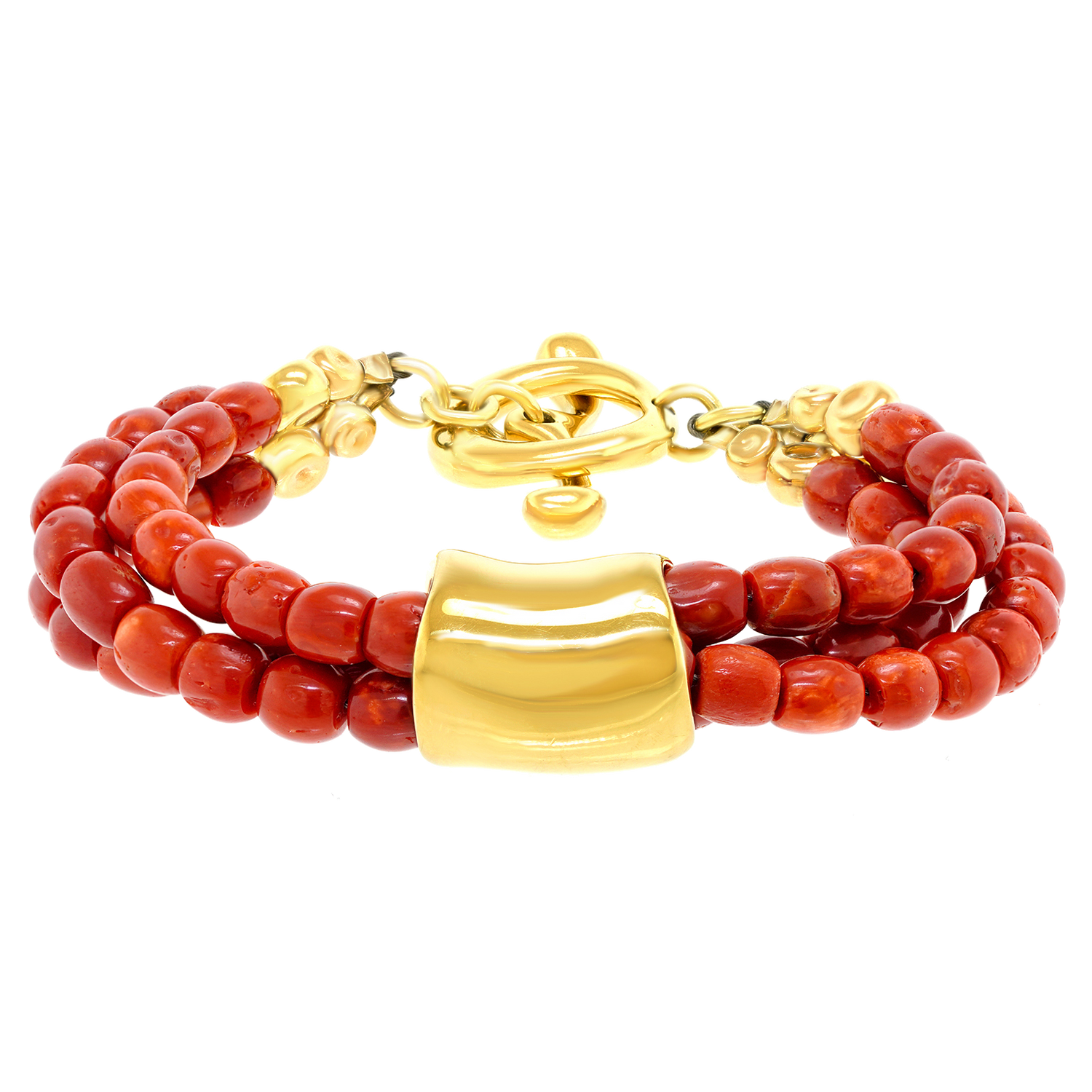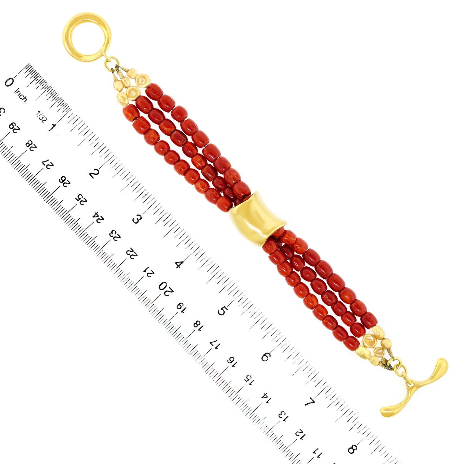 Circa 1990s, 18k, by Robert Lee Morris, New York. A rare gold bracelet from NYC Soho silversmith Robert Lee Morris, combining his fluid metal work with the color and form of natural coral. A fashion world favorite, he often made jewelry for Donna Karan's runway shows. Finely fabricated, this one-of-a-kind bracelet is a transcendental jewelry style. Excellent condition.