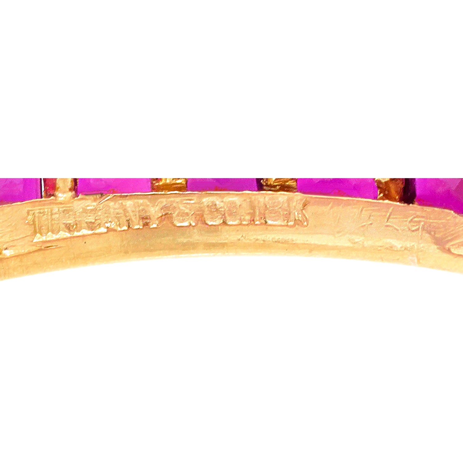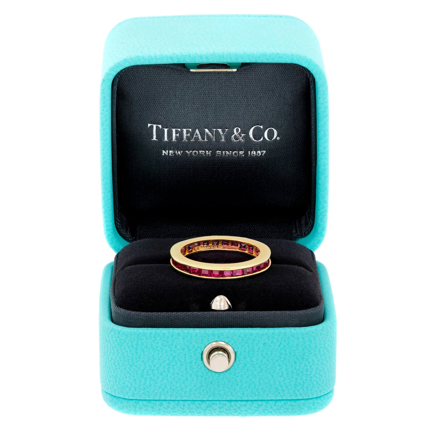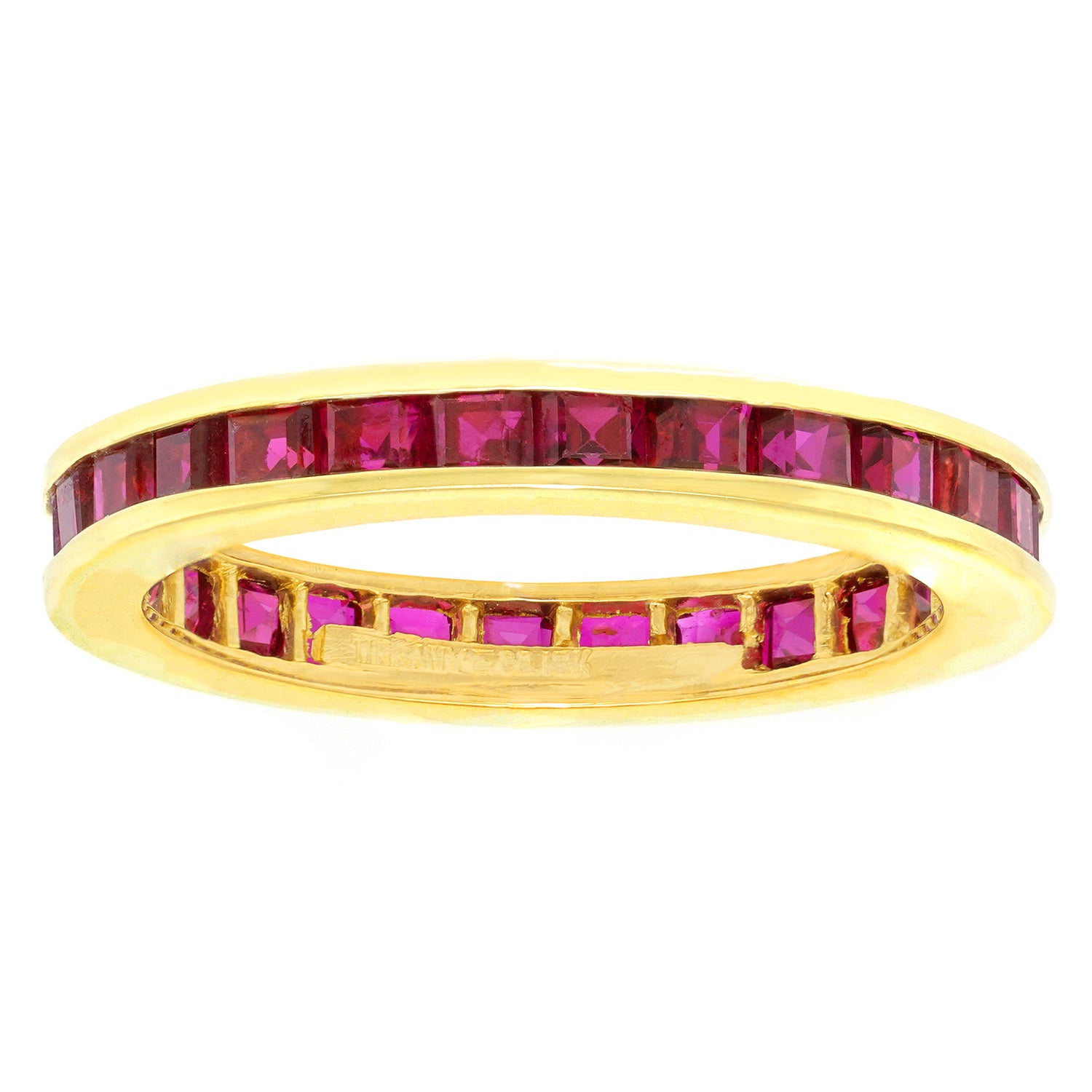 Circa 1980s, 18k, by Tiffany & Co., New York City. Superbly fabricated in eighteen-karat yellow gold, this Tiffany and Co. eternity band is set with 2.10 carats of sublime rubies. These stones are exceptionally well-matched and unusually lush and luminous. Excellent condition.