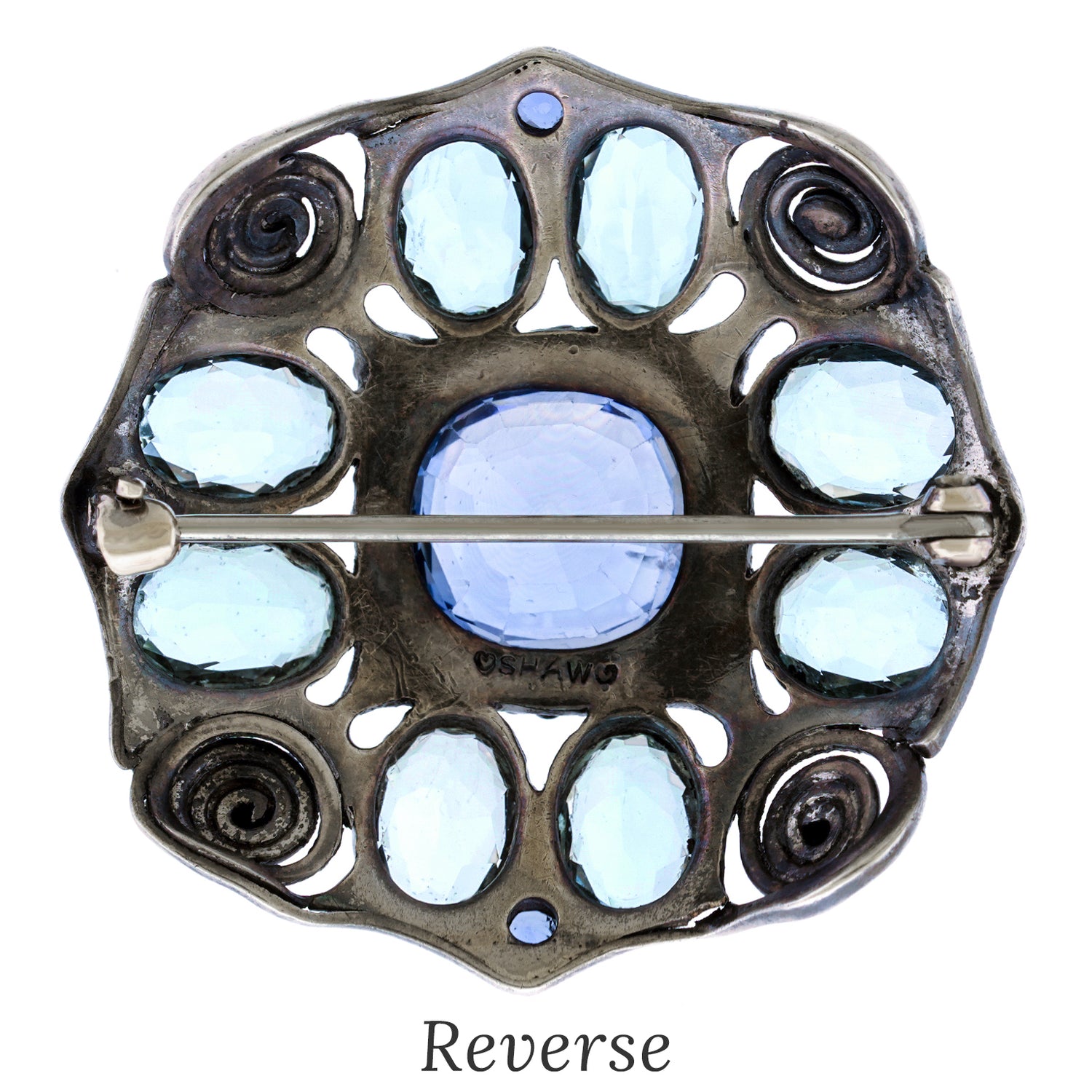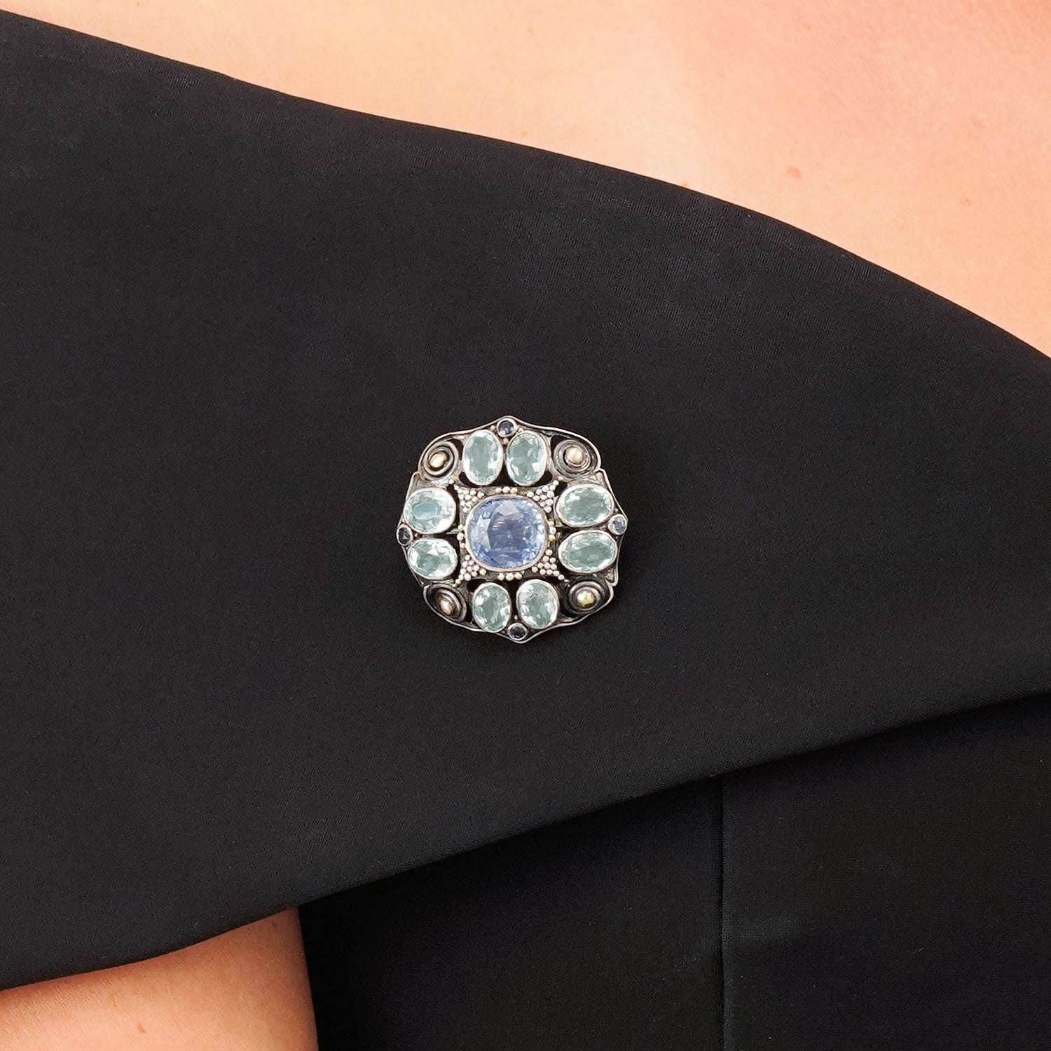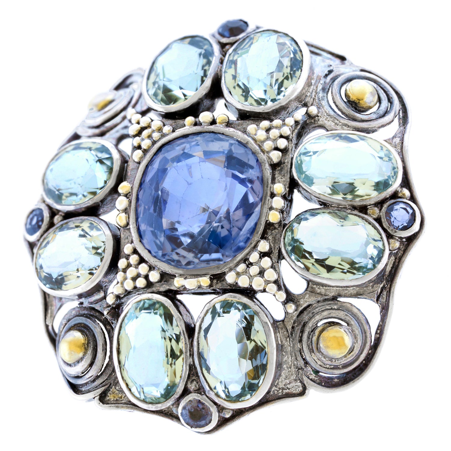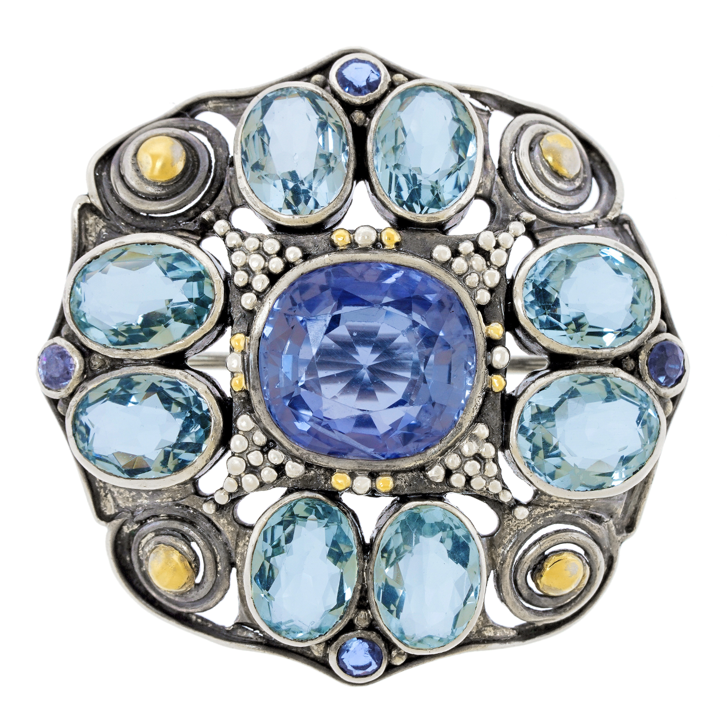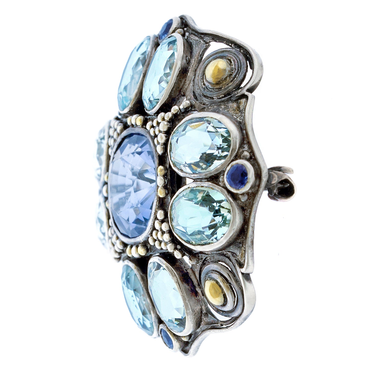 Circa 1905, Sterling and 14k gold by Josephine Hartwell Shaw, Boston. A spectacular example of Josephine Hartwell Shaw's work. This gorgeous Arts and Crafts brooch features mixed metals and textures with a sophisticated color palette. At the center of the visual drama is a six-carat pastel blue Sapphire, surrounded by aquamarine and small Montana Sapphires. The large sapphire is no-heat and most likely Ceylon in origin. Excellent condition.