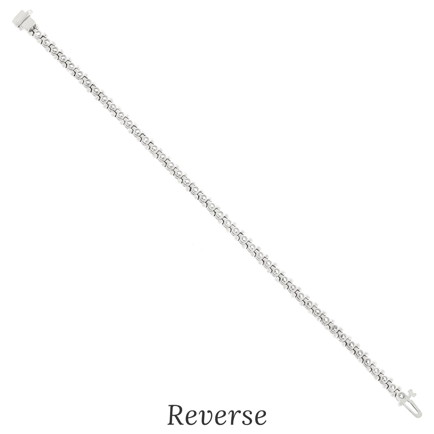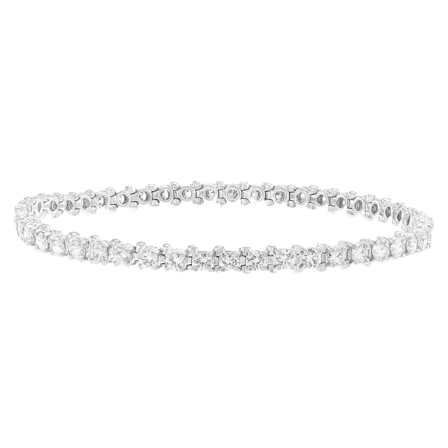 Circa 1990s, 14k, American. The perfect flash of white fire on your wrist, this tennis bracelet is all about the 5.80 carats of brilliant white diamonds (G-H color and VS clarity). Effortlessly chic, it is perfect as the only piece of jewelry you wear that day, or elegantly casual mixed with other bracelets or a watch. An iconic American style, this bracelet does it all. Finely fabricated in 14k white gold, it is in excellent condition.