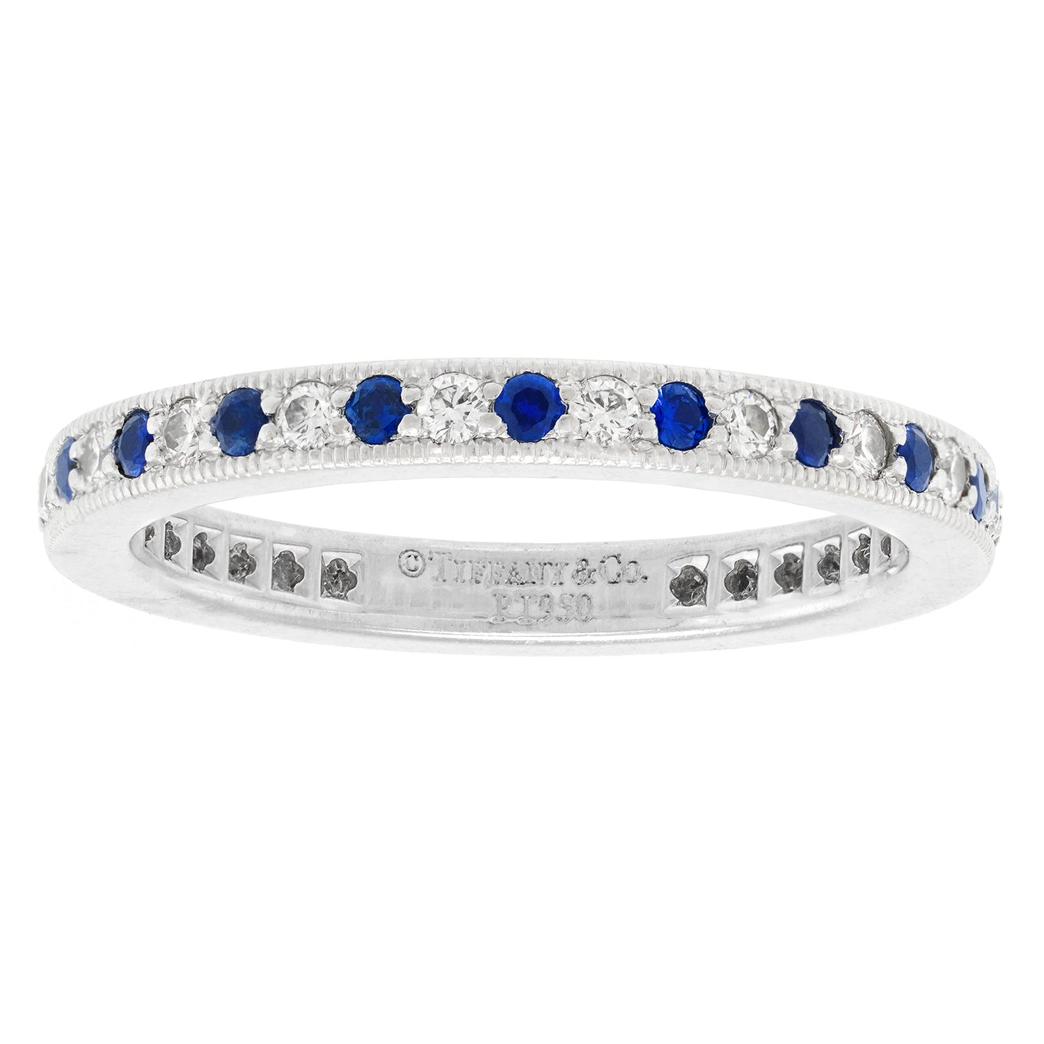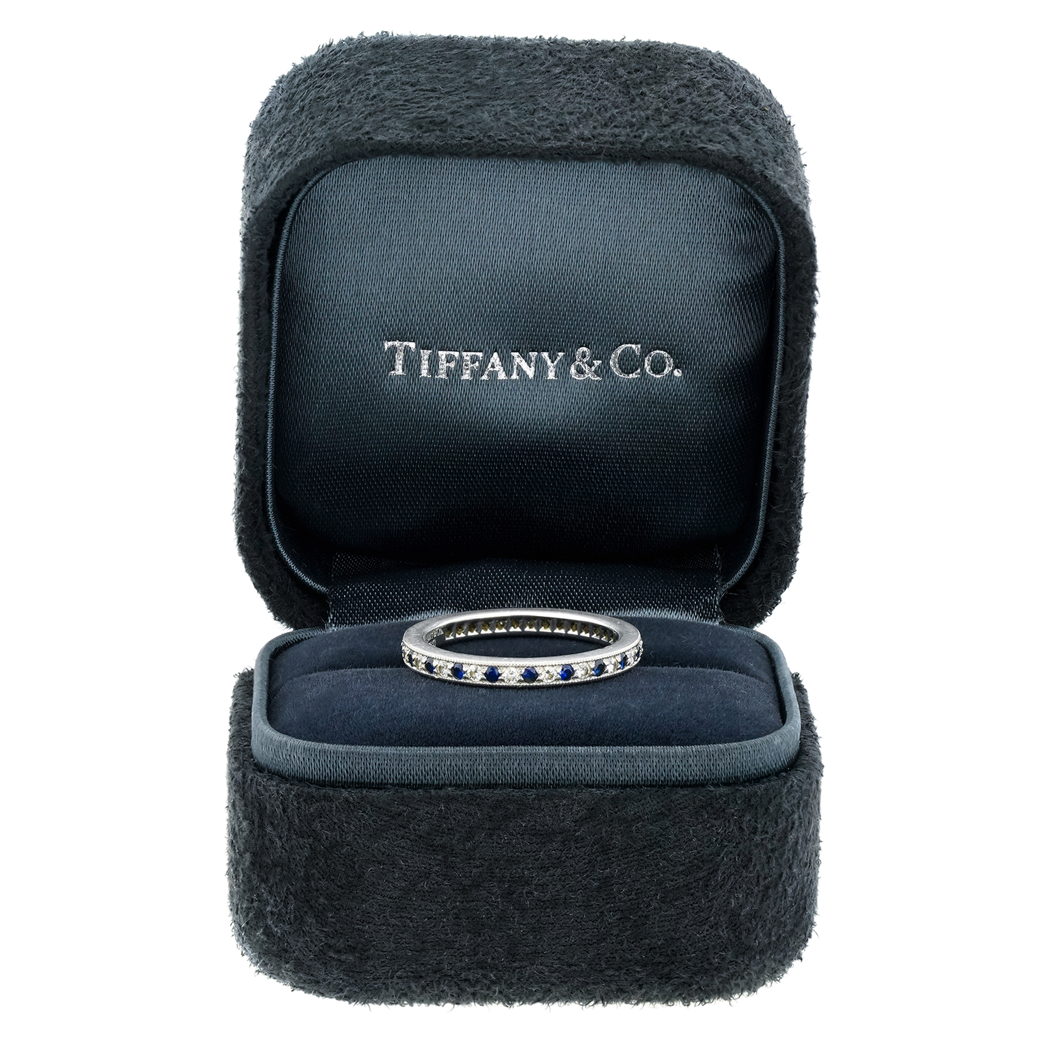 Circa 2000s, Platinum, Tiffany & Co. Set with .30 carats of brilliant white diamonds (G color and VS clarity) and .35 carats of gorgeous sapphires, this Tiffany eternity band is a classic. Excellent condition.