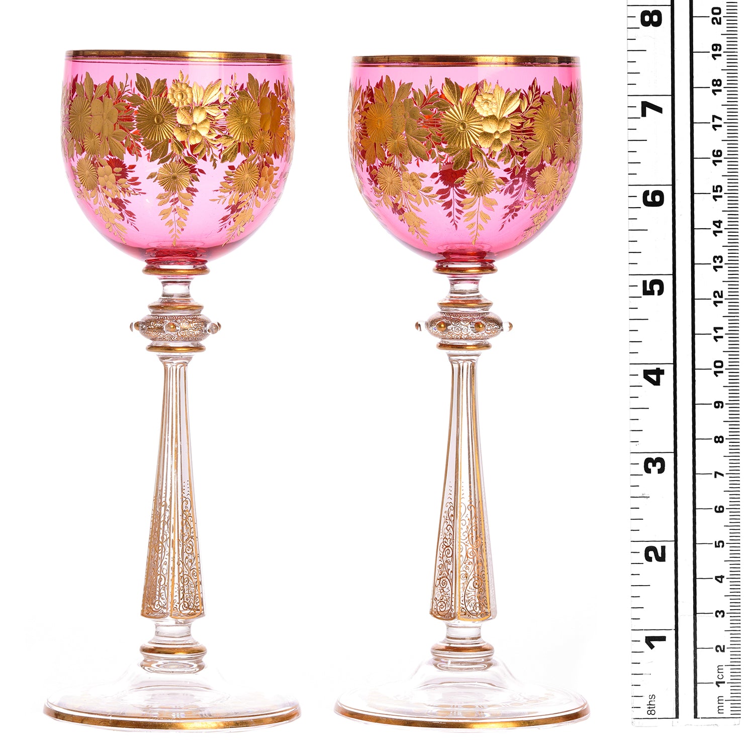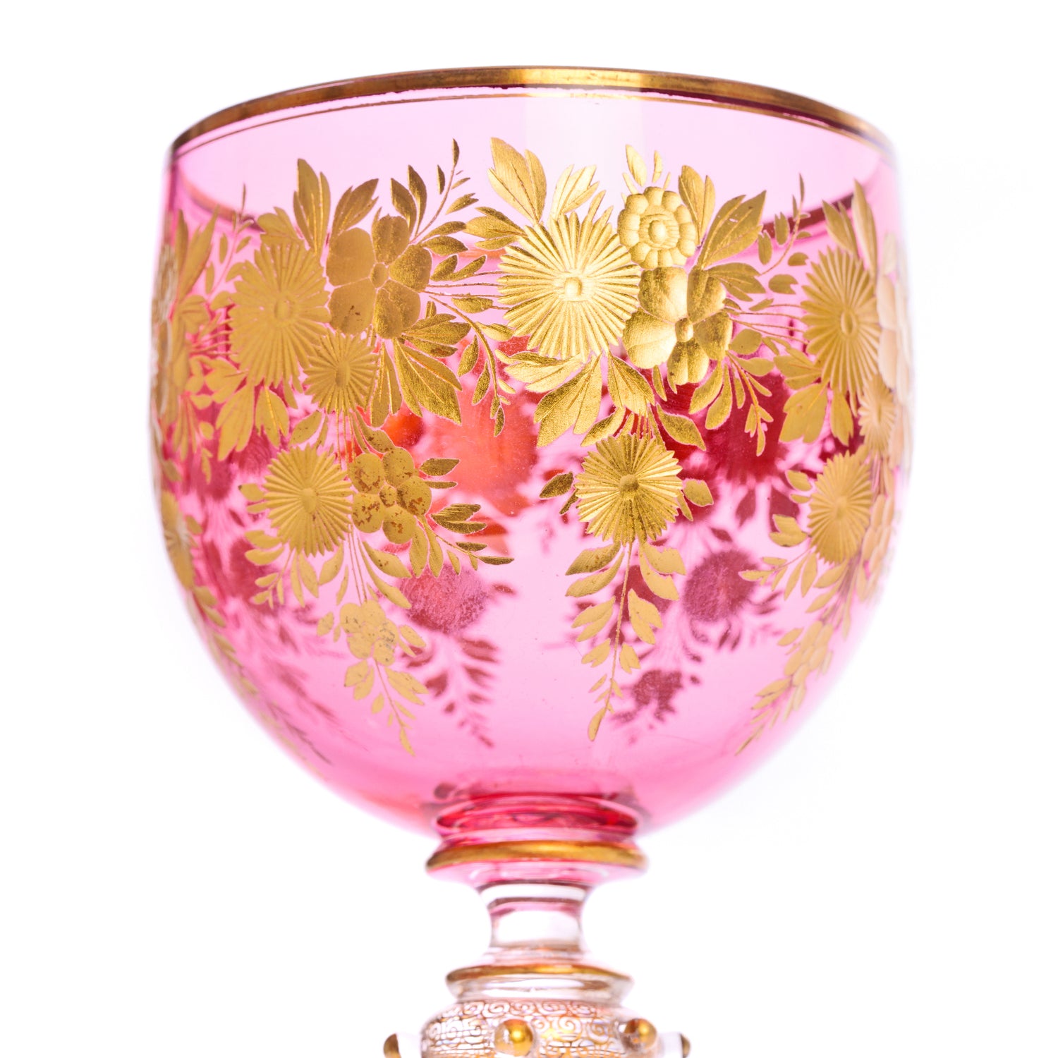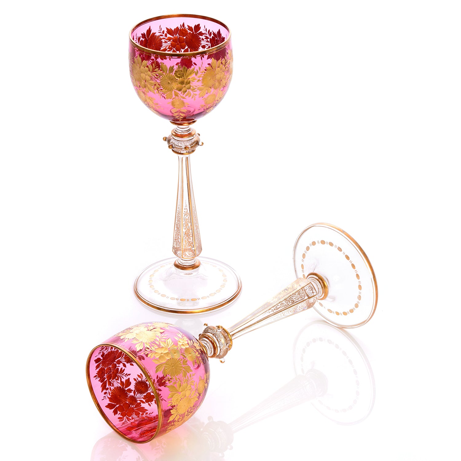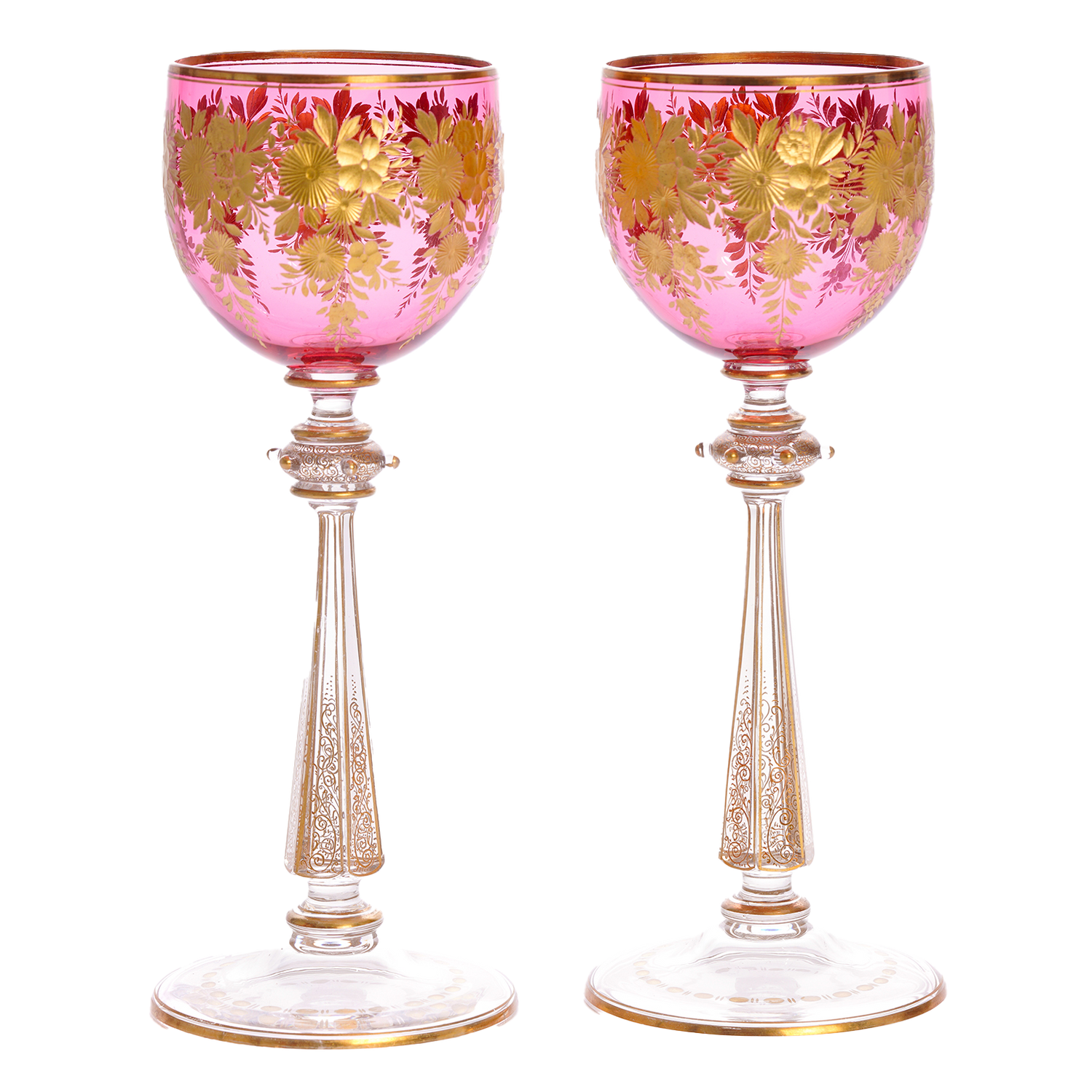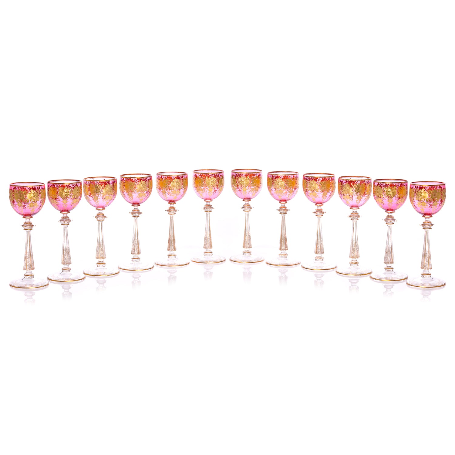 Circa 1880s, by Ludwig Moser, Austria. Presented is a set of twelve pink cut and gilded wine glasses. The delicate pink with lavender undertones is rare, and the gilded cut-work complements it perfectly. The time and skill that went into creating a masterwork of this caliber is a testament to the artistry and ingenuity of the cutters and designers at Moser. Excellent condition.