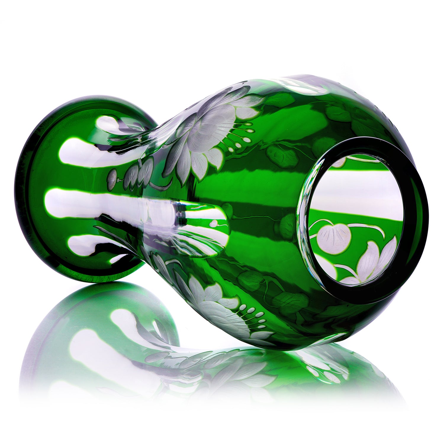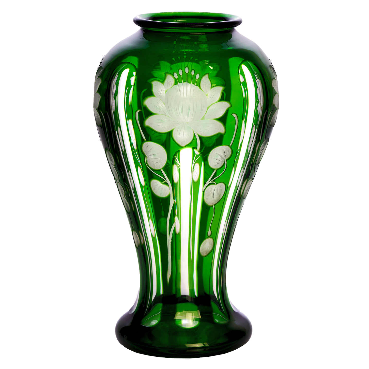 Circa 1915-20s, by Libbey Glass Co., Cambridge, Massachusetts. This stunning Art Nouveau to Art Deco Vase features an intricately cut design on gorgeous green glass. The look is antique meets au courant. Excellent condition.