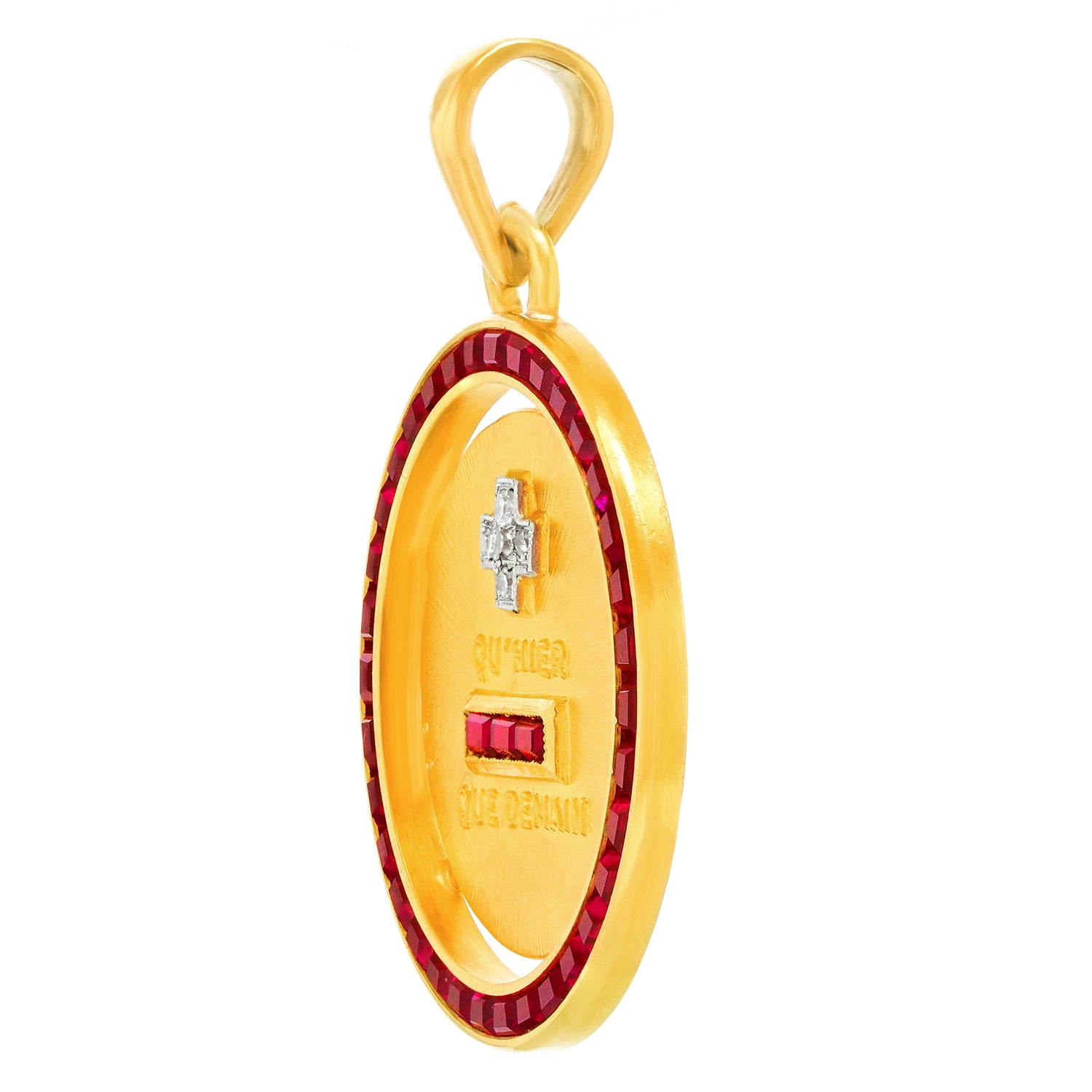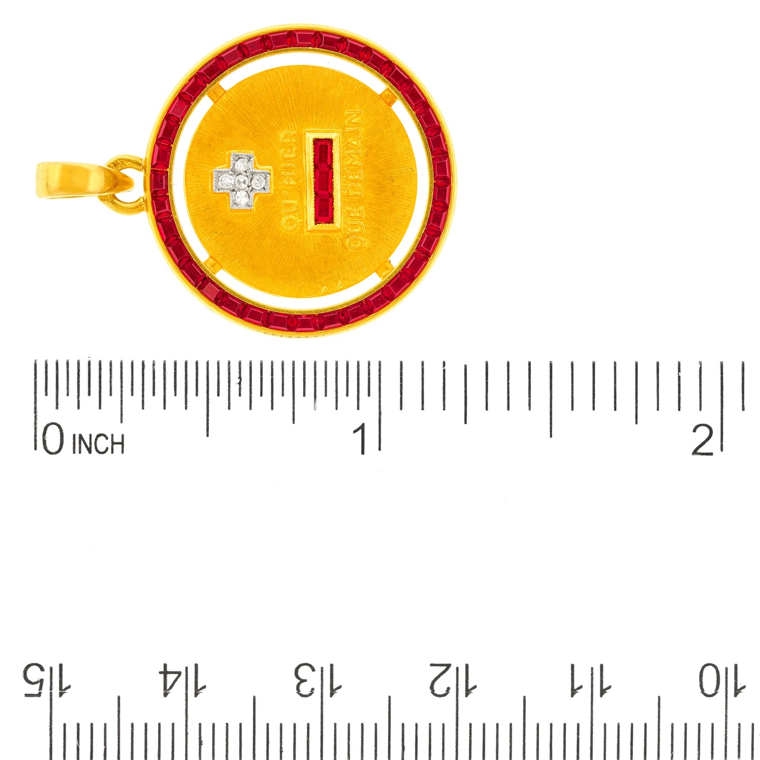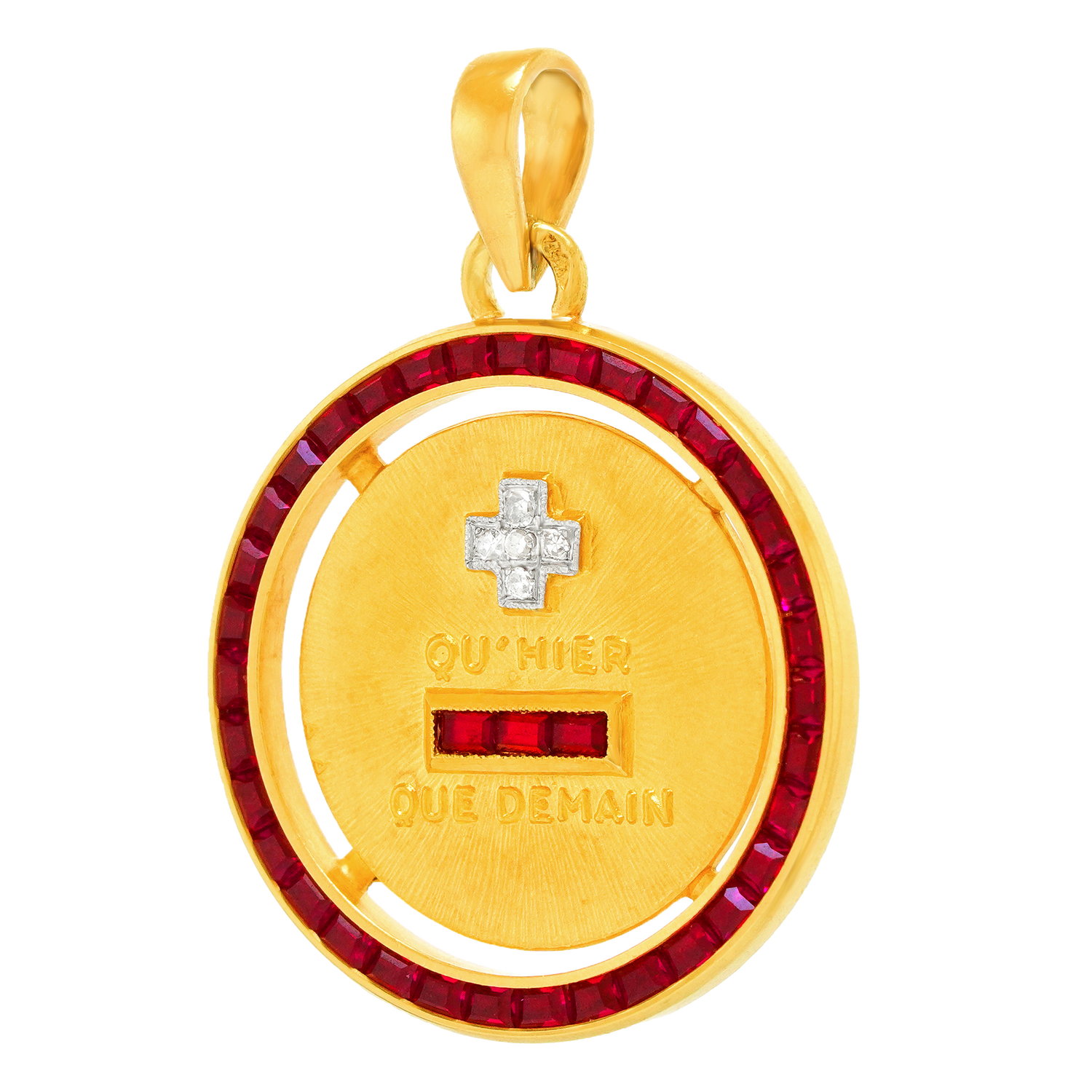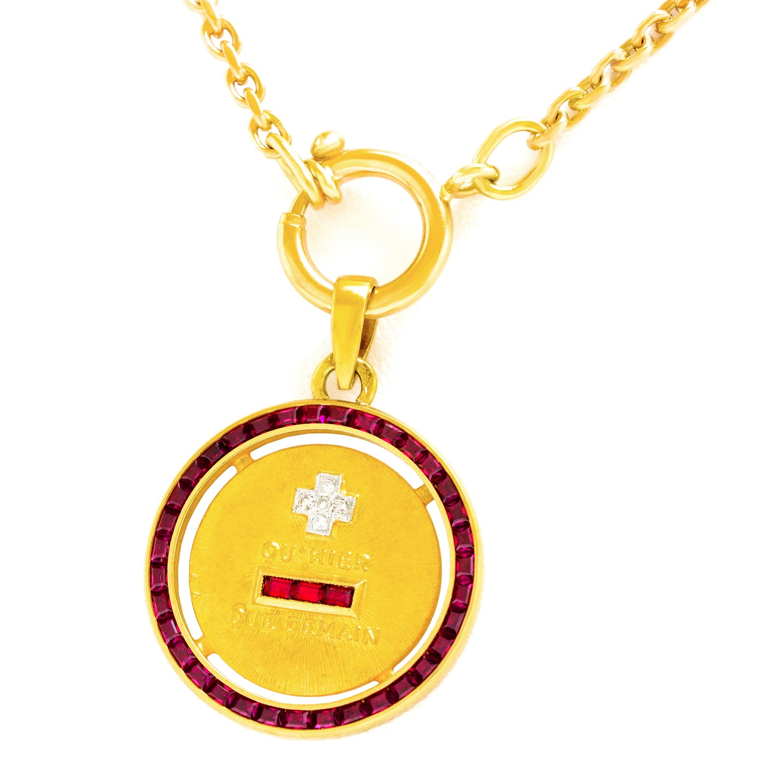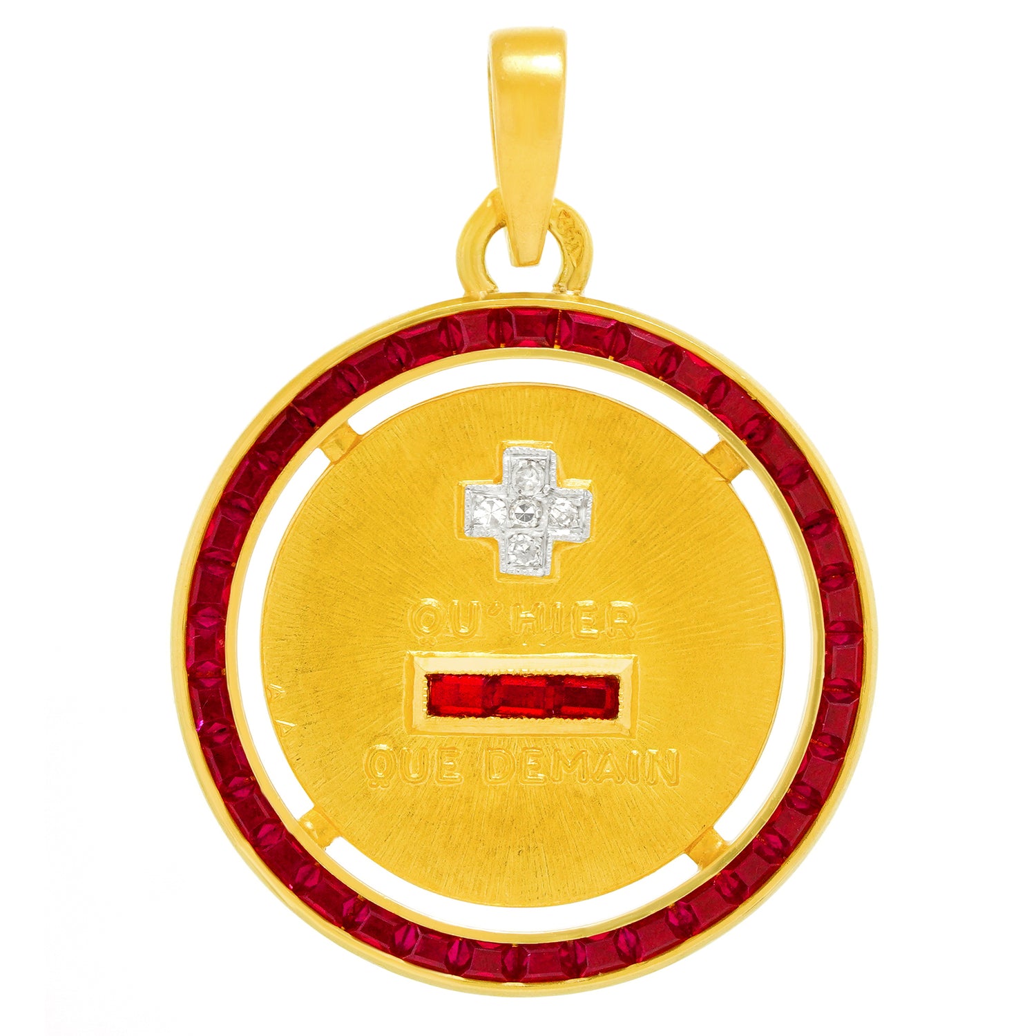 Circa 1920s, 18k, France. This chic Art Deco pendant, with its romantic "I love you more than yesterday and less than tomorrow" message, is beautifully detailed and completed by 1.50 carats of gorgeous rubies and .025 carats of brilliant white diamonds. The sentiment is all about love and commitment, timeless concepts, relevant always. Oh yes, and it's cool, hip, and actually French, …perfect with your favorite talismans! Excellent condition.