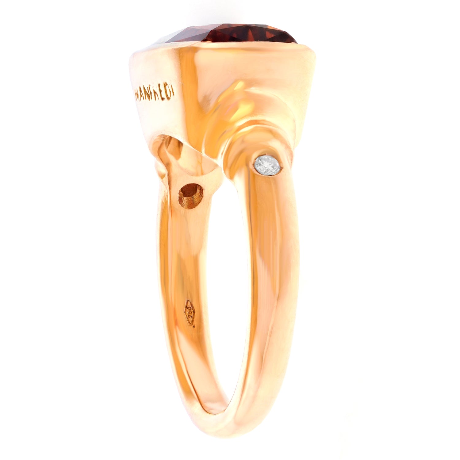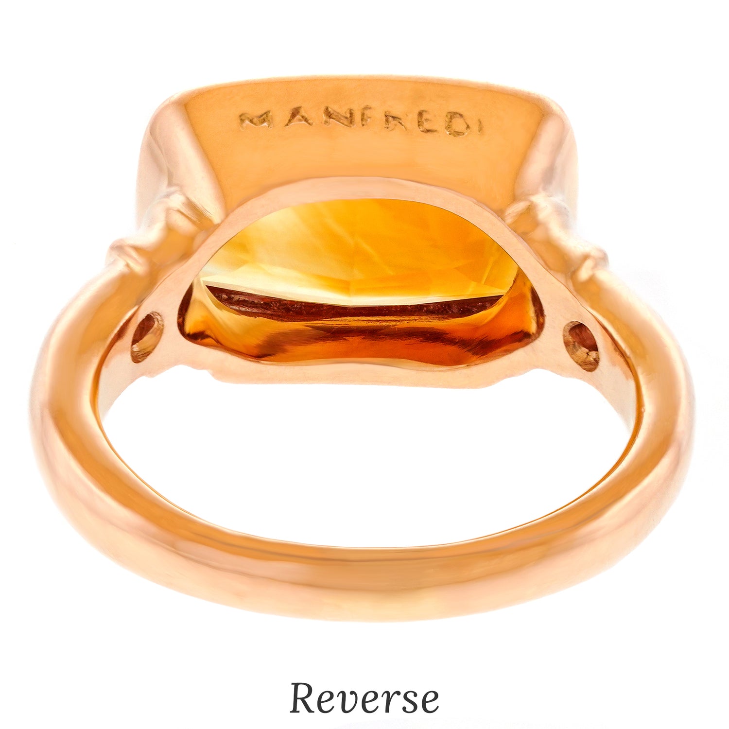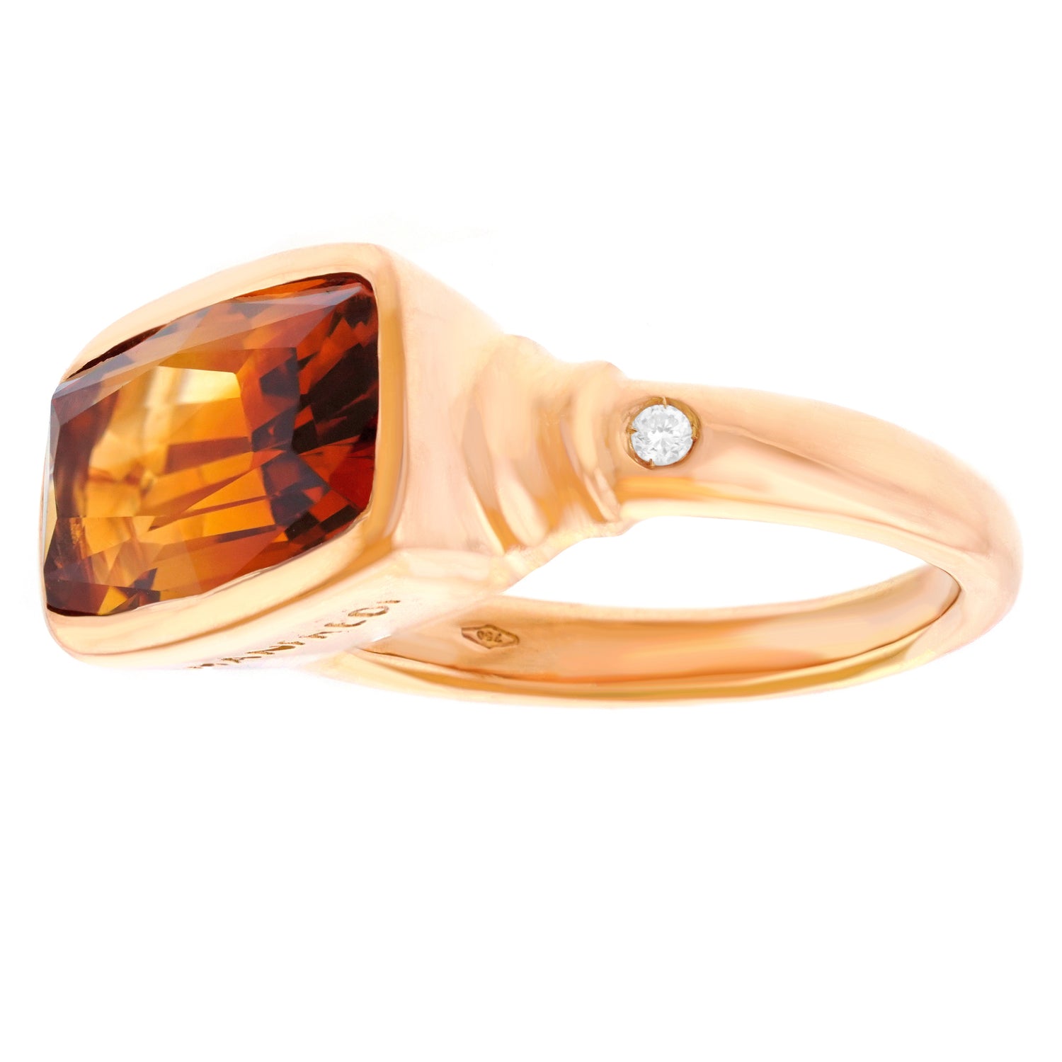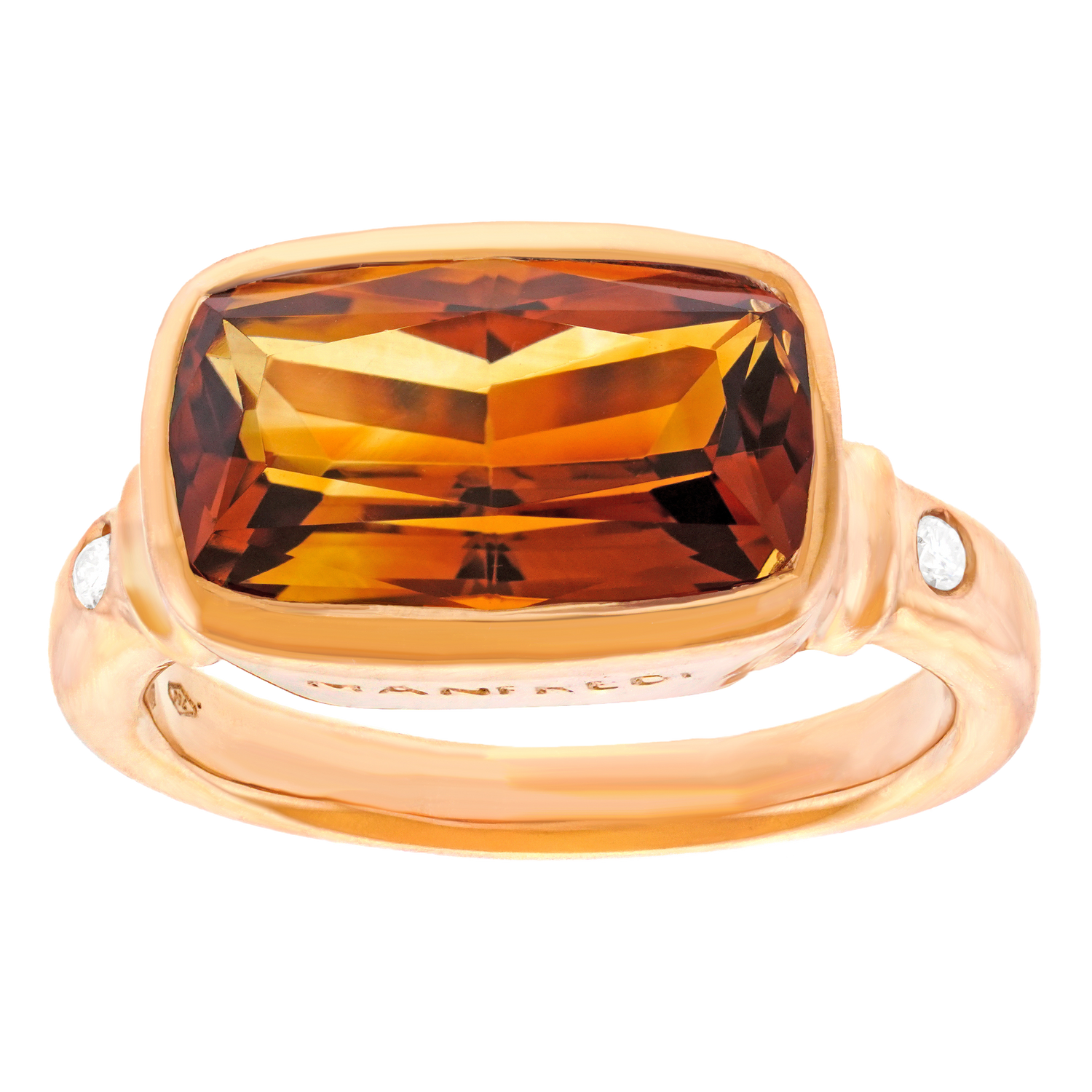 Circa 1990s, 18k, by Manfredi, Italy. The main drama of this Italian modernist jewel is a richly hued 5.0ct citrine. Crisply bezel-set, mounted east-west, and accented by diamonds, it is wearable art brought to you directly from the venerable firm of Manfredi. This ring is in excellent condition.