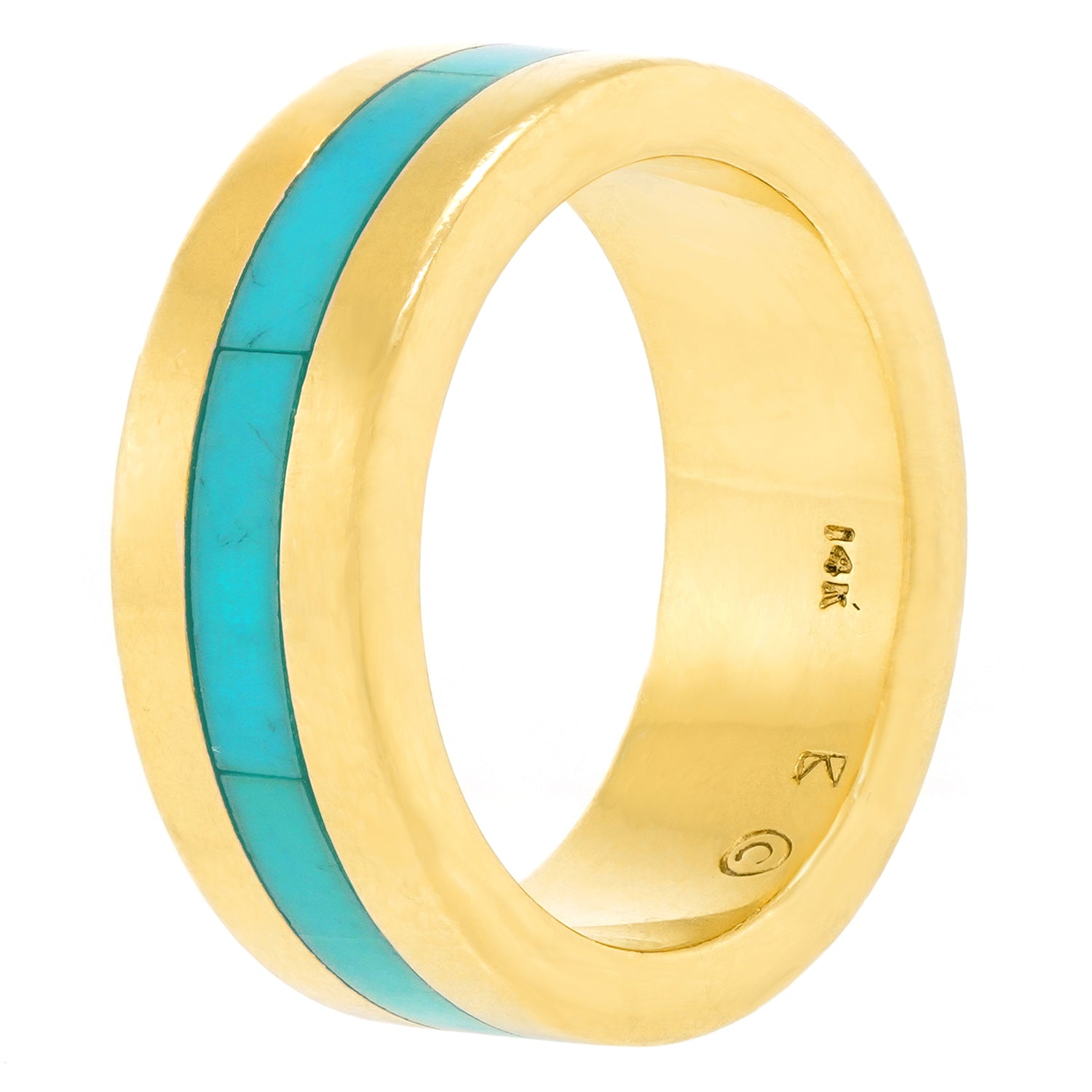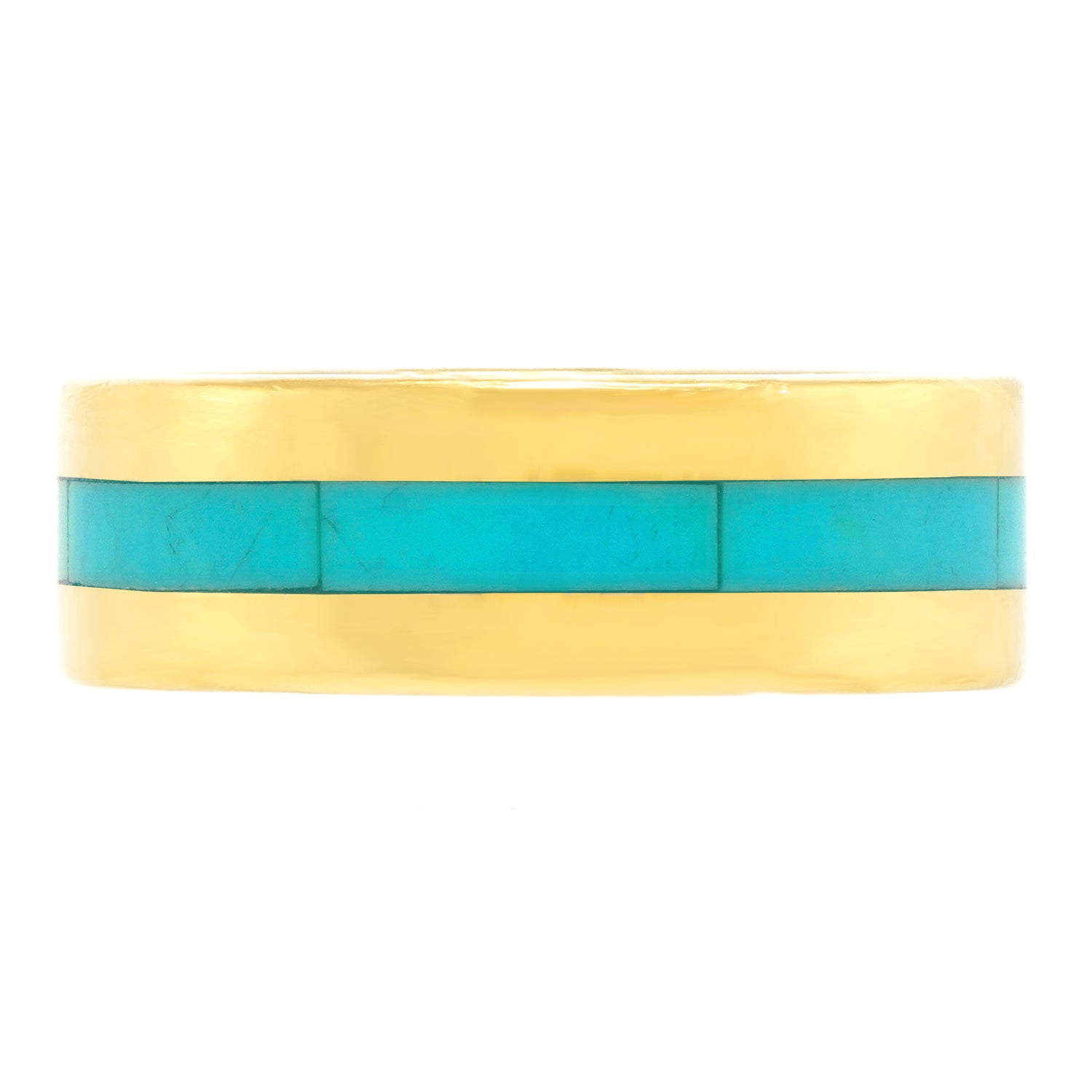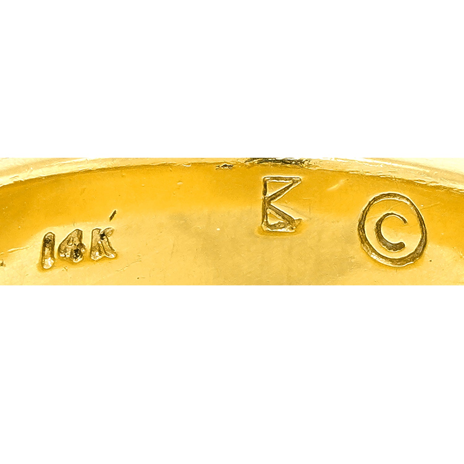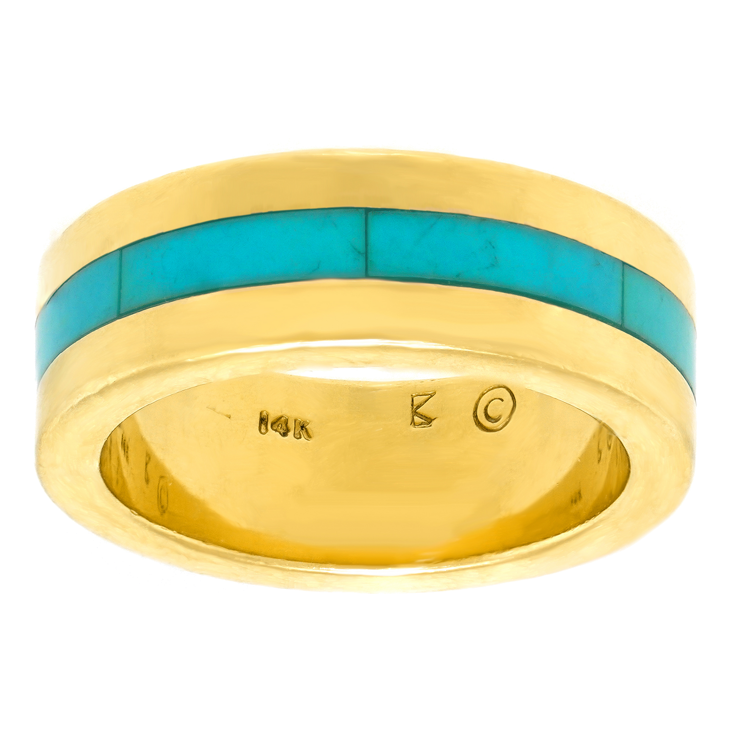 Circa 1980s, 14k, Calvin Begay, Navajo. This heavy gold ring is set with brilliant blue turquoise. Made in the eighties by Navajo goldsmith Calvin Begay, the look is unique, modern, and very chic. Excellent condition.