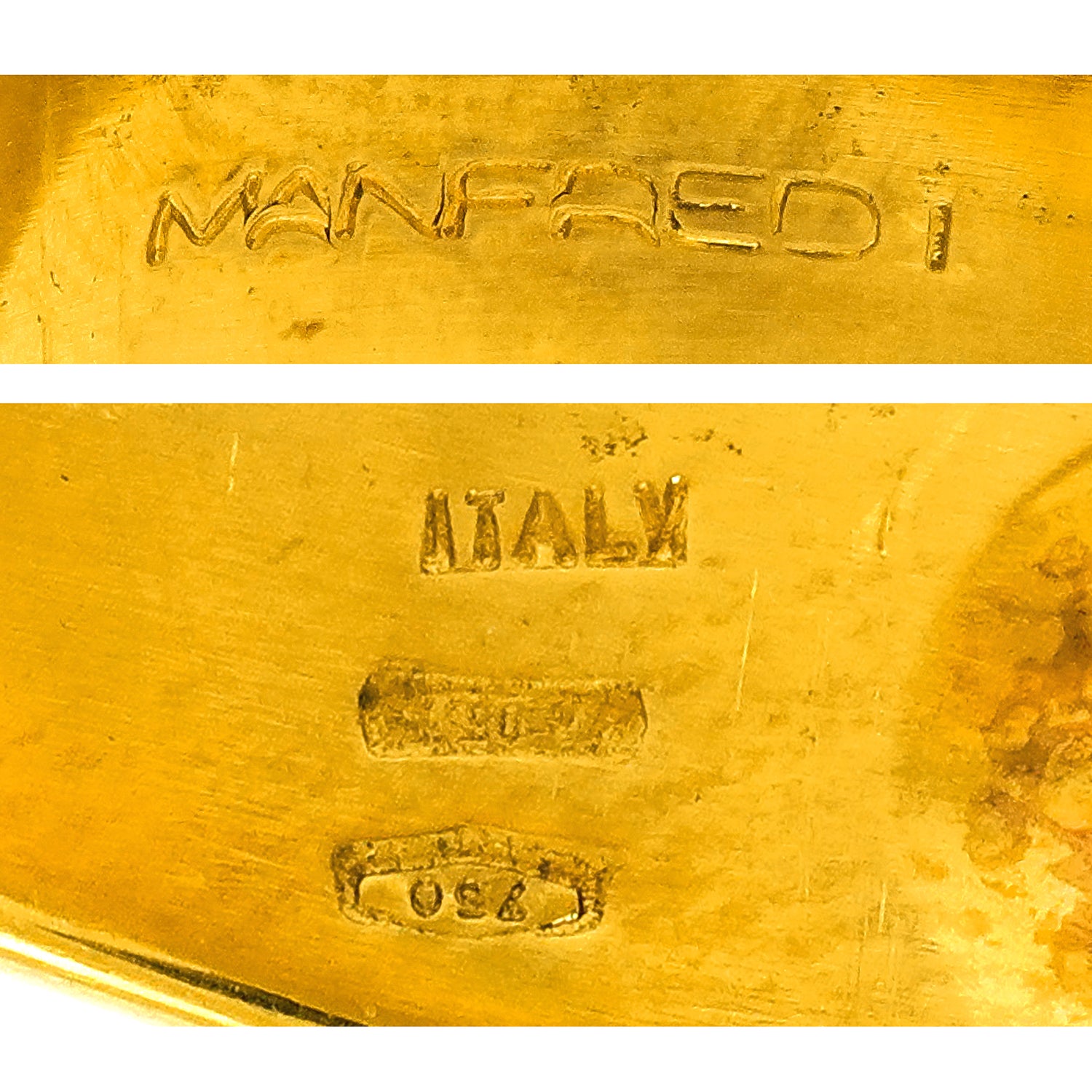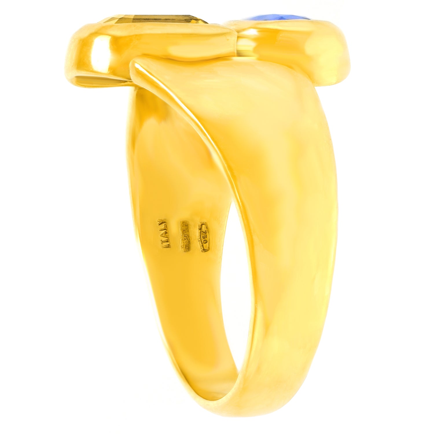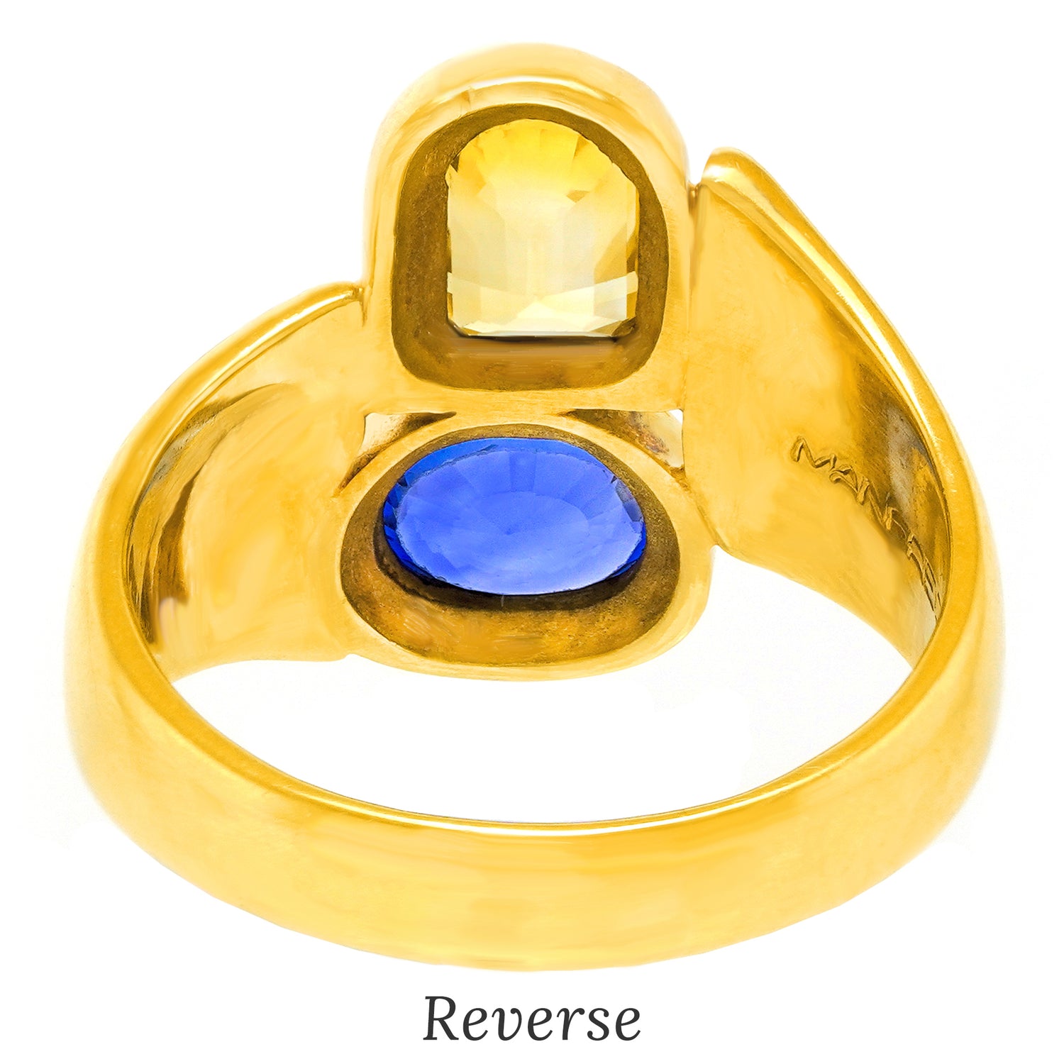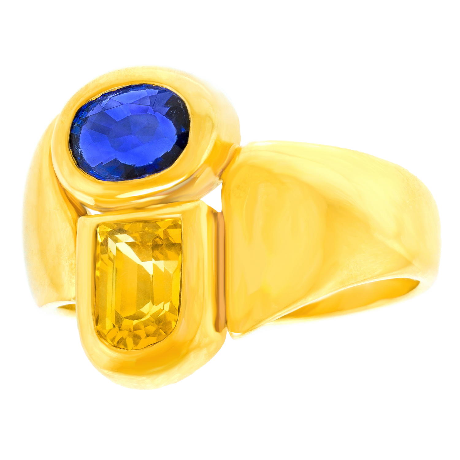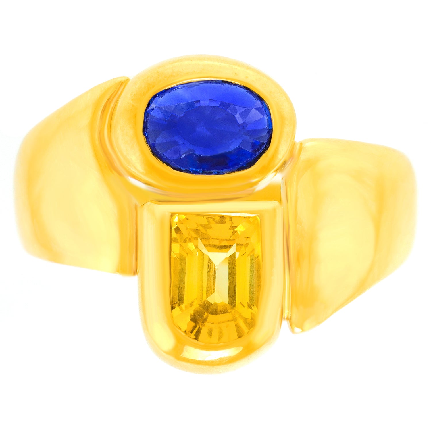 Circa 1990s, 18k, by Manfredi, Italy. Always a seamless blend of art, style, and modernity, Manfredi jewelry delights at every turn. This yellow gold ring is set with a fine blue .85 carat sapphire and a .85 carat sunny yellow sapphire. Heavy and well-made in polished 18k yellow gold, it is exceedingly comfortable and goes with everything. Excellent condition.