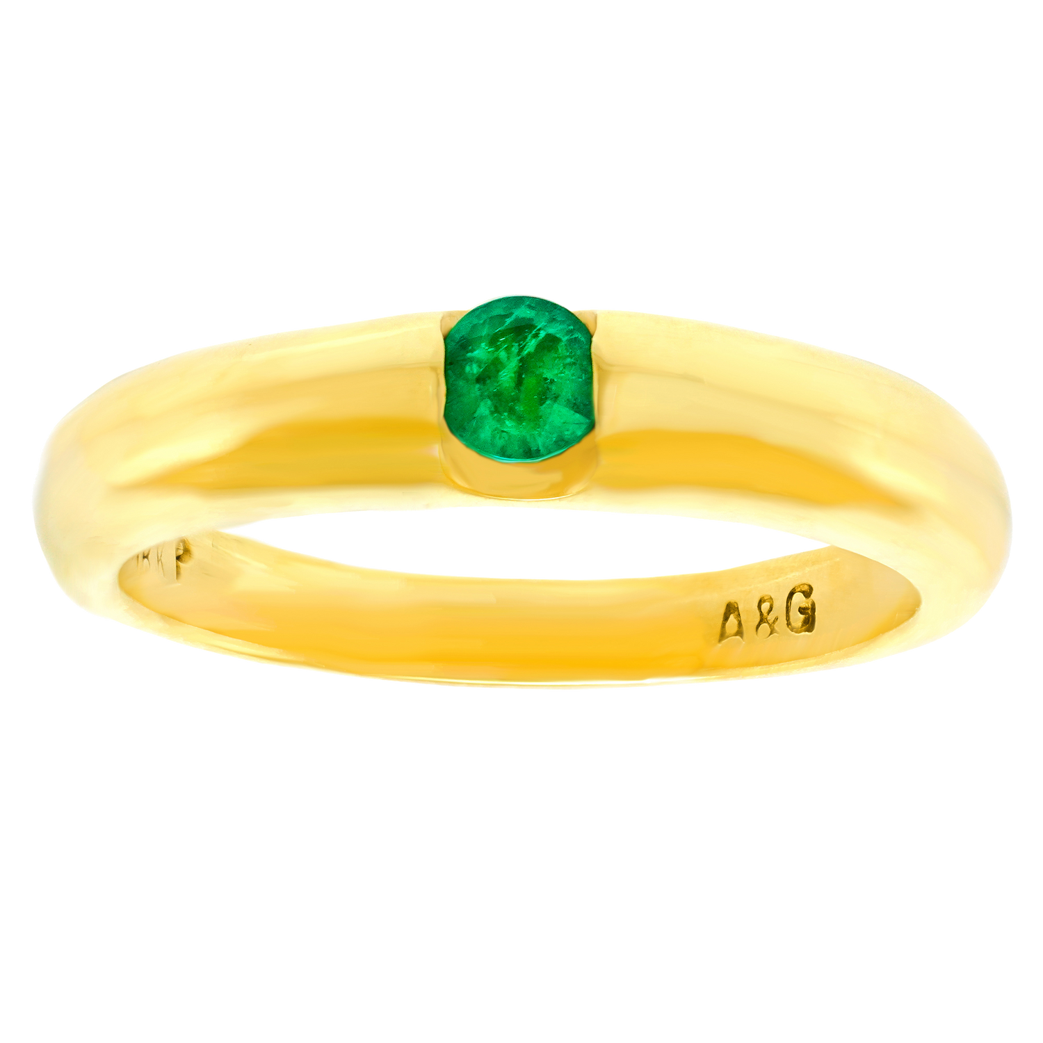 Circa 1990s, 18k. This sleek emerald ring is timeless fashion. Perfect on its own and fabulous in a stack, it is heavy and well-made. The .15 carat emerald is extremely bright and lively. Excellent condition.