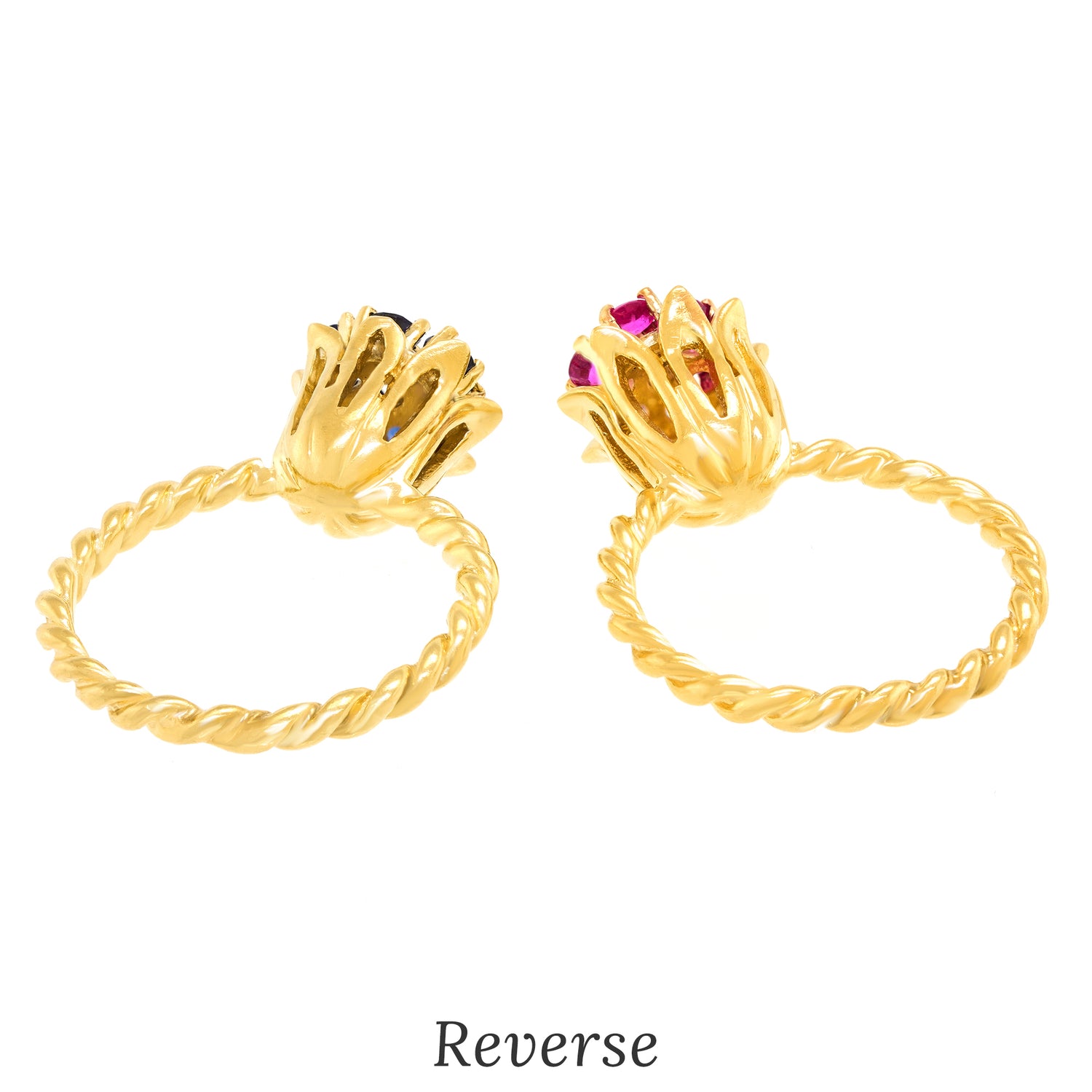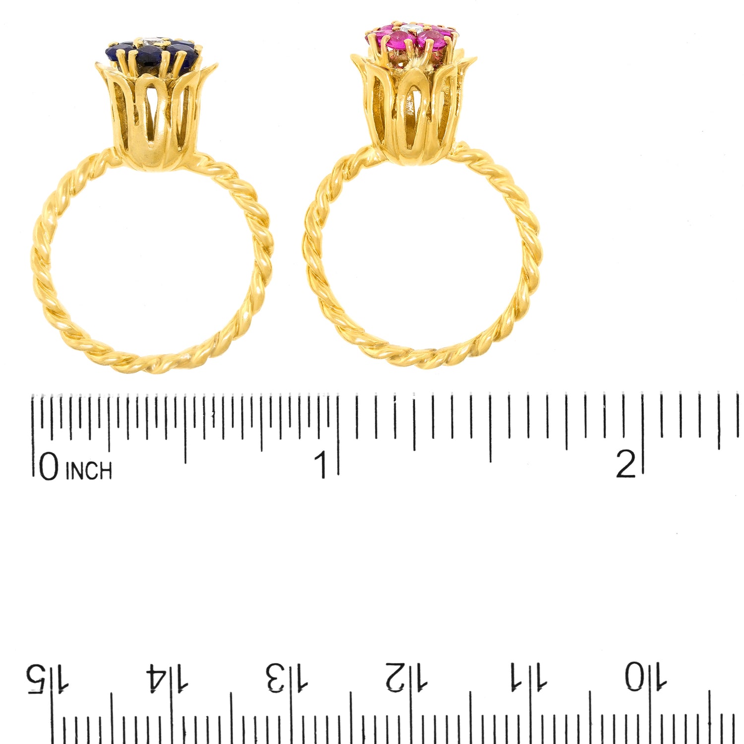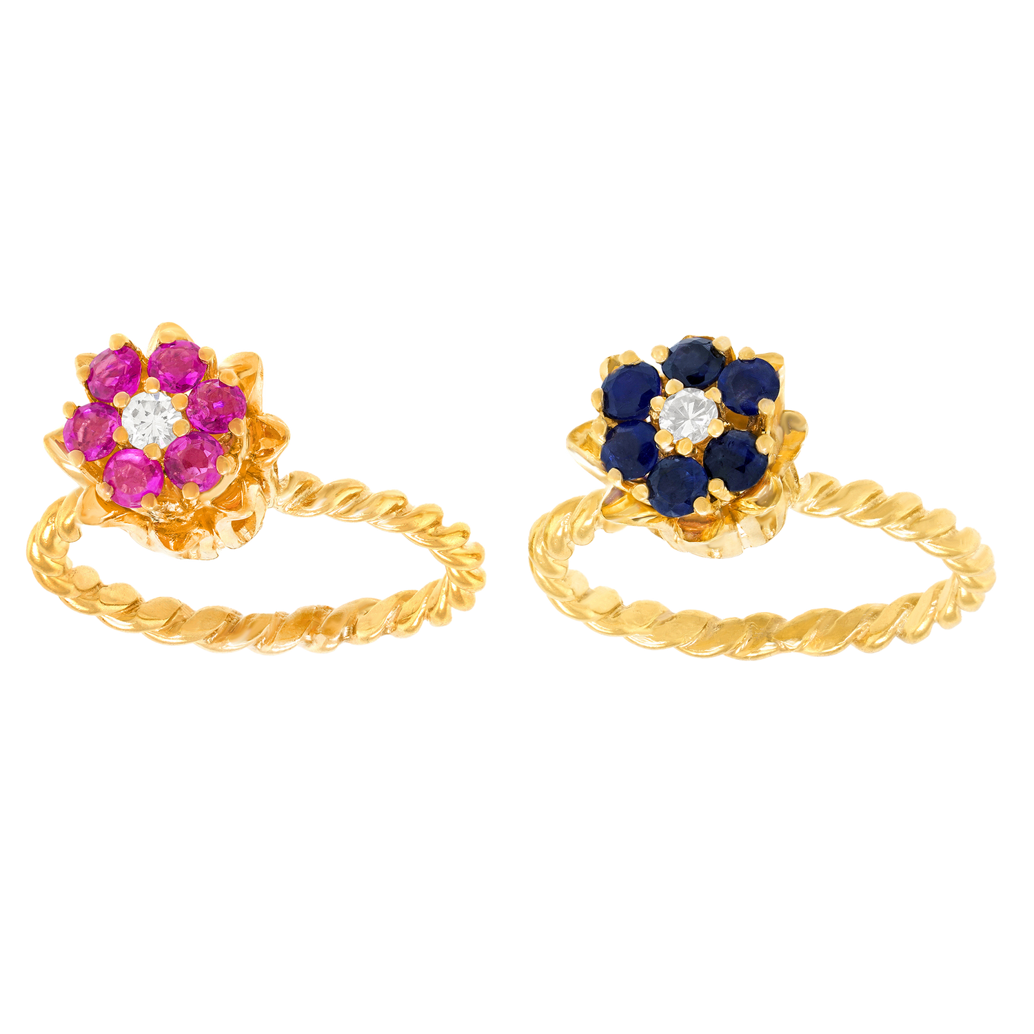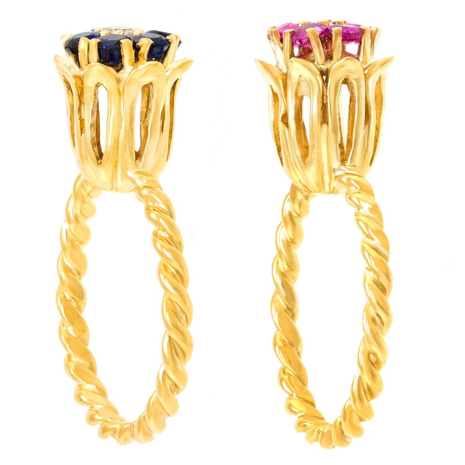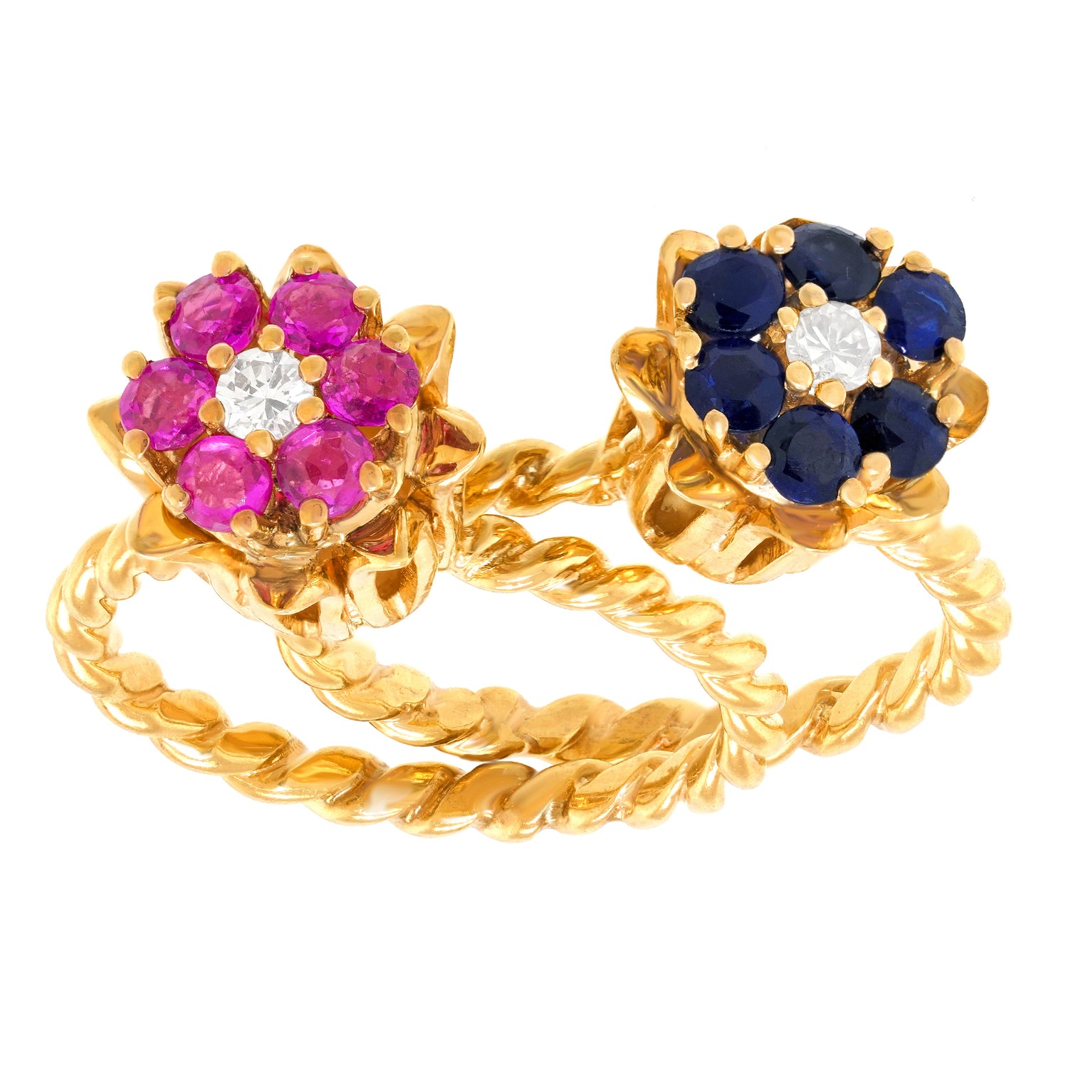 Circa 1990s, 14k, American. Pop nineties, Flower power, this pair of sapphire and diamond-set rings is fabulous fashion! Flowers make me happy, and Oh!, color makes me happy too. This ring features .50 carats of rich red rubies and .50 carats of blue sapphires, fine white diamonds complete the picture. Well-made in fourteen-karat yellow gold, these American jewels are in excellent condition.