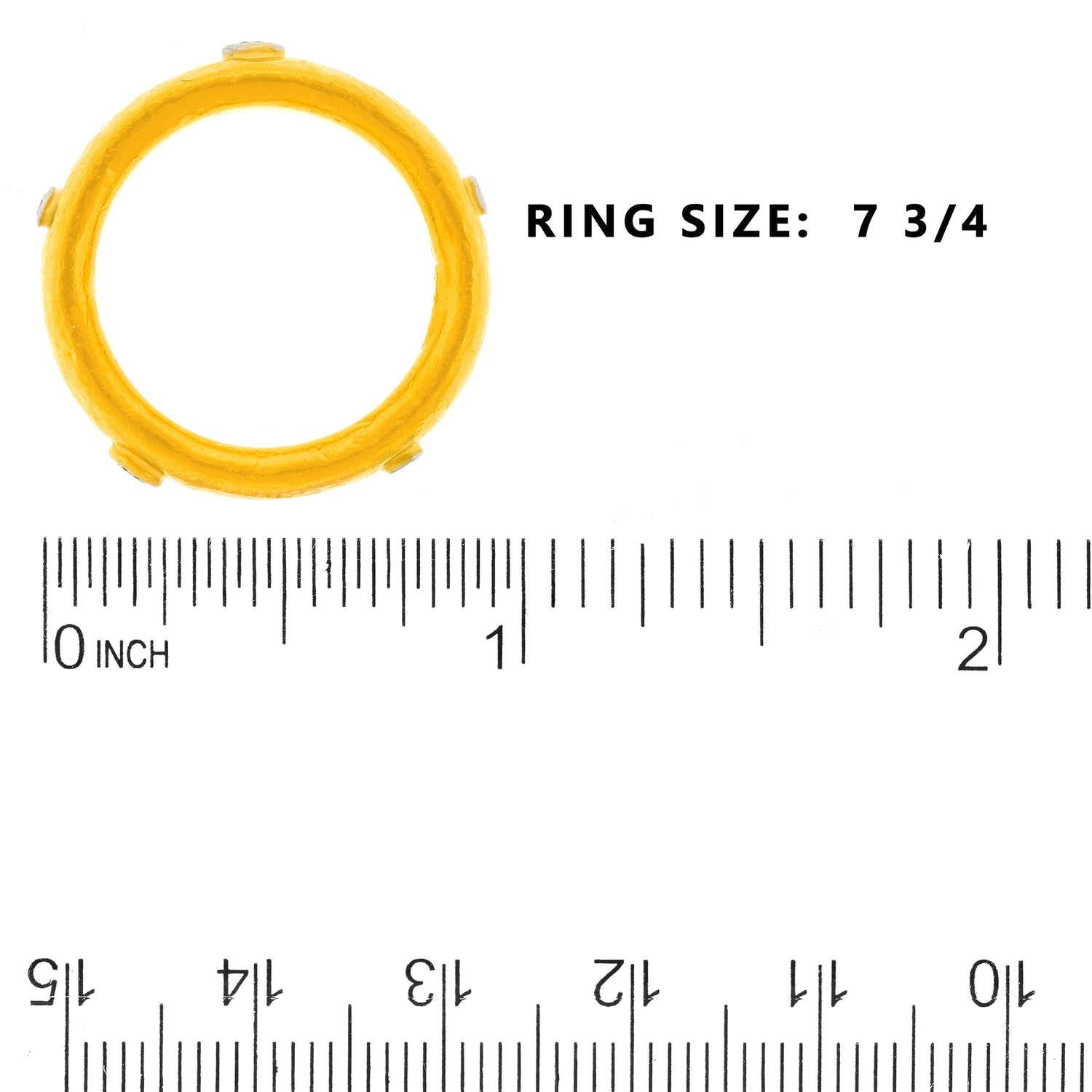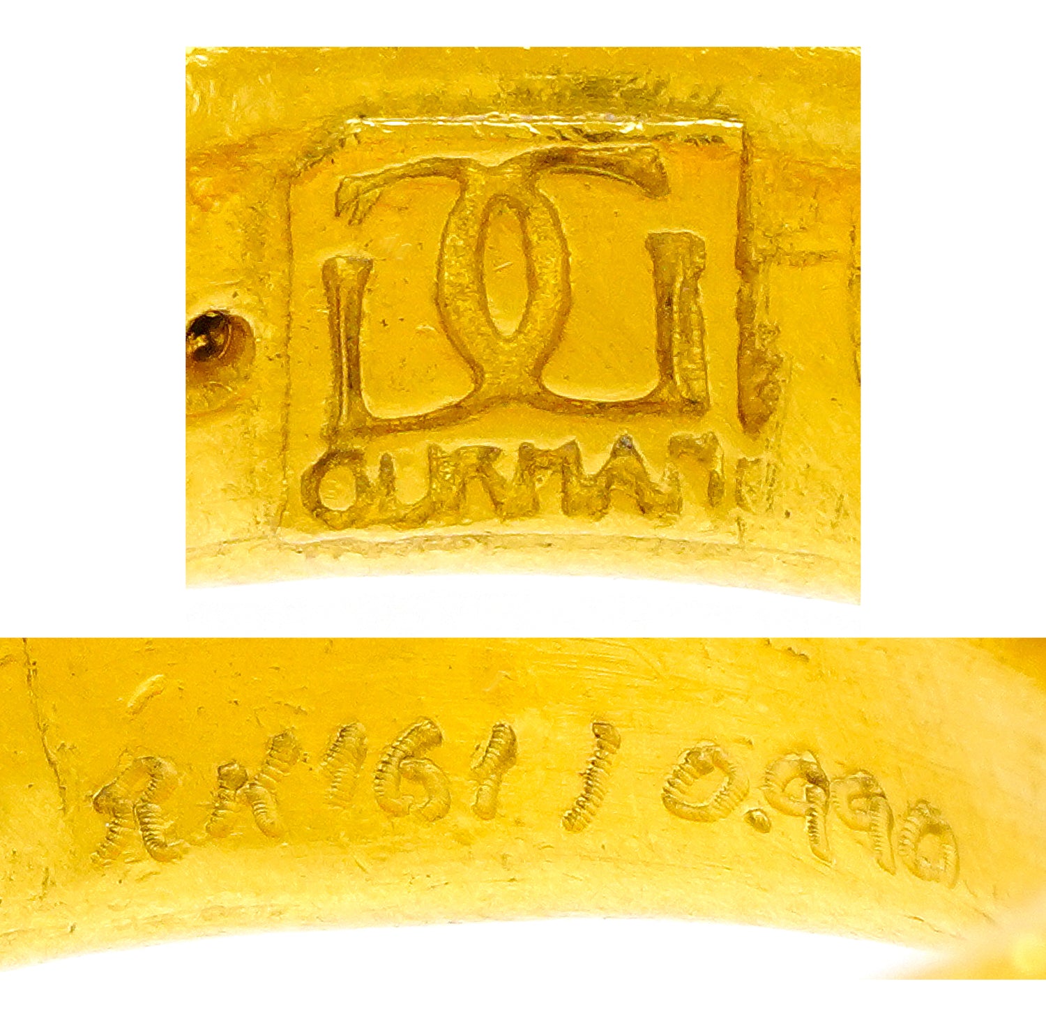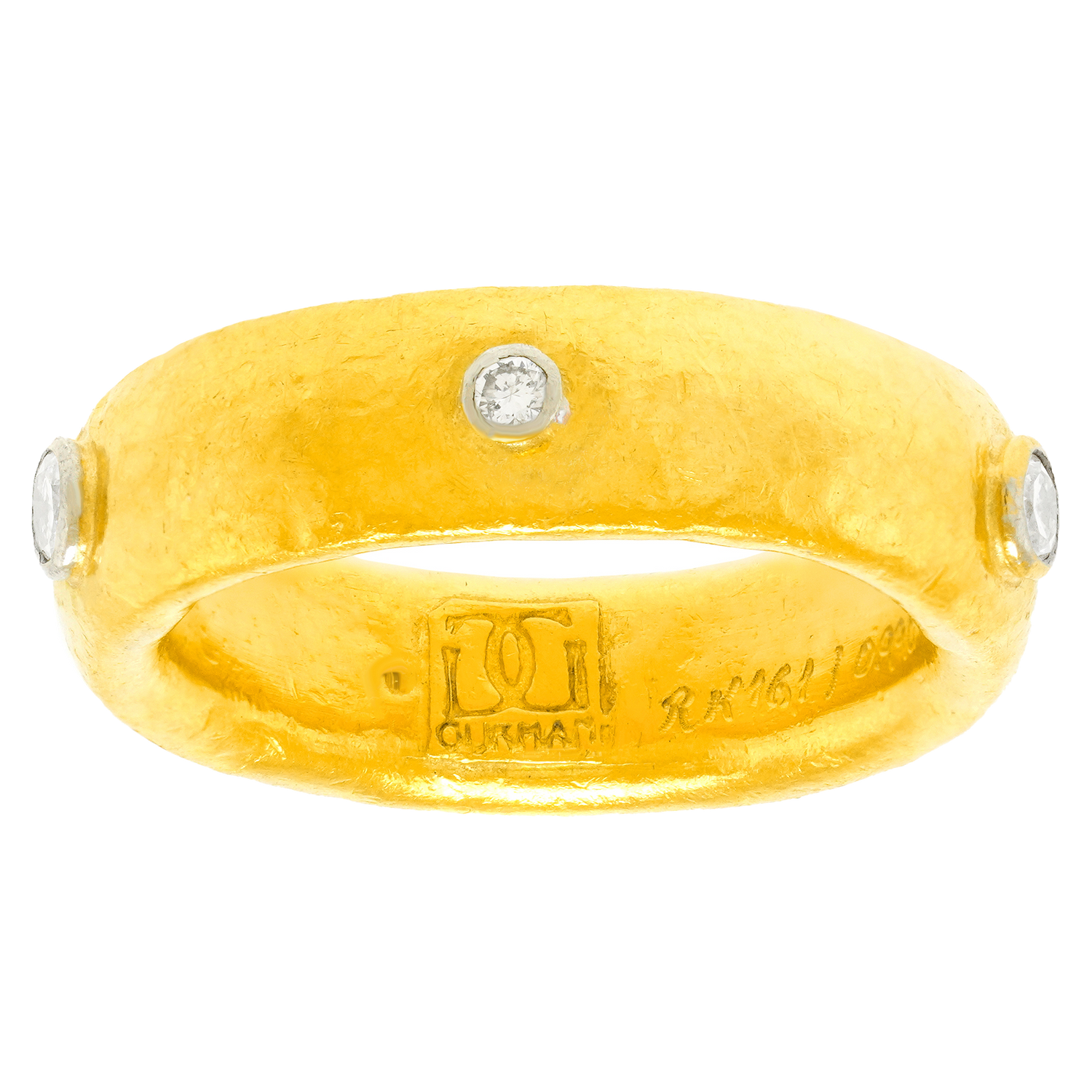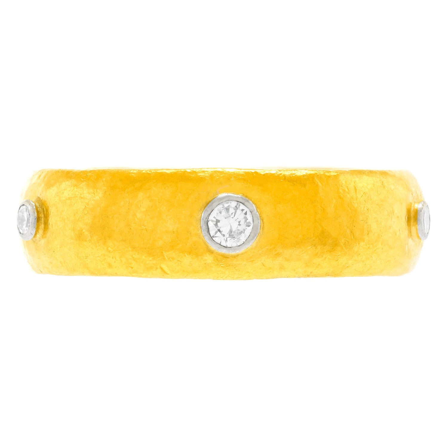 Circa 1990s, 24k, by Gurhan, Turkey. This fashion-essential 24k pure gold diamond-set ring by Gurhan combines modernist aesthetics with old-world élan. Its rough ancient world motif has a primacy that is elegant and easy to wear. His signature use of 24-karat yellow gold and hand-finished texture tastefully attracts the eye. Excellent condition.