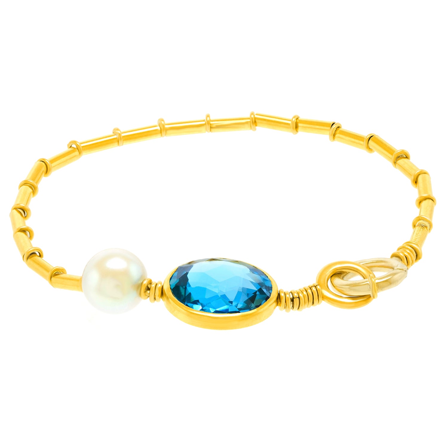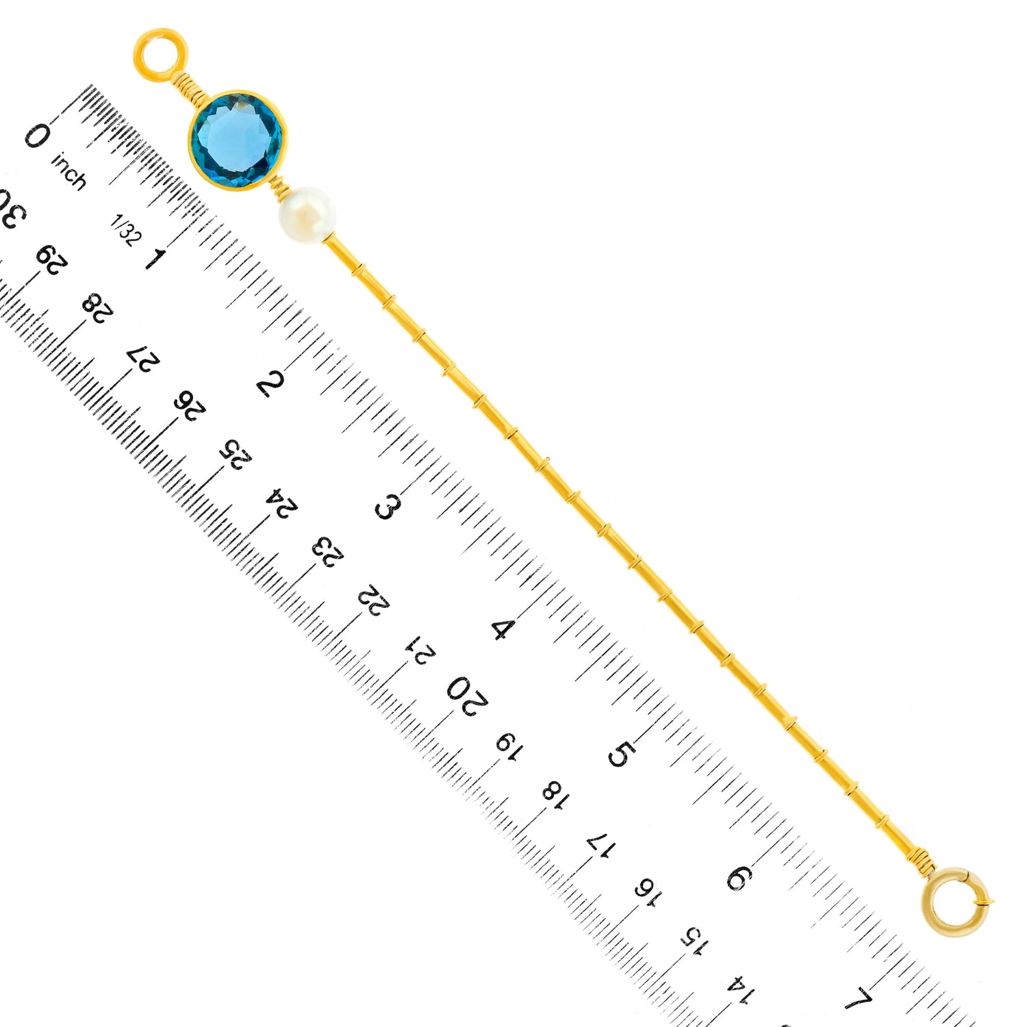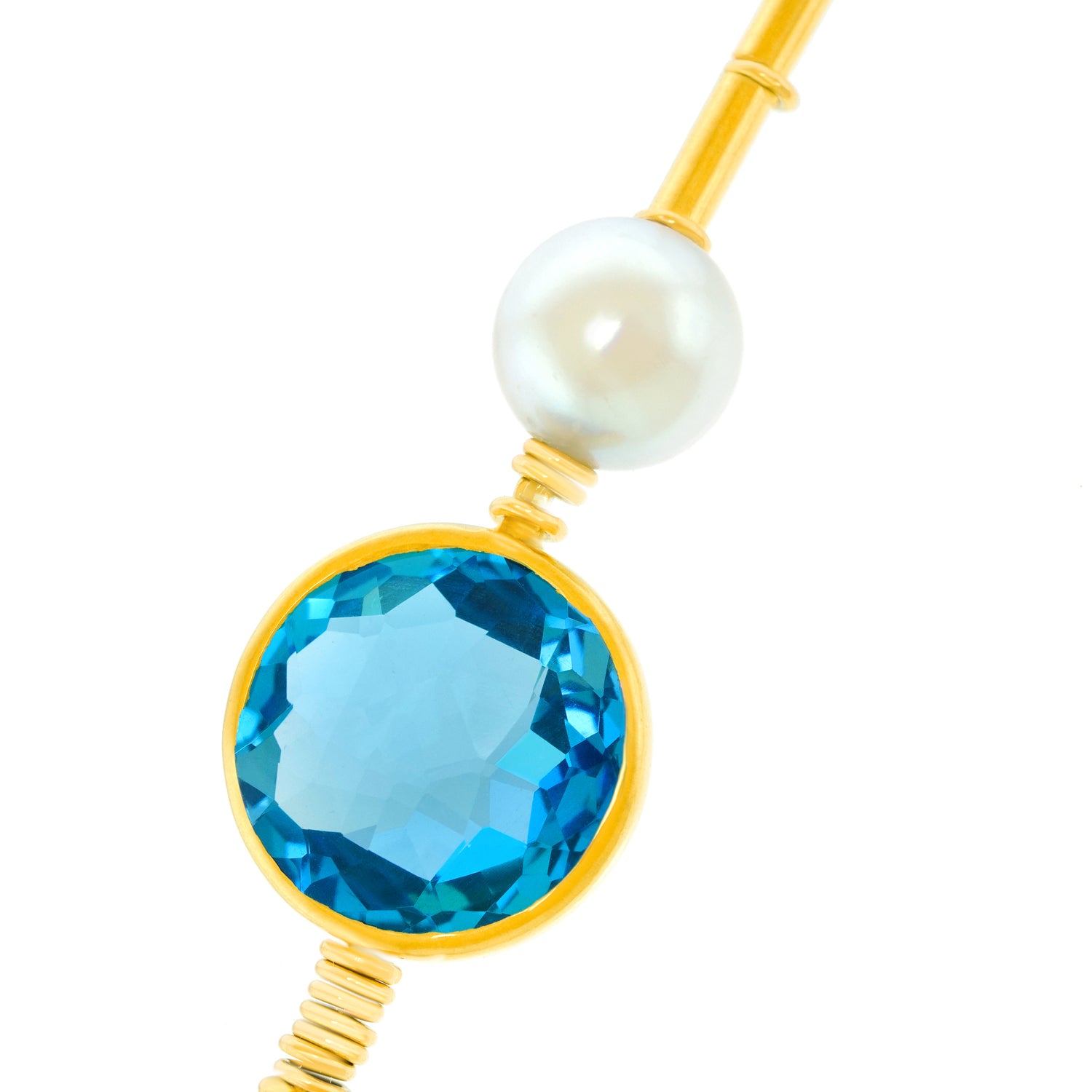 Circa 1990s, 18k, Manfredi, Italy. Brilliantly every day, this chic Italian design bracelet features a luminescent pearl, modernist tubular elements, and a vibrant blue topaz. The look is beachy casual for everywhere but the beach! Meticulously made and in excellent condition.