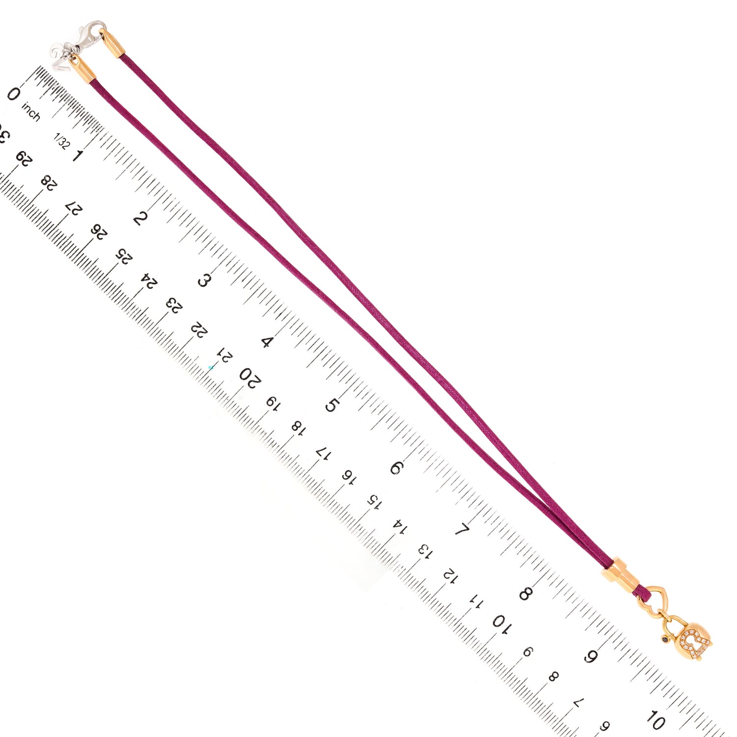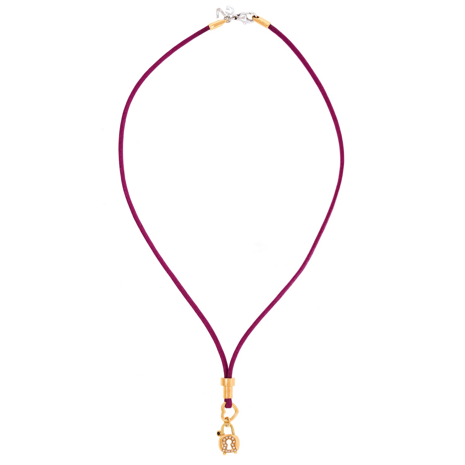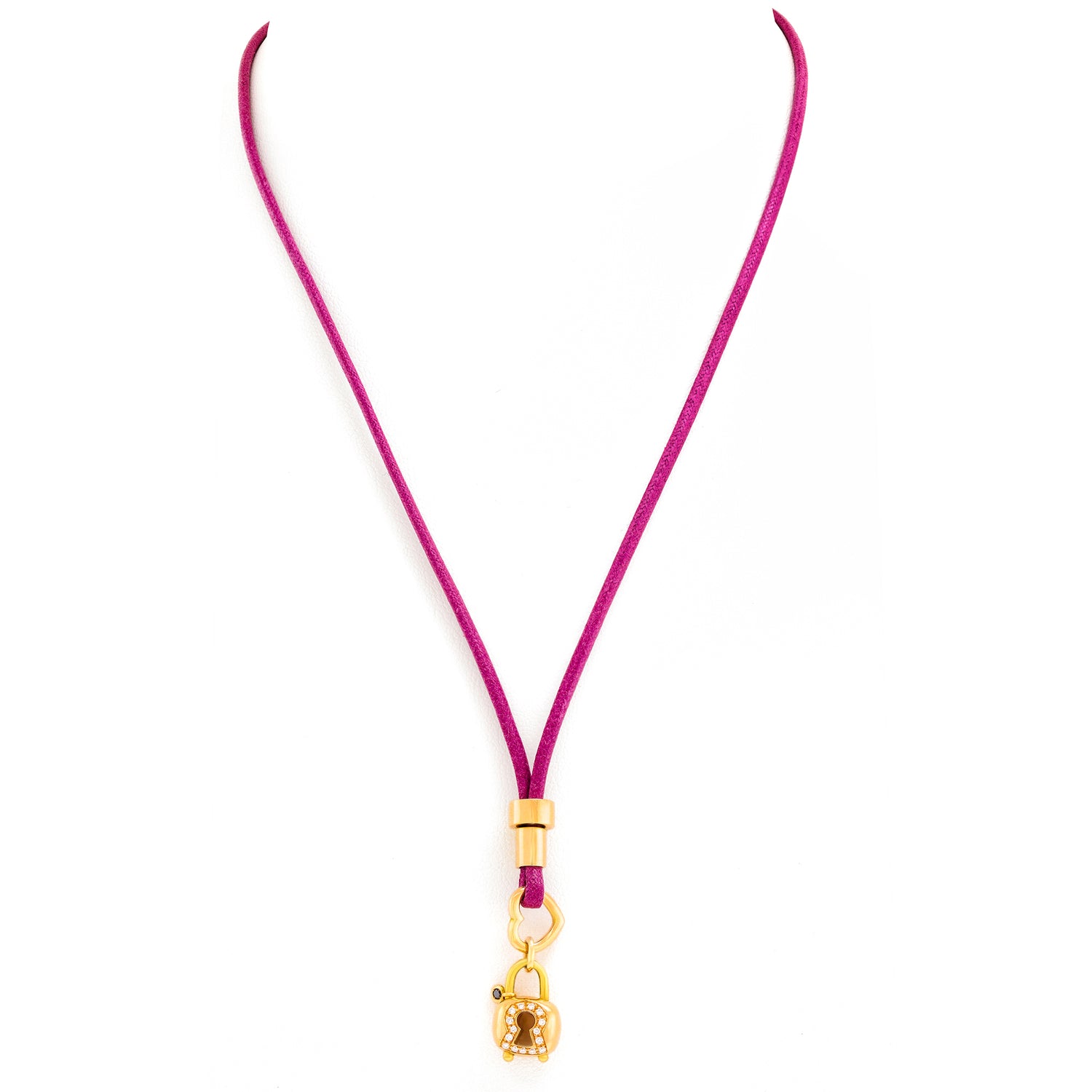 Circa 2000s, 18k, by Giorgio Visconti, Italy. Lock jewelry dates back to the Victorian era. Symbolizing commitment and love, the romantic theme is timeless, and this fresh Italian interpretation is playful. Eighteen-karat yellow gold elements are strung on a pink cord and set with bright white diamonds (0.12 cttw G color VS clarity), this necklace is in excellent condition.