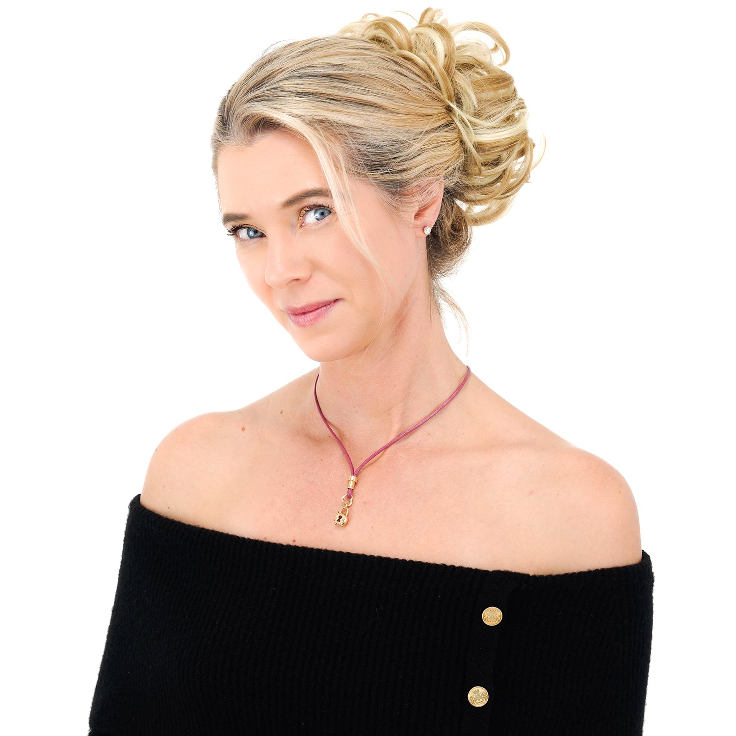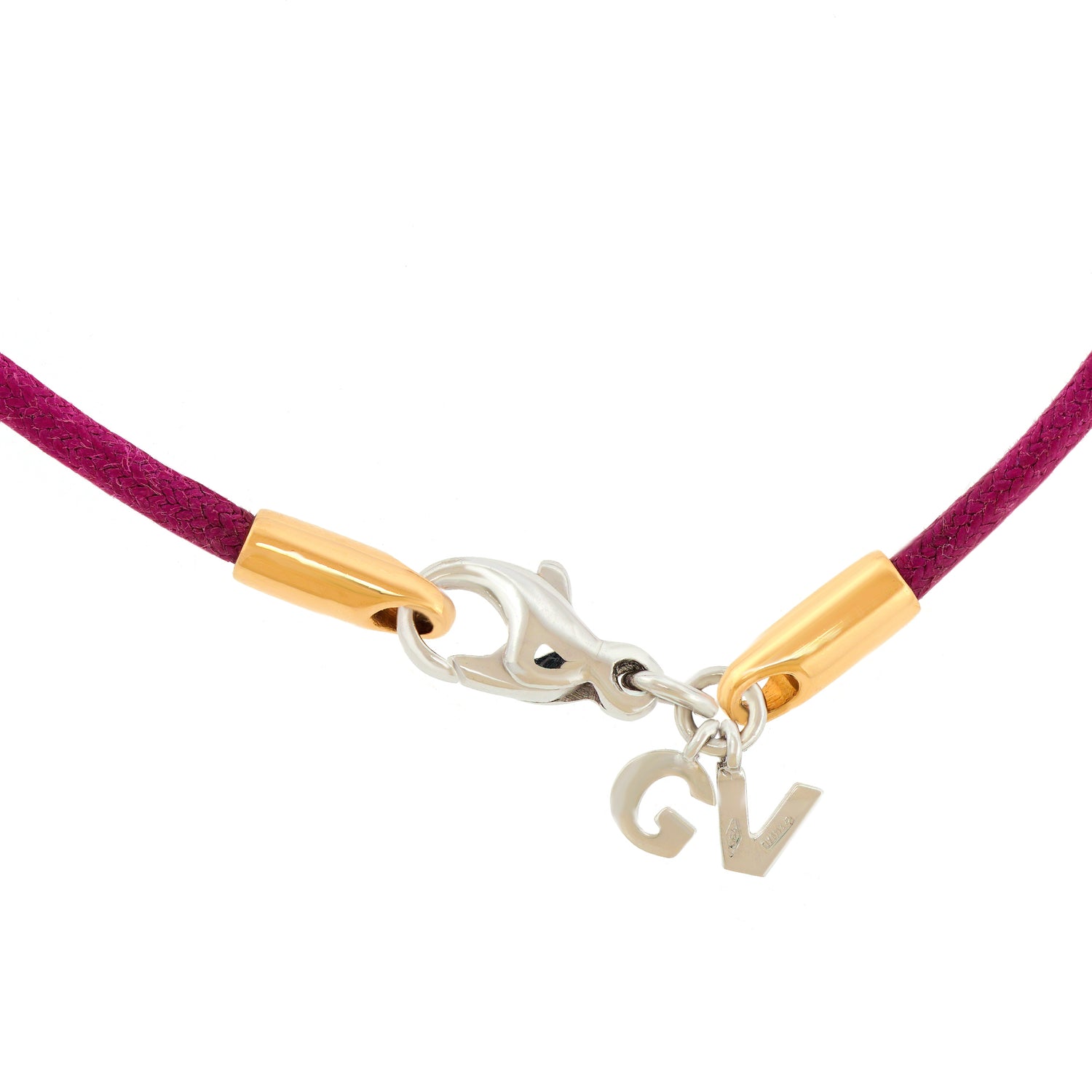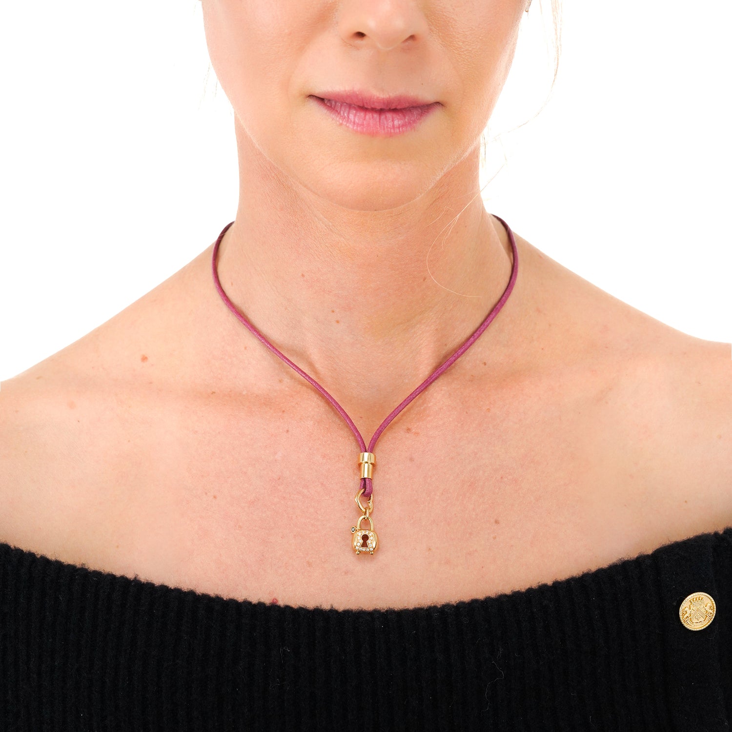 Circa 2000s, 18k, by Giorgio Visconti, Italy. Lock jewelry dates back to the Victorian era. Symbolizing commitment and love, the romantic theme is timeless, and this fresh Italian interpretation is playful. Eighteen-karat yellow gold elements are strung on a pink cord and set with bright white diamonds (0.12 cttw G color VS clarity), this necklace is in excellent condition.