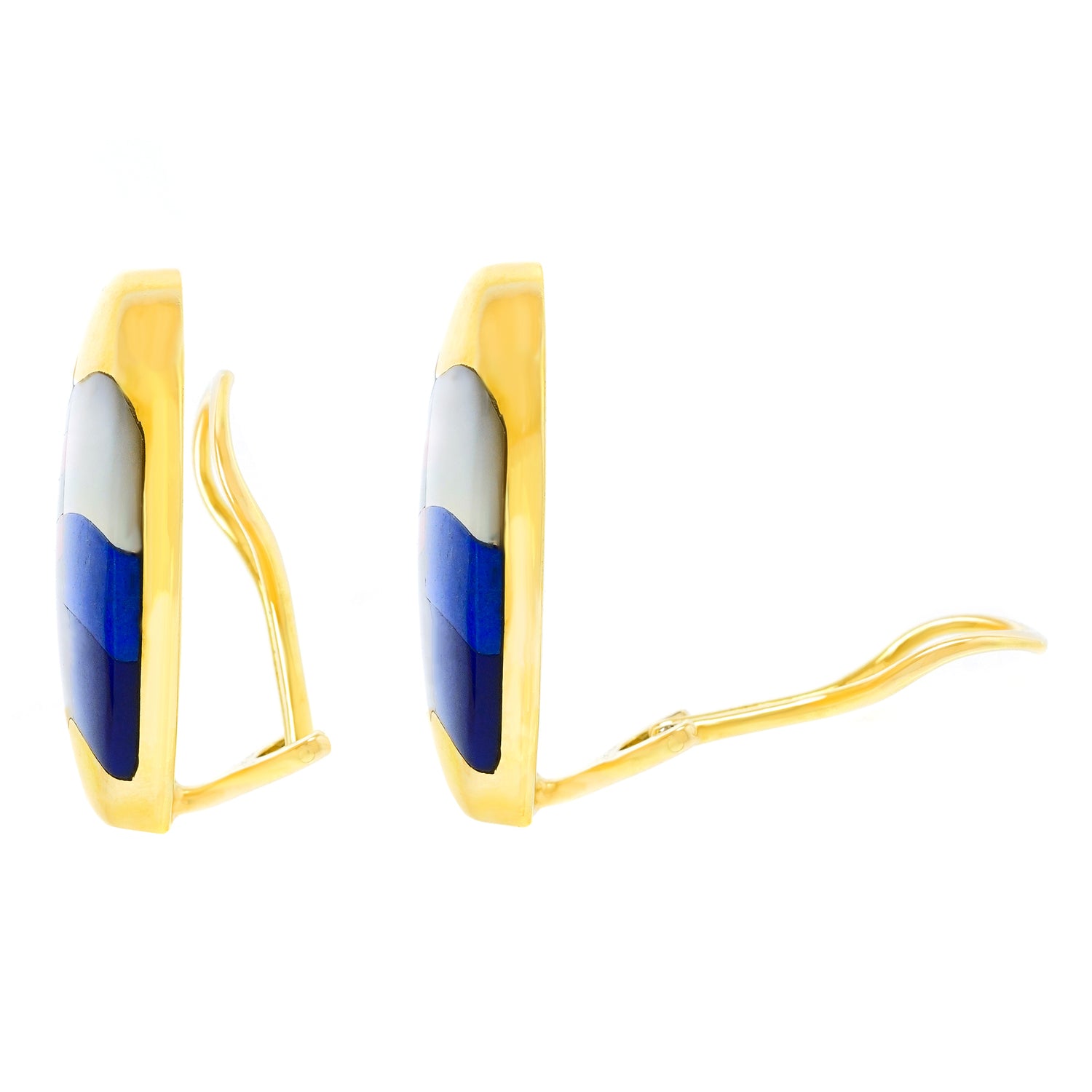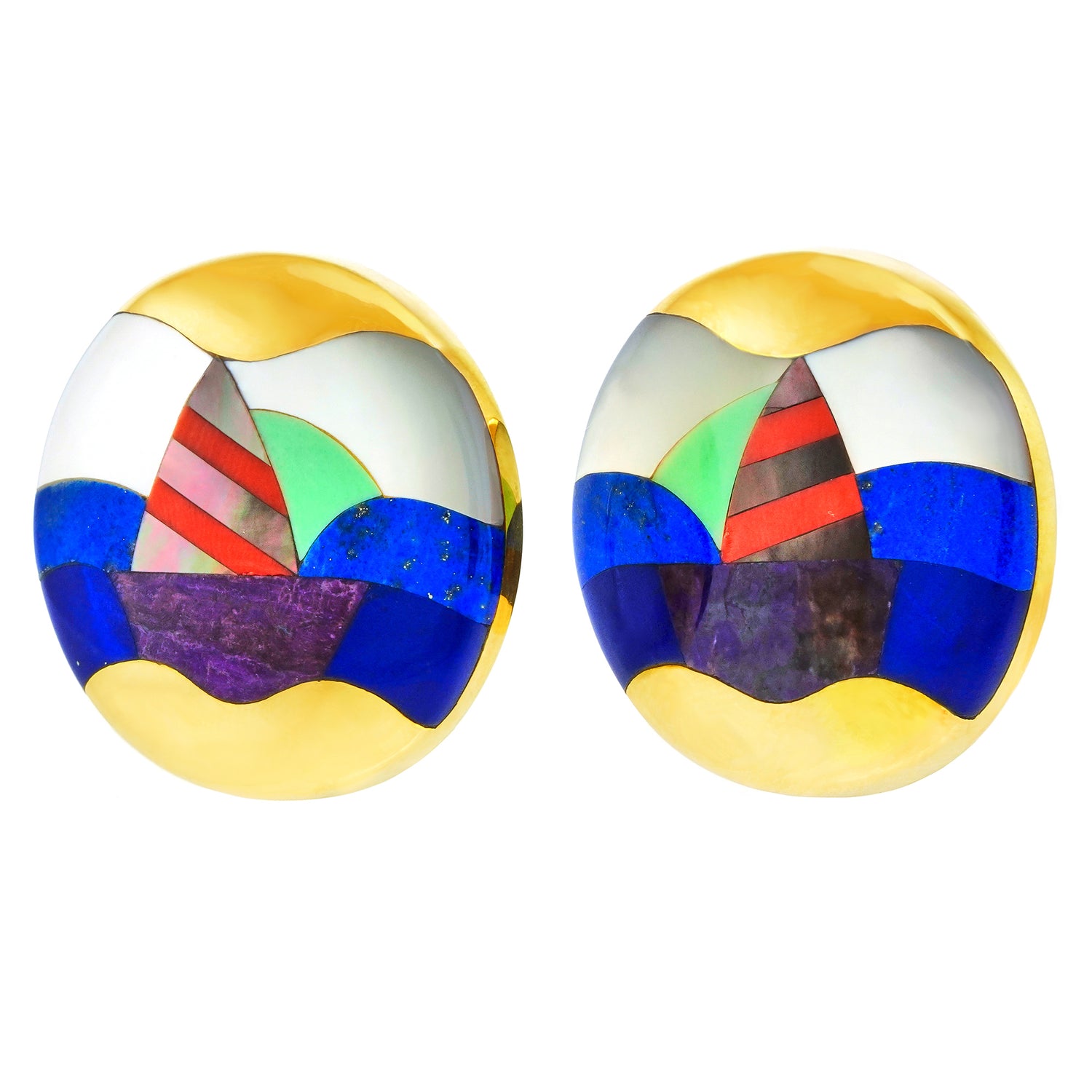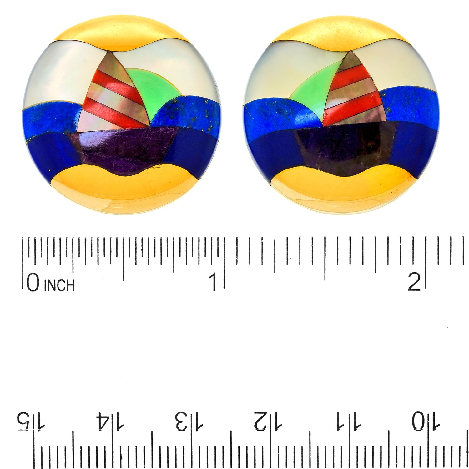 Circa 1990s, 18k, by Asch Grossbardt, American. These incredibly chic Asch Grossbardt earrings feature a surreal intarsio-set stone sailboat motif. Their graphic narrative and visual fluidity holds your gaze with a look that is splashy, colorful, and tailored! Exquisitely made in 14k yellow gold, these modern-art-to-go earrings are in excellent condition.