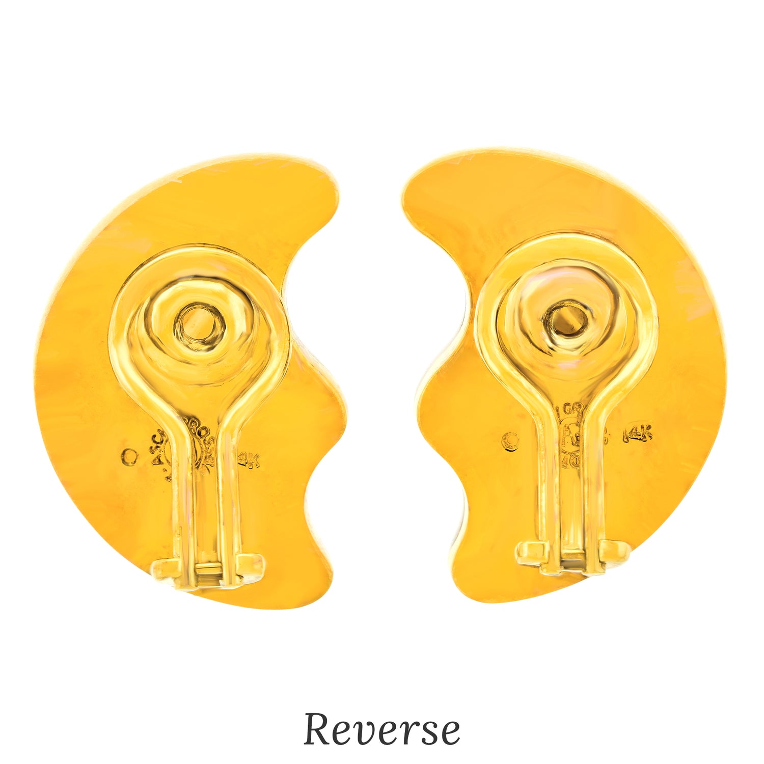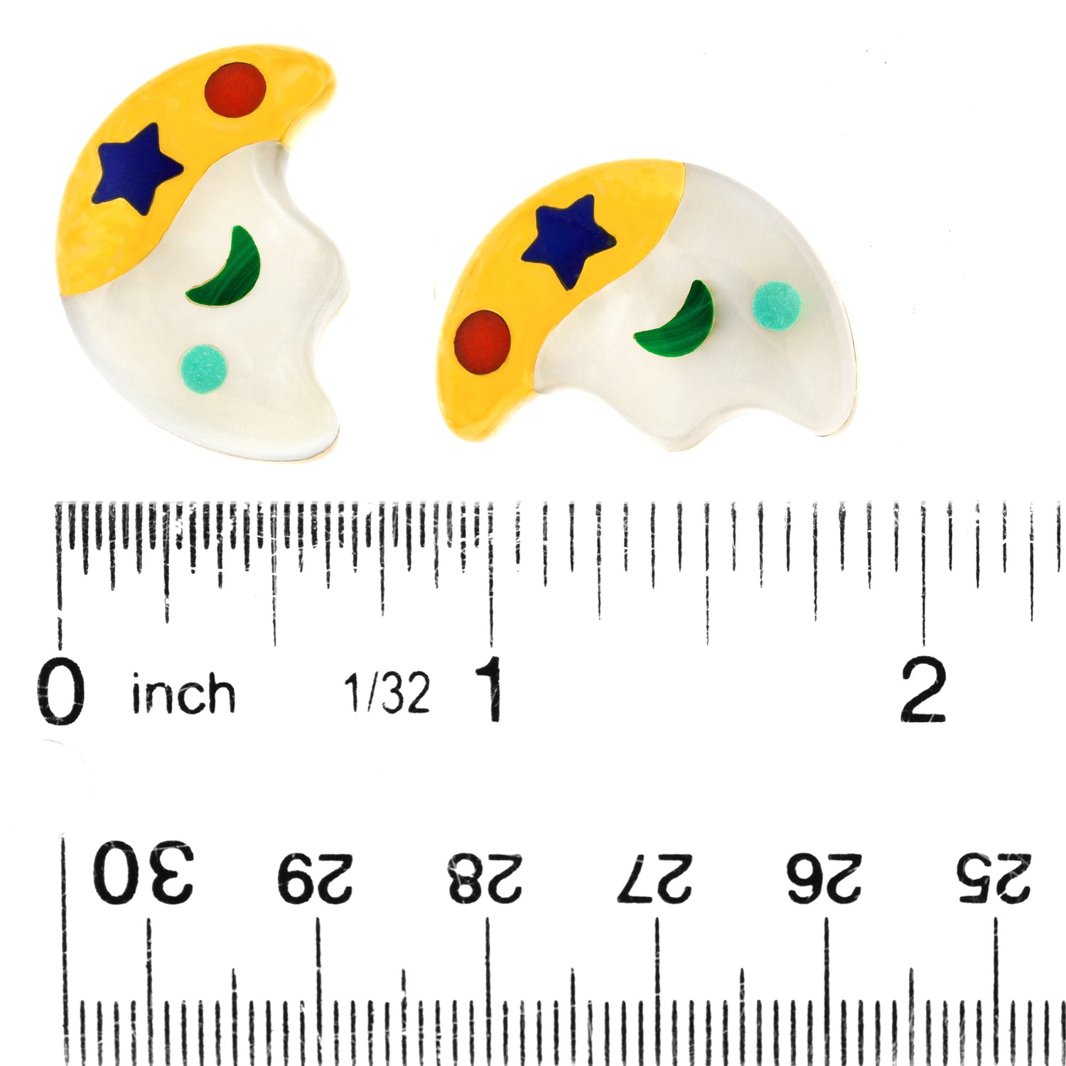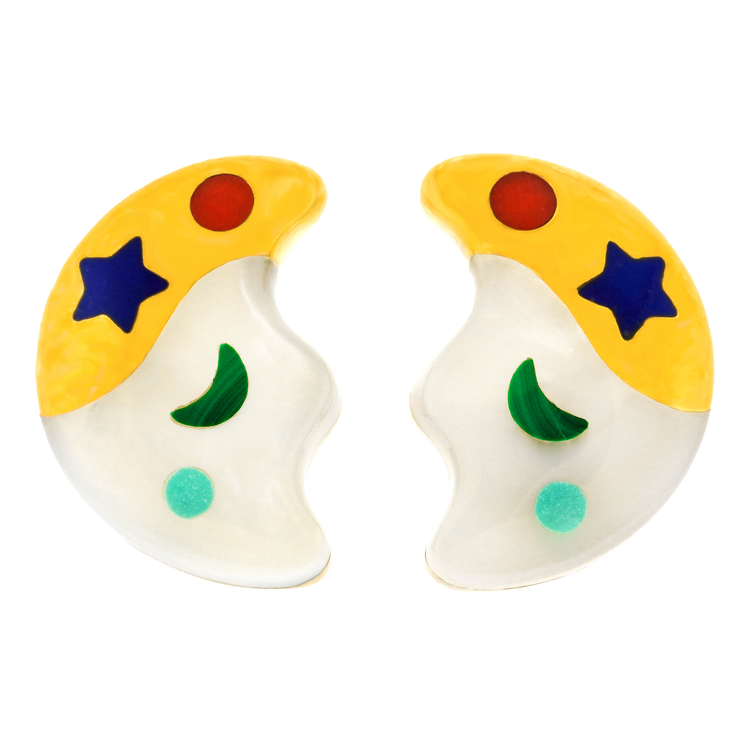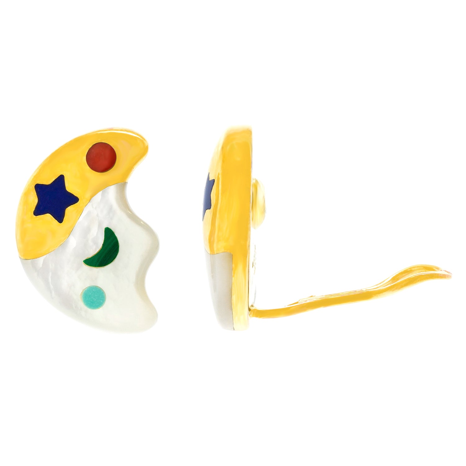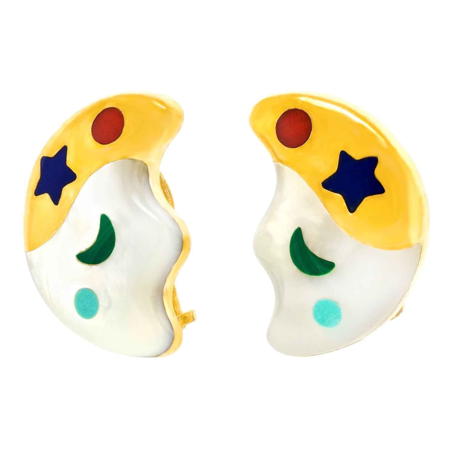 Circa 1990s, 14k, by Asch & Grossbardt, American. These incredibly chic intarsio-set earrings by Asch Grossbardt feature a surreal mother-of-pearl and gold moon and stars motif. Their graphic visual form grabs the eye, and their visual fluidity holds your gaze with a look that is splashy and tailored. Exquisitely made in 14k yellow gold, these modern-art-to-go earrings are in excellent condition.