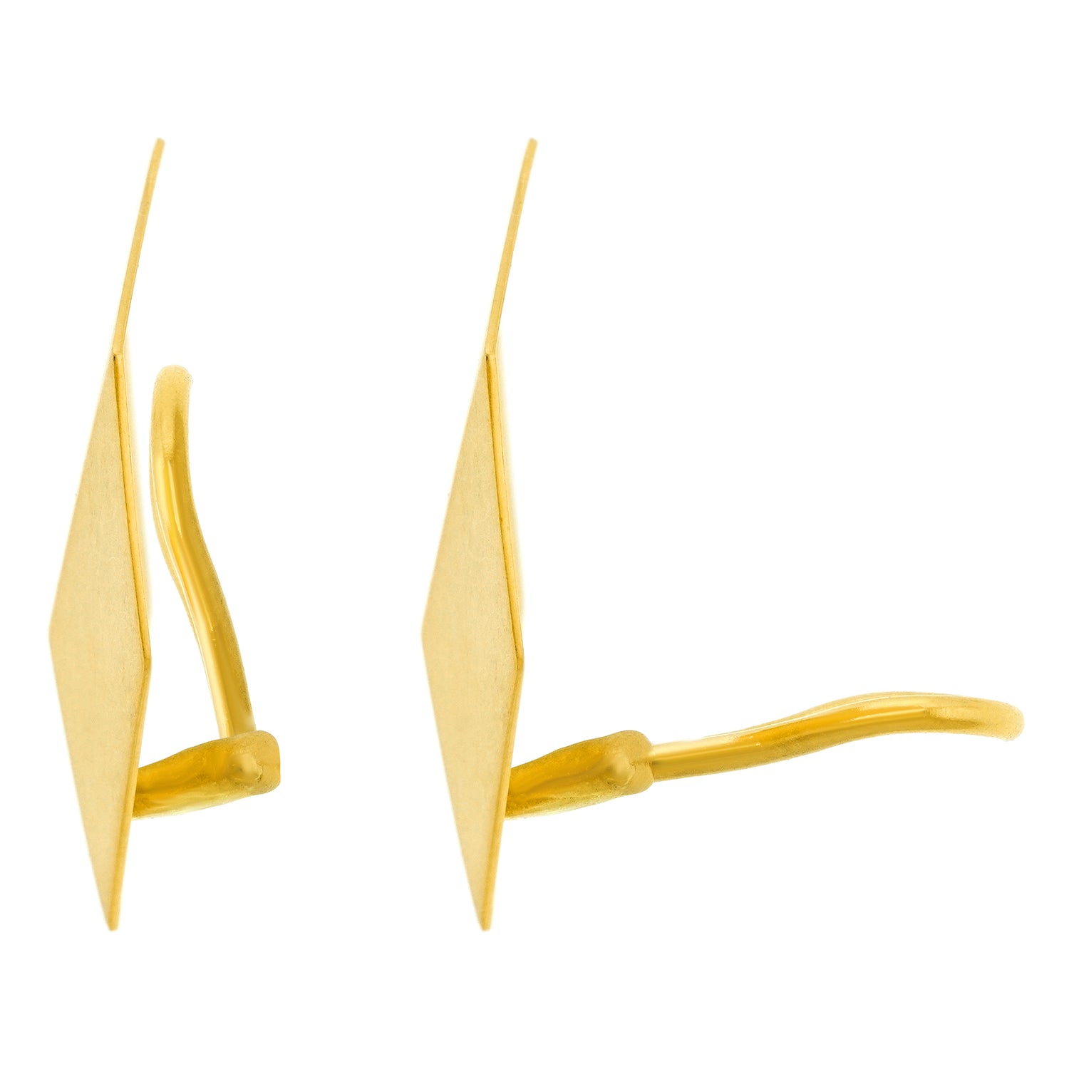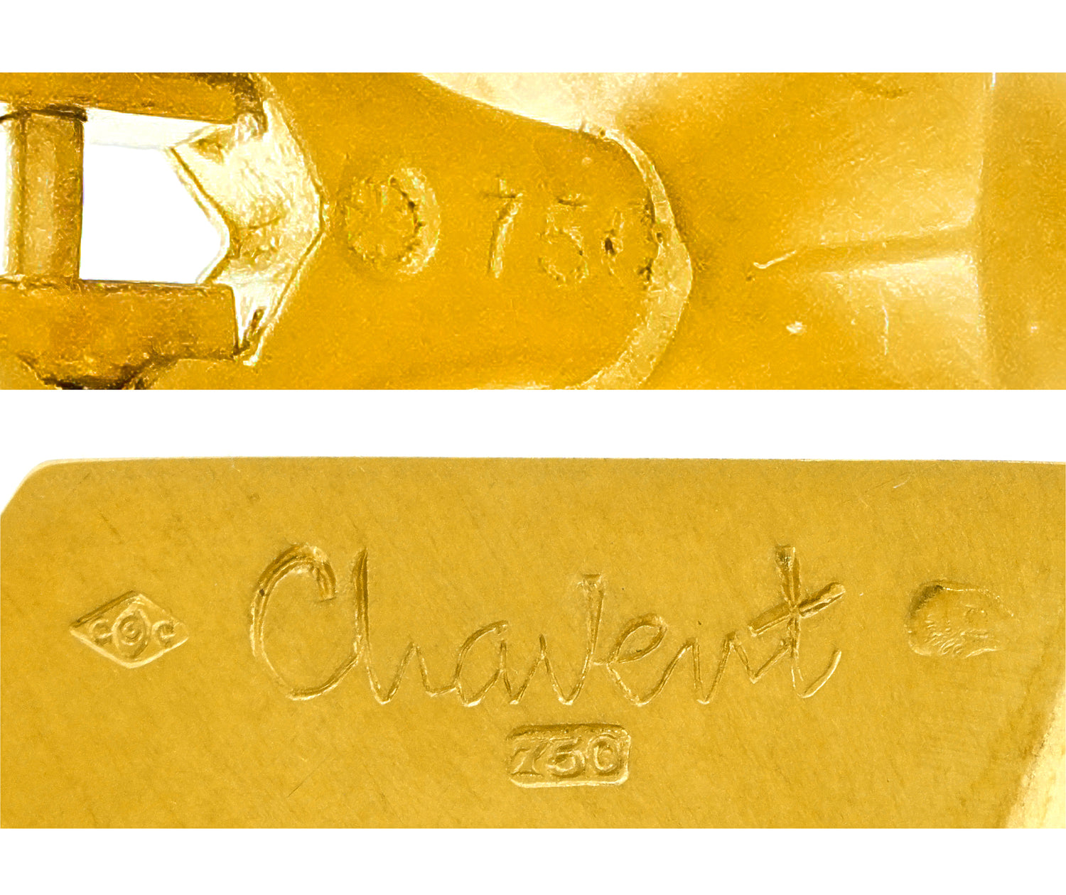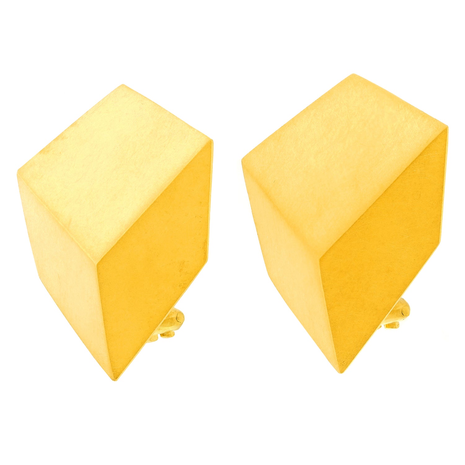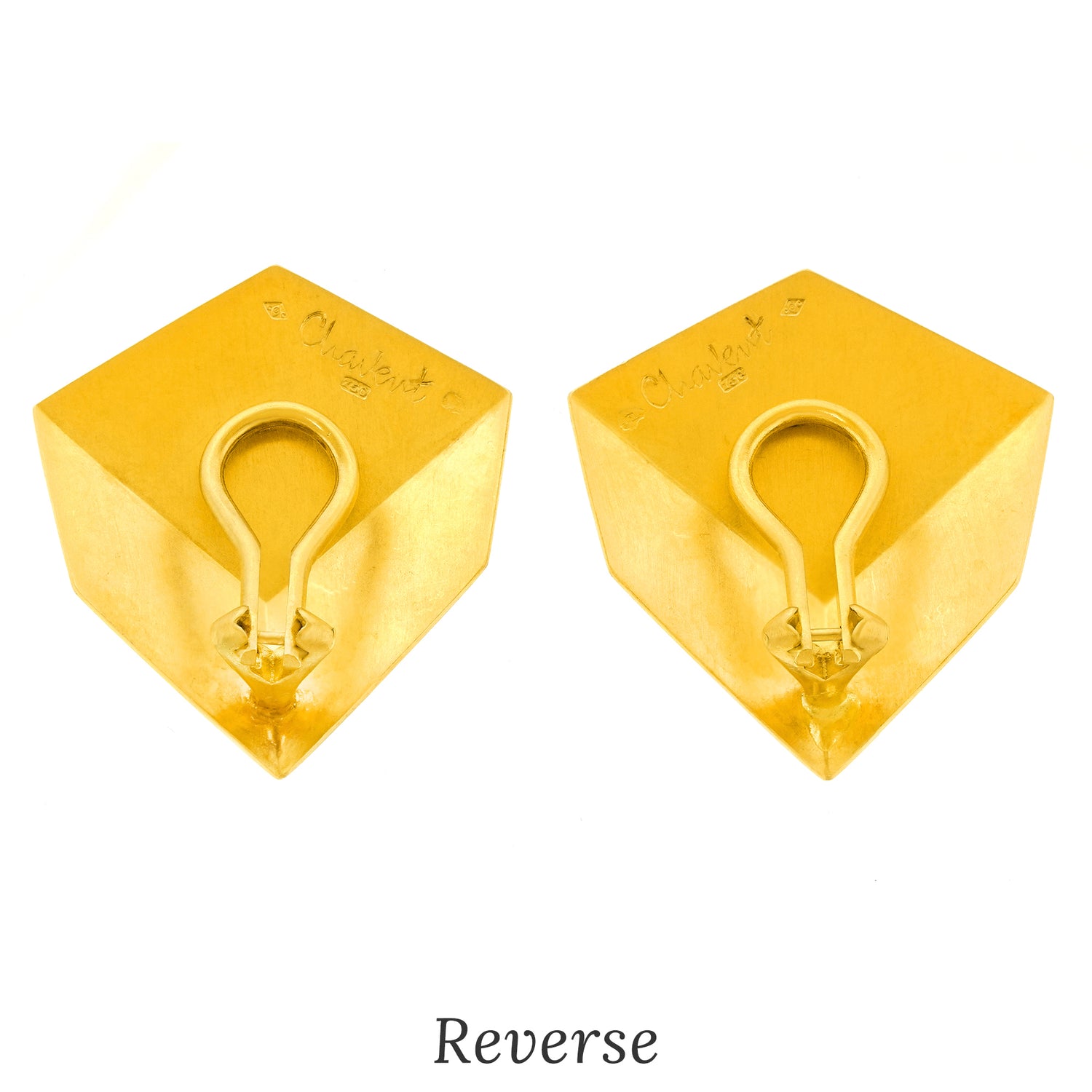 Circa 1990s, 18k, by Claude Chavent, France. These bold geometric earrings by French artist Claude Chavent (1947-2023), feature his trademark 'trompe l'oeil' motif. Titled 'Plus D'1 Tour' (More Than One Turn), they are sculpture-to-go... The look is modernism gone mad… pop art meets and makes fashion. Excellent condition.