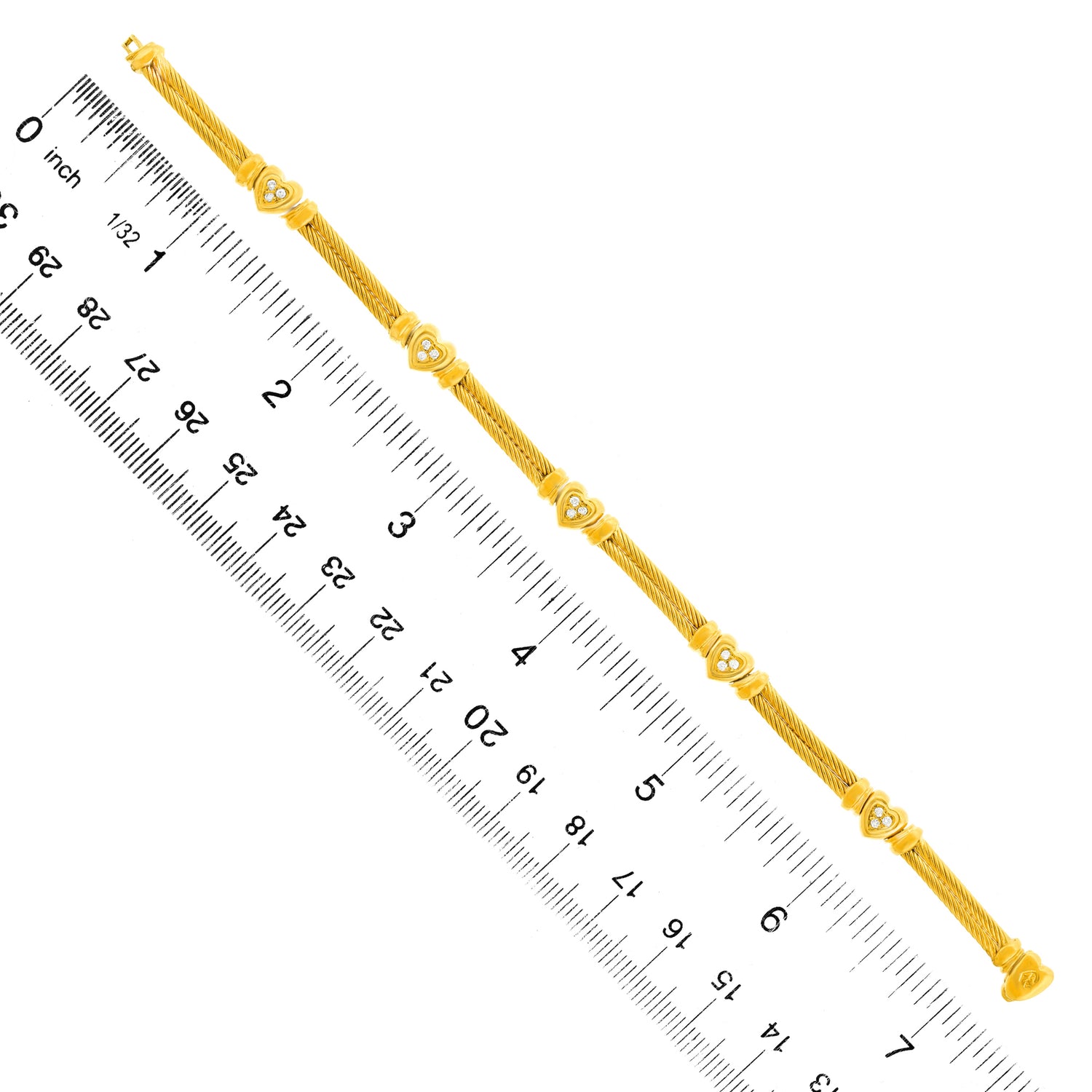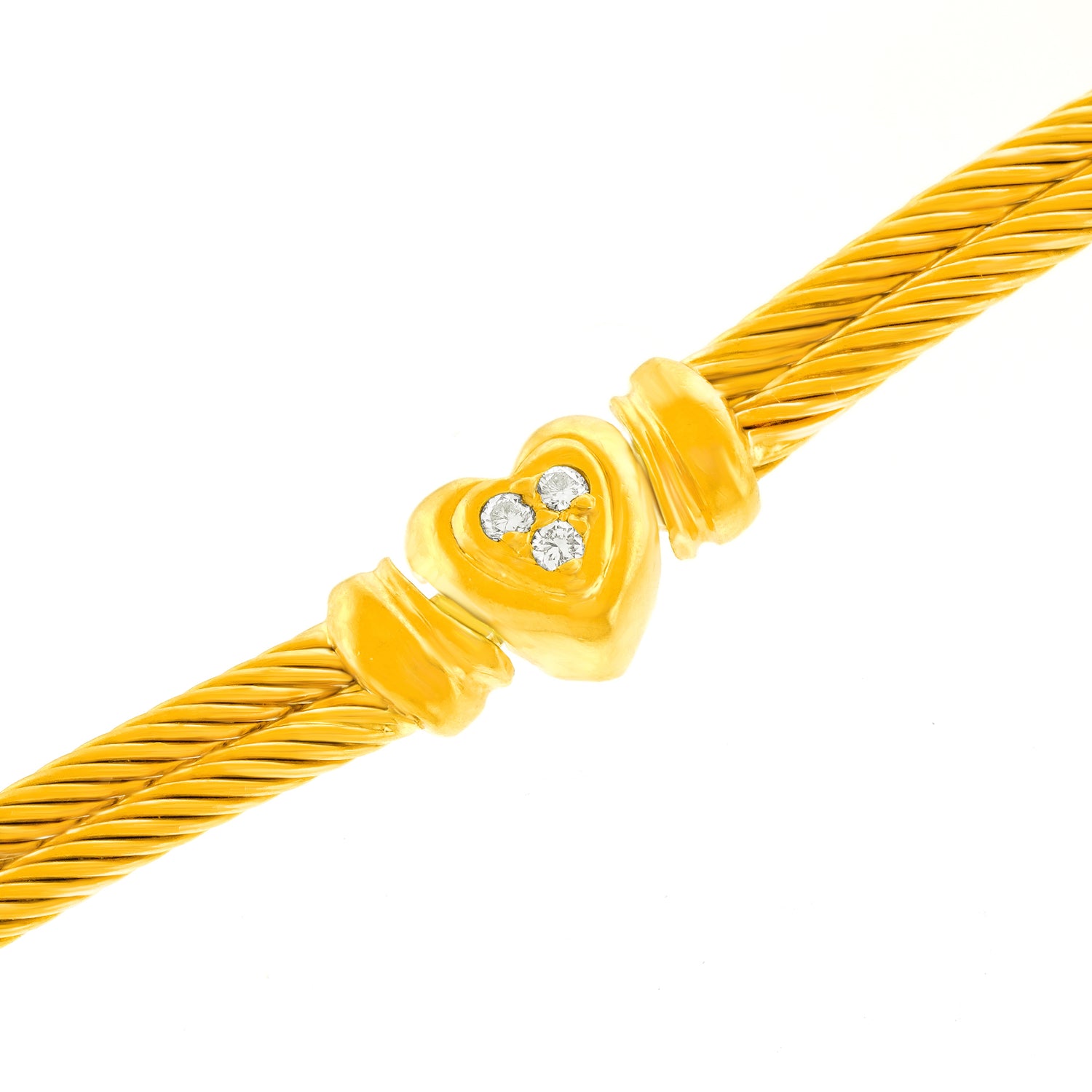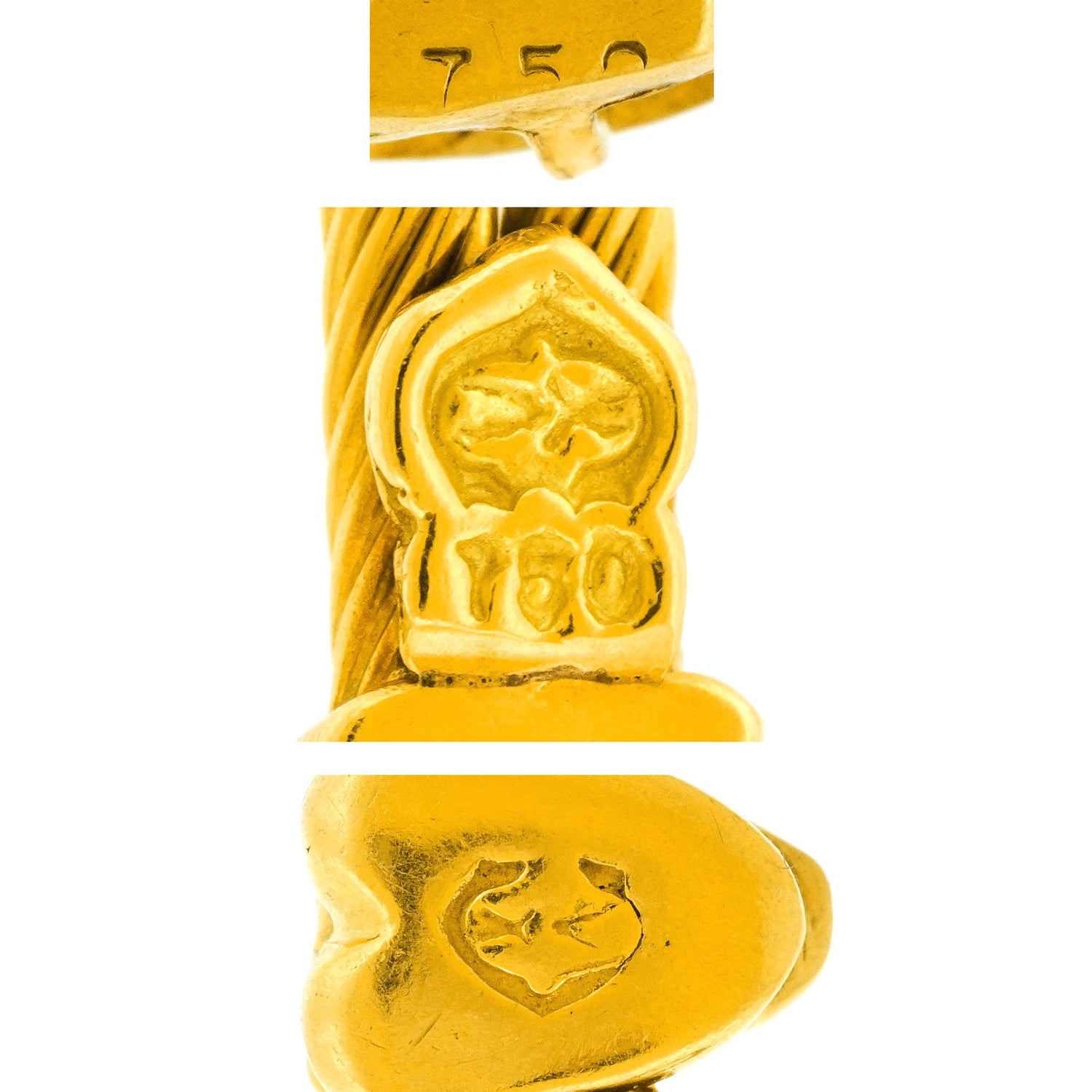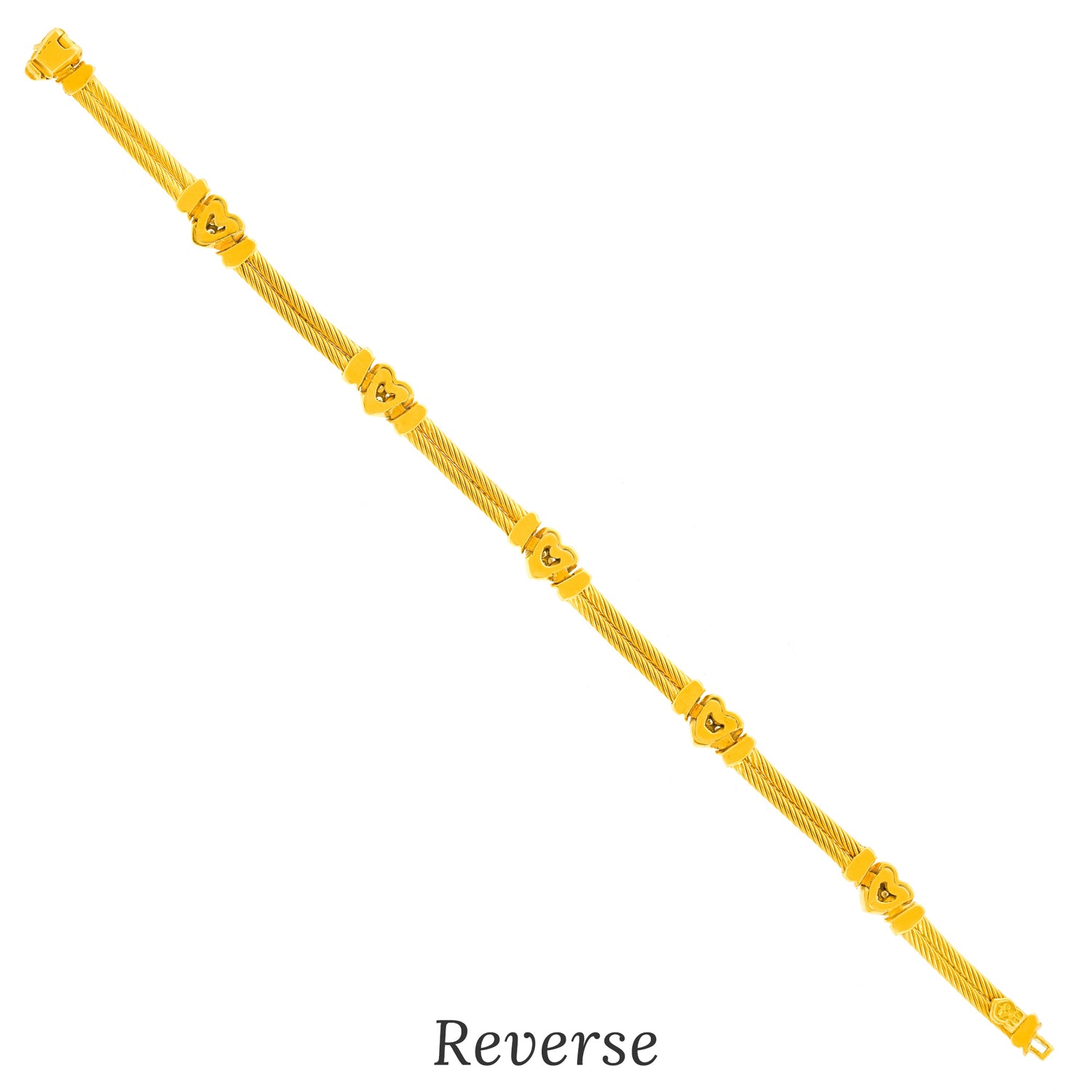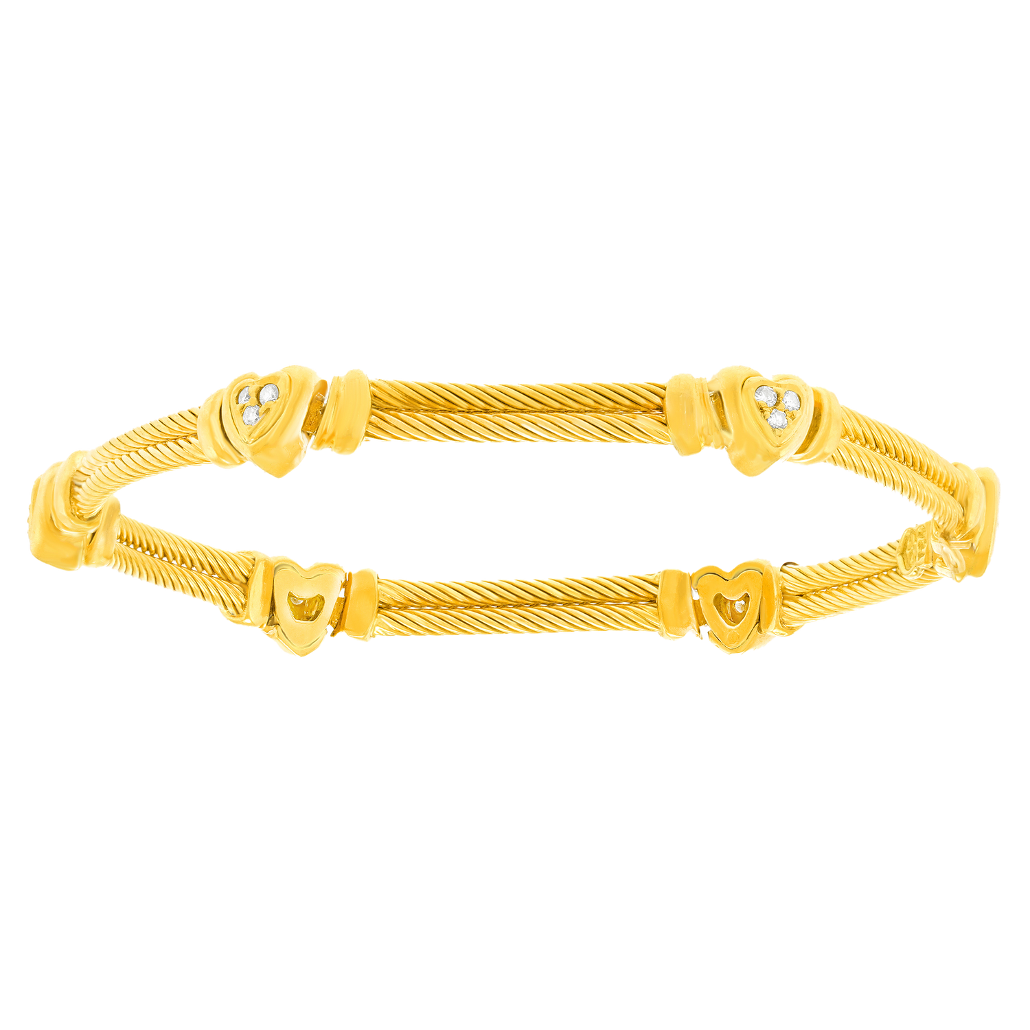 Circa 1980s, 18k, Charriol, Genève, Switzerland. This delightful Swiss bracelet features diamond-set hearts, (.25 carats of fine white diamonds G color, VS clarity). Great worn alone, fabulous mixed with a watch, and perfect with other bracelets. Finely made to the highest Swiss standards, this bracelet is heavy and in excellent condition.