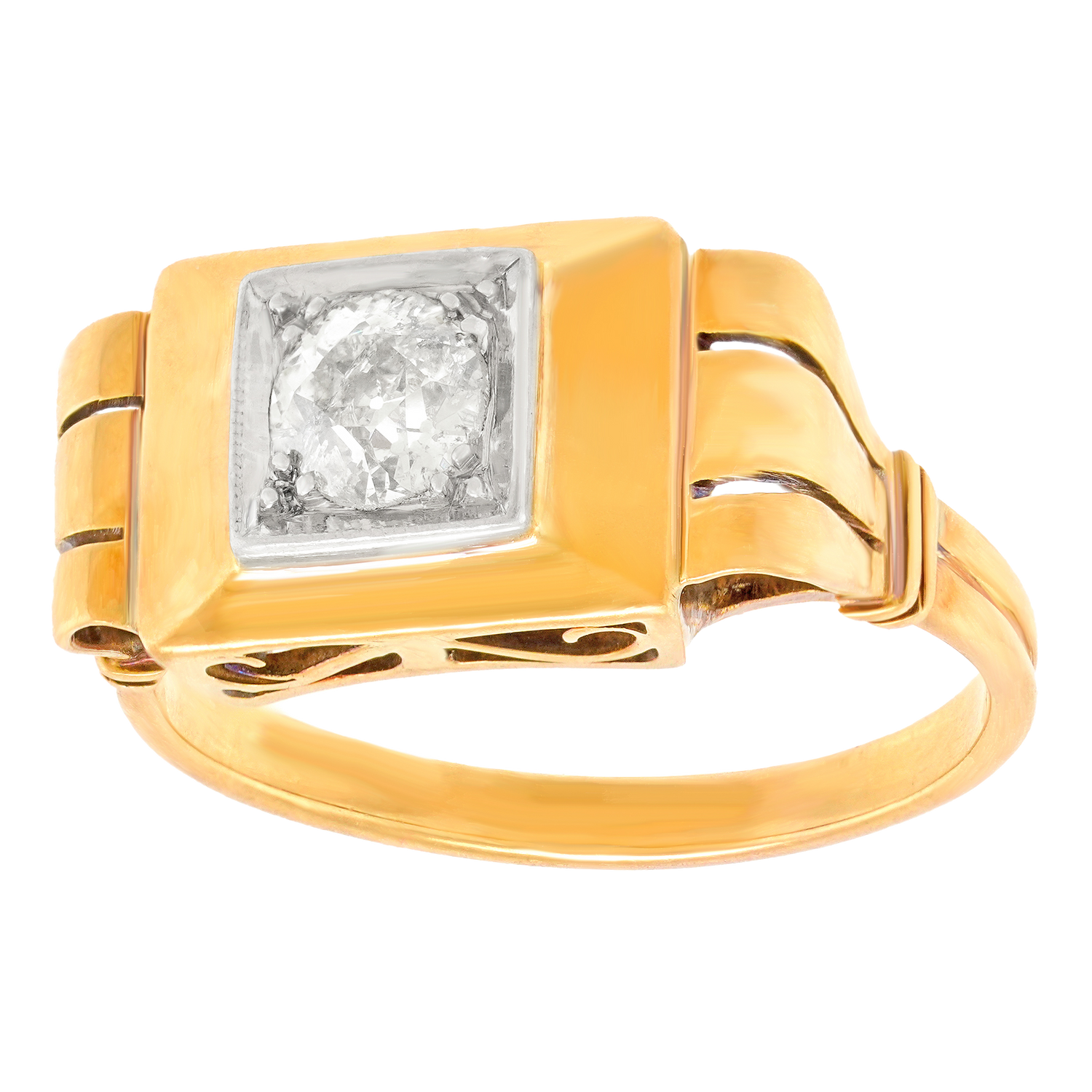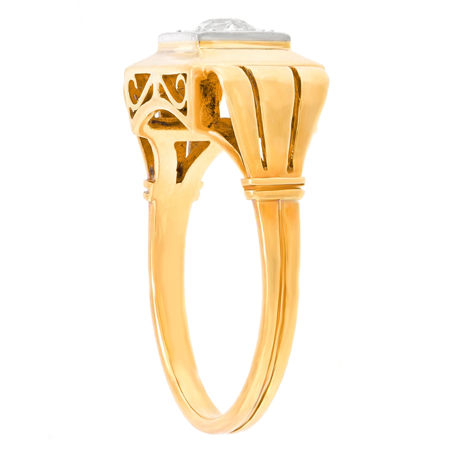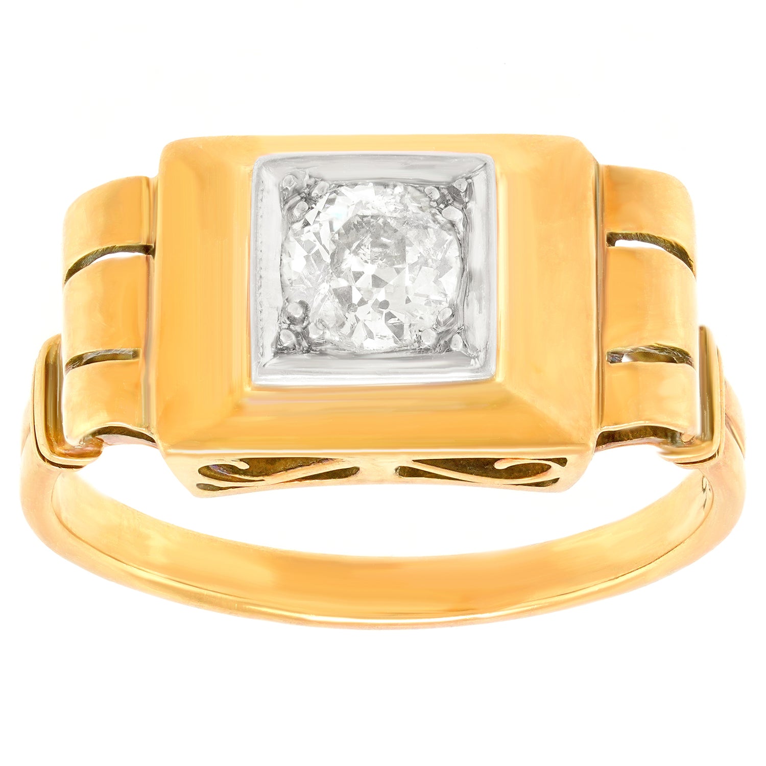 Circa 1930s, 14k. This delightful thirties ring features the sophisticated geometry that was the cornerstone of Art Deco design. With stylistic notes of the emerging Retro look, it features a brilliant half-carat diamond at its visual center. Very well made, this period ring is in excellent condition.
