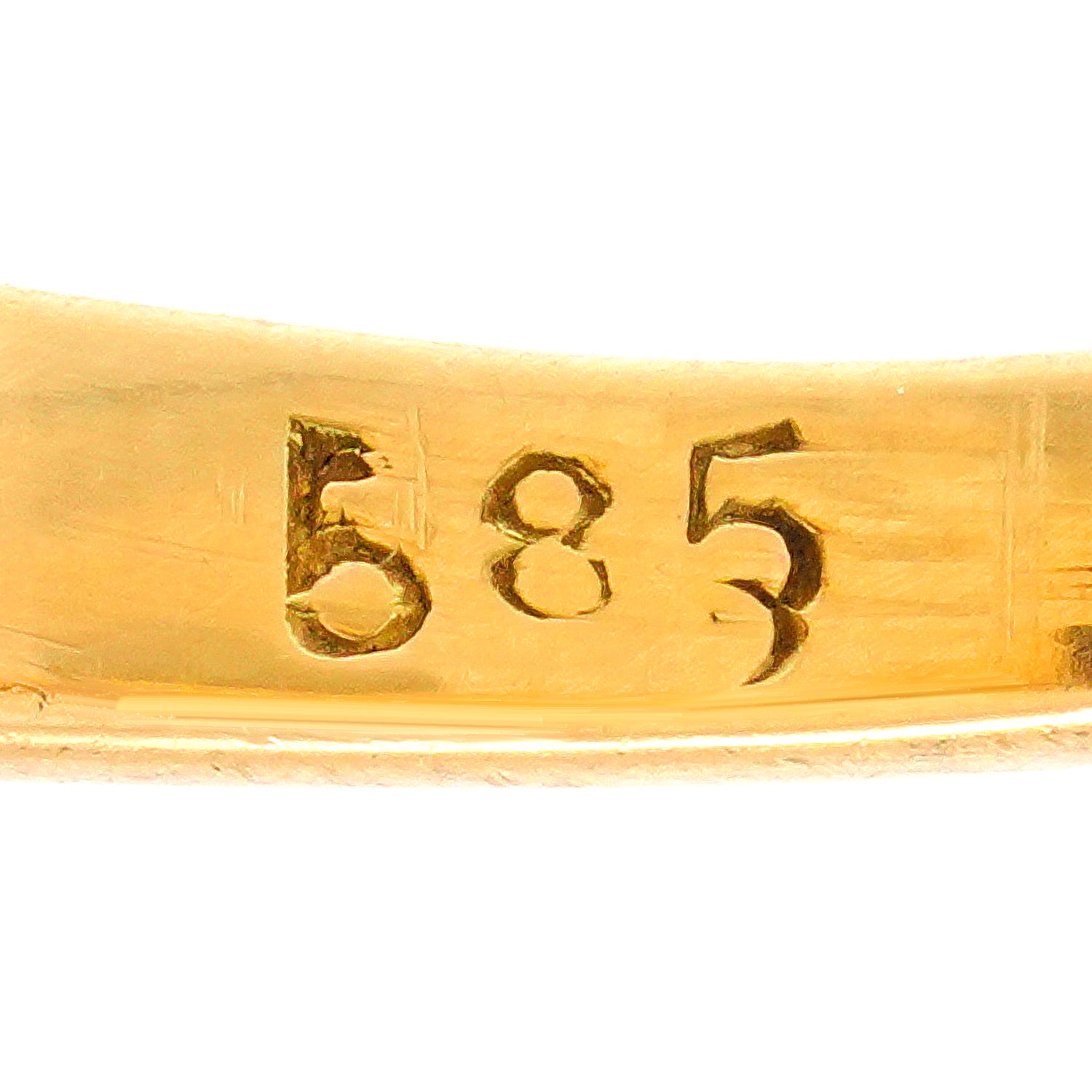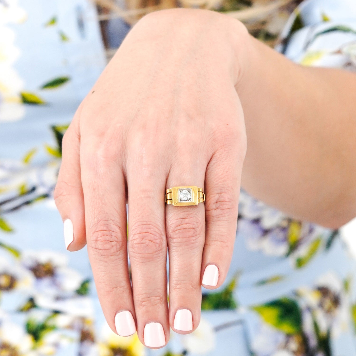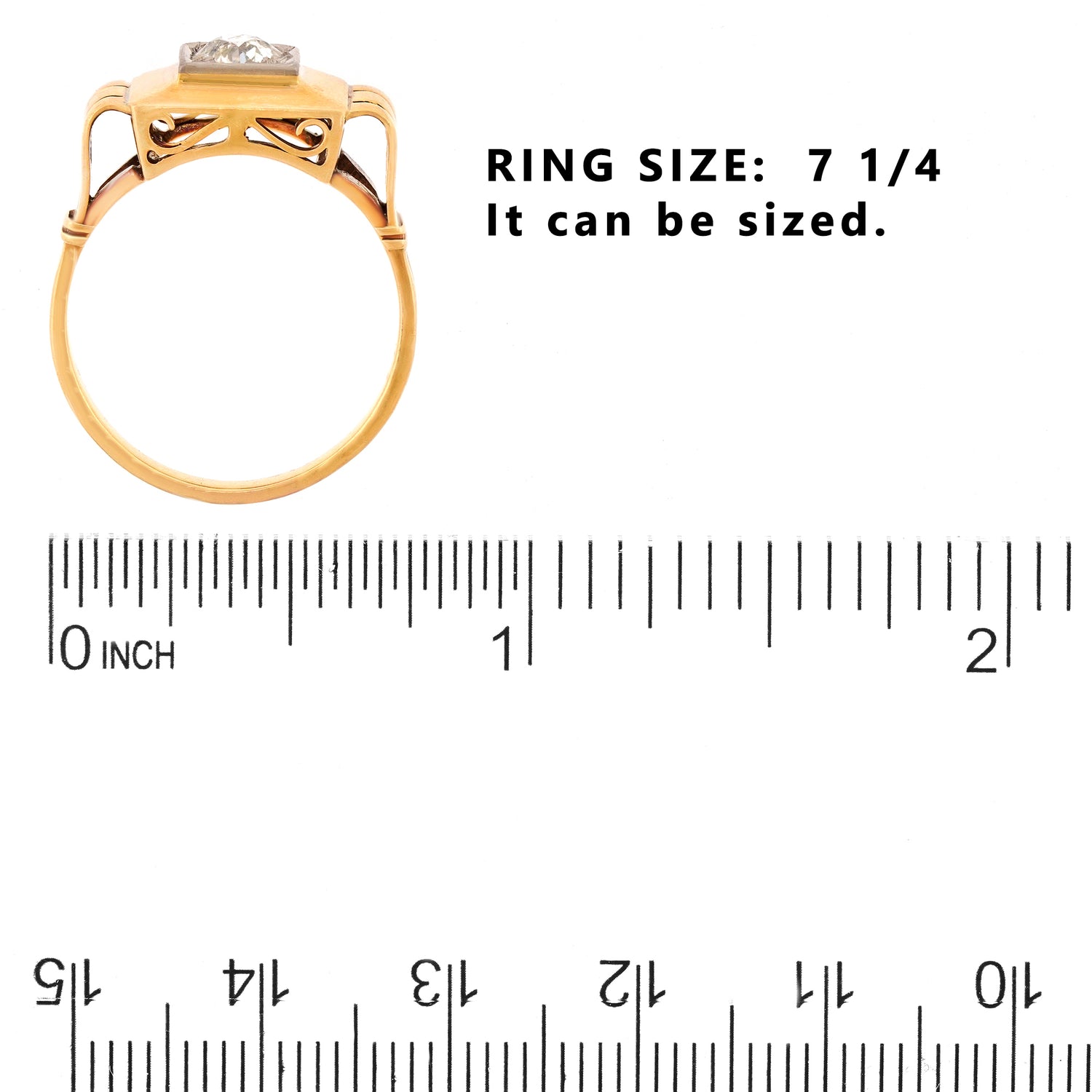 Circa 1930s, 14k. This delightful thirties ring features the sophisticated geometry that was the cornerstone of Art Deco design. With stylistic notes of the emerging Retro look, it features a brilliant half-carat diamond at its visual center. Very well made, this period ring is in excellent condition.