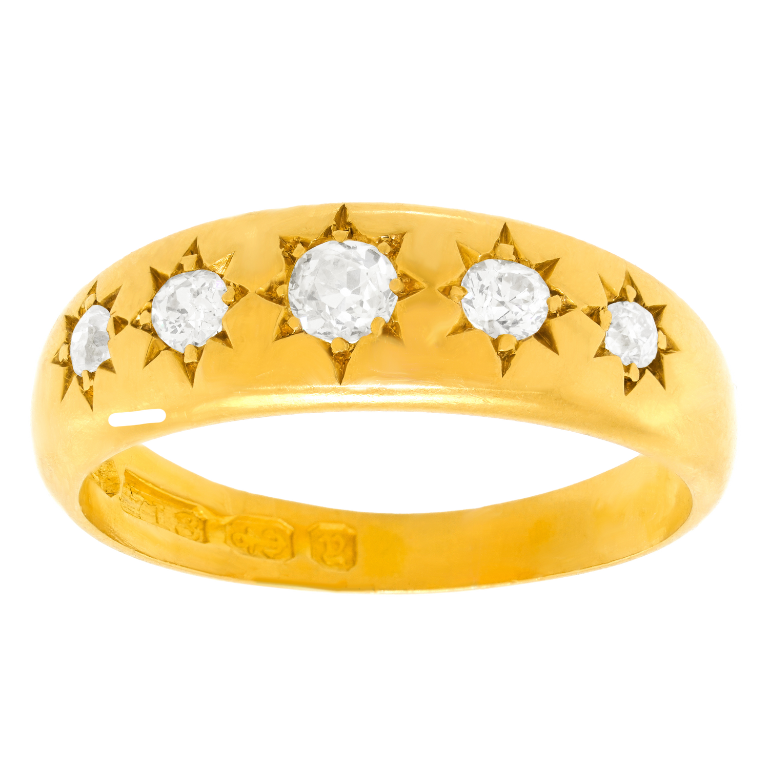 Circa 1898, 18k, Birmingham, England. Bright and cheerful, the diamonds in this ring are sparkly white (H color, and SI1 clarity) brilliantly contrasting with the rich 18k gold. Perfect on its own or delightful in a stack of rings, the look is vintage chic all the way! Excellent condition.