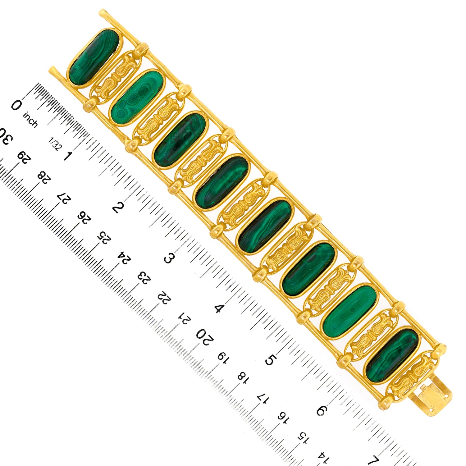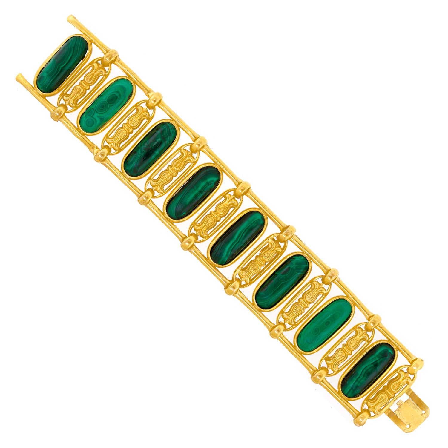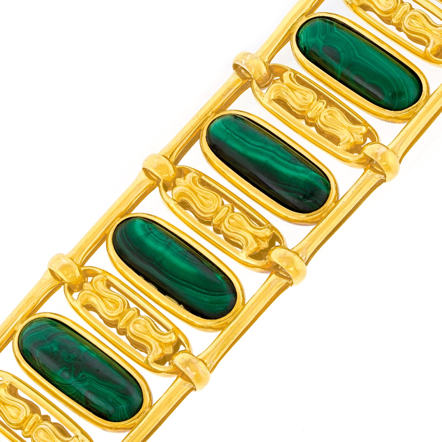 Circa 1890s, 14k, American. This superb 14k yellow gold Egyptian Revival bracelet features cabochon malachite stones suggestive of scarabs, interspersed with lotus forms. Sophisticated enough for any moment of fashion and important enough for any museum, this bracelet will become part of your signature style. Beautiful on a queen and magical enough for a priestess. Excellent condition.