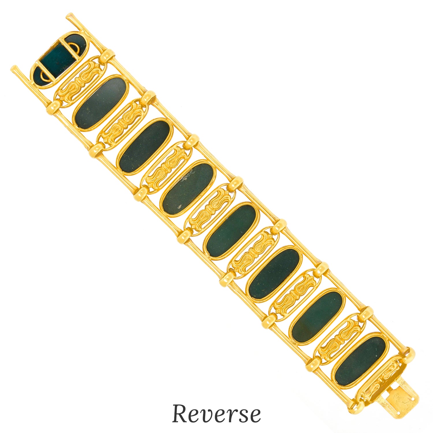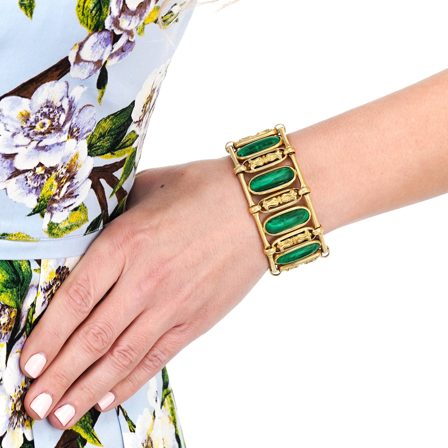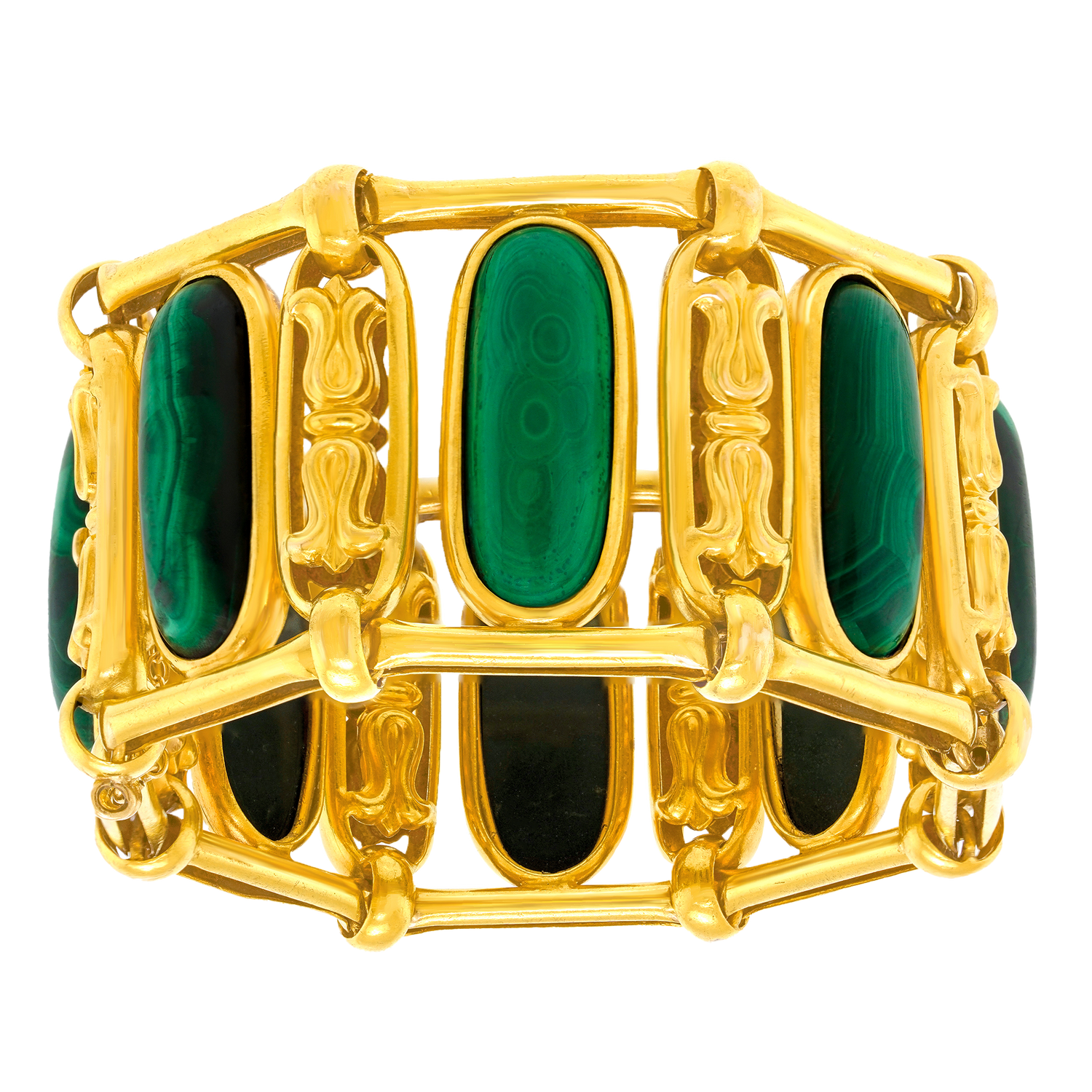 Circa 1890s, 14k, American. This superb 14k yellow gold Egyptian Revival bracelet features cabochon malachite stones suggestive of scarabs, interspersed with lotus forms. Sophisticated enough for any moment of fashion and important enough for any museum, this bracelet will become part of your signature style. Beautiful on a queen and magical enough for a priestess. Excellent condition.